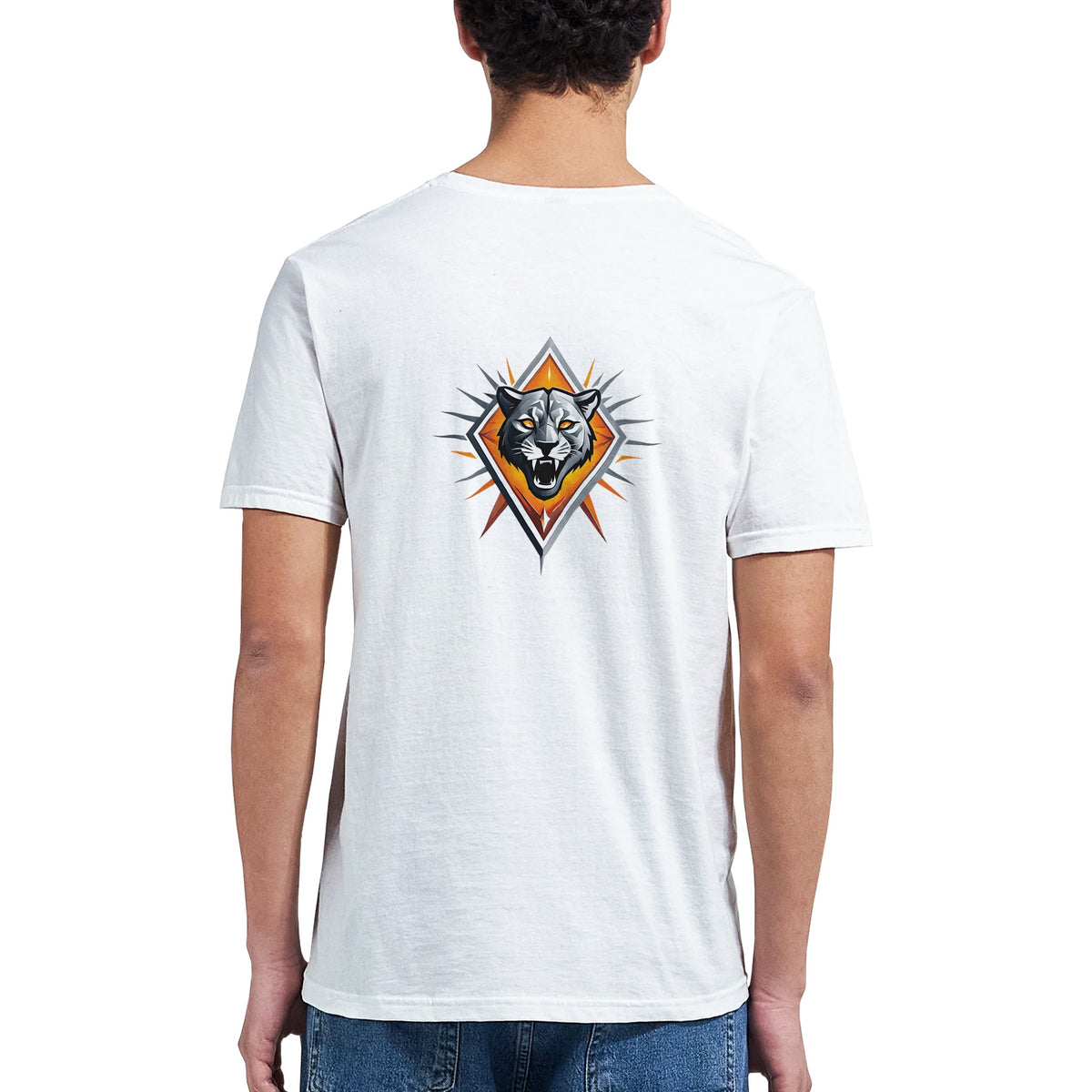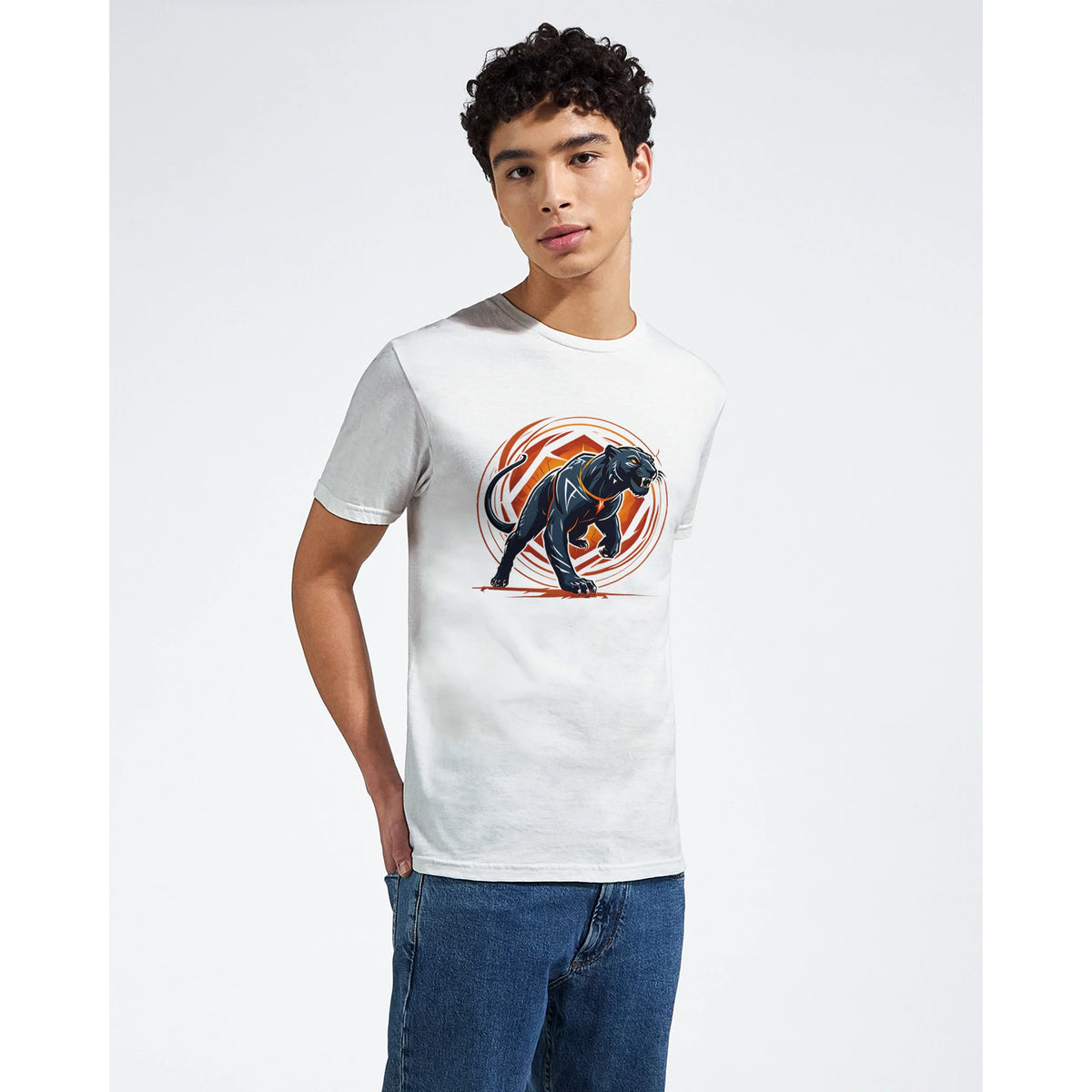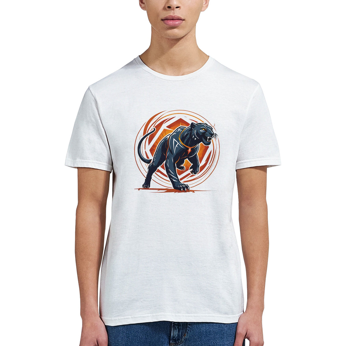 A predator in motion, the black panther lunges forward with claws bared and eyes burning gold. Muscles coil with raw strength, framed by arcs of orange and white geometry that radiate its power in perfect symmetry. Against the clean white canvas of the tee, every detail strikes sharper — the embodiment of speed, ferocity, and untamed dominance.