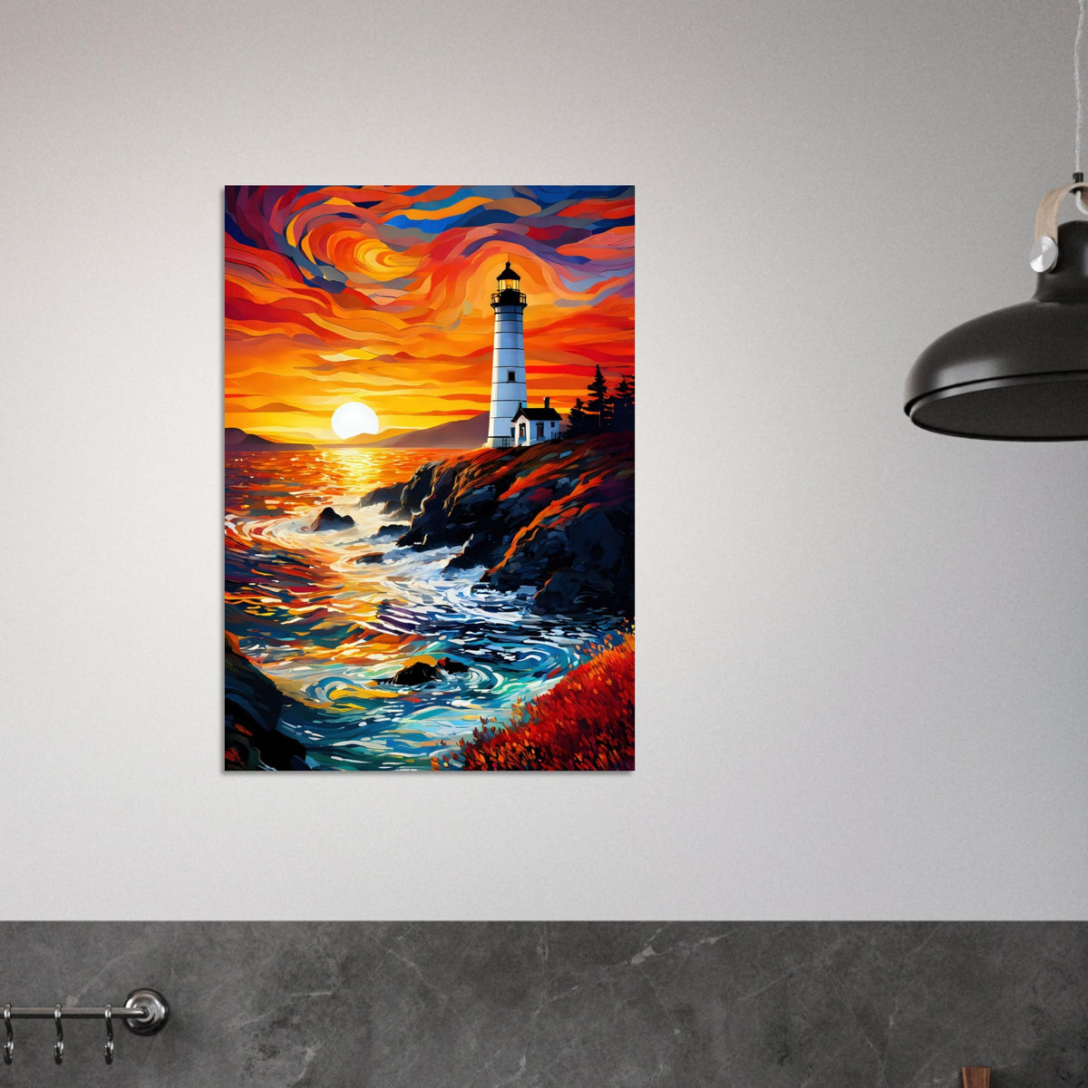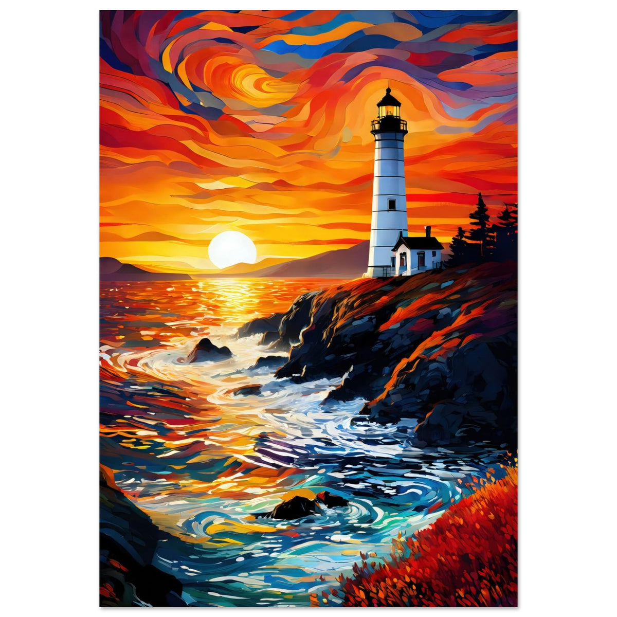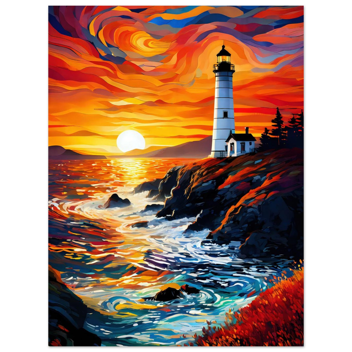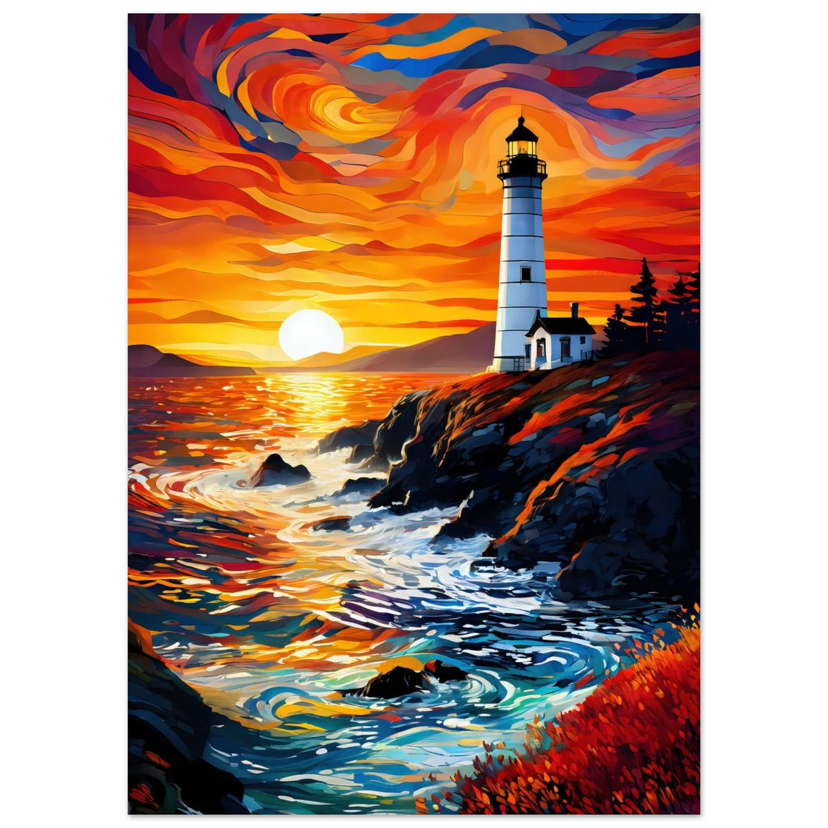 Perched atop a rugged cliff, a lone lighthouse stands sentinel as the sun sinks into a swirling ocean of color. The sky ignites in waves of orange, crimson, and violet, casting molten reflections across the water and illuminating the pine-framed keeper’s house in a warm, fading glow. Below, waves crash against the rocks with quiet persistence, while the foreground blooms with rust-toned vegetation that softens the edge of the wild. Beacon at Duskfall captures the tension between solitude and power — a coastal moment where nature’s fury meets its most serene farewell.