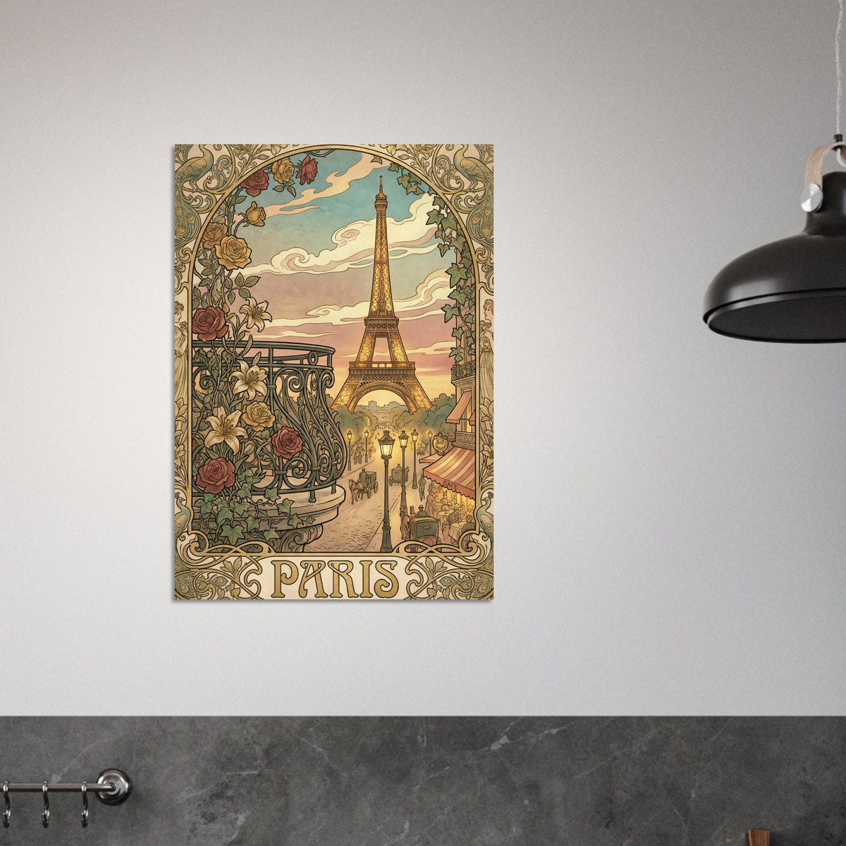 This piece feels like a city remembering itself at its most graceful. Paris unfolds in warm light and quiet detail, where ironwork curves like handwriting and the streets move at a gentler pace. The tower rises not as a monument, but as a promise — part of the everyday rhythm rather than something to be stared at.