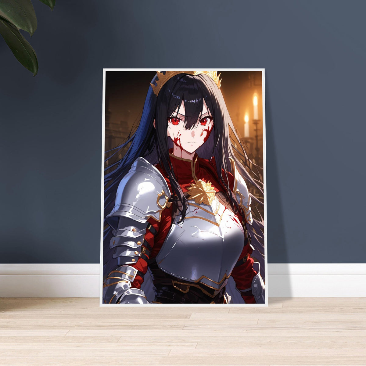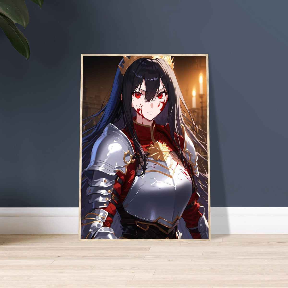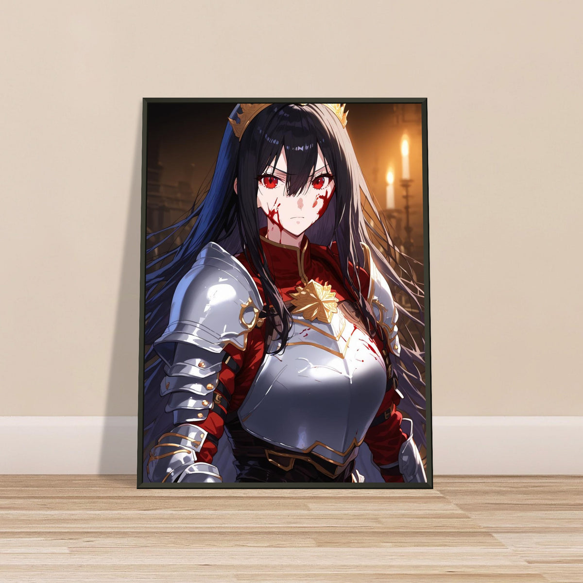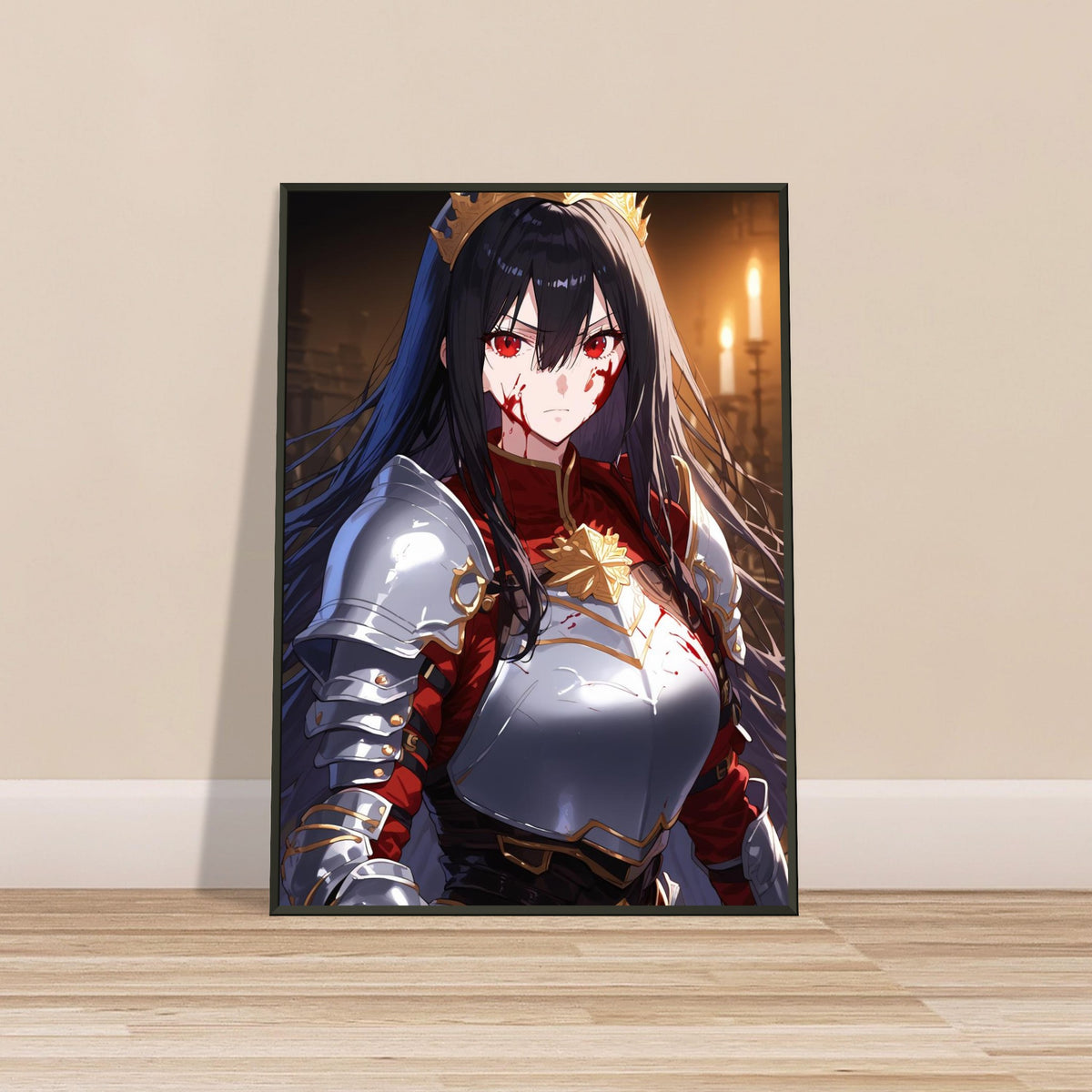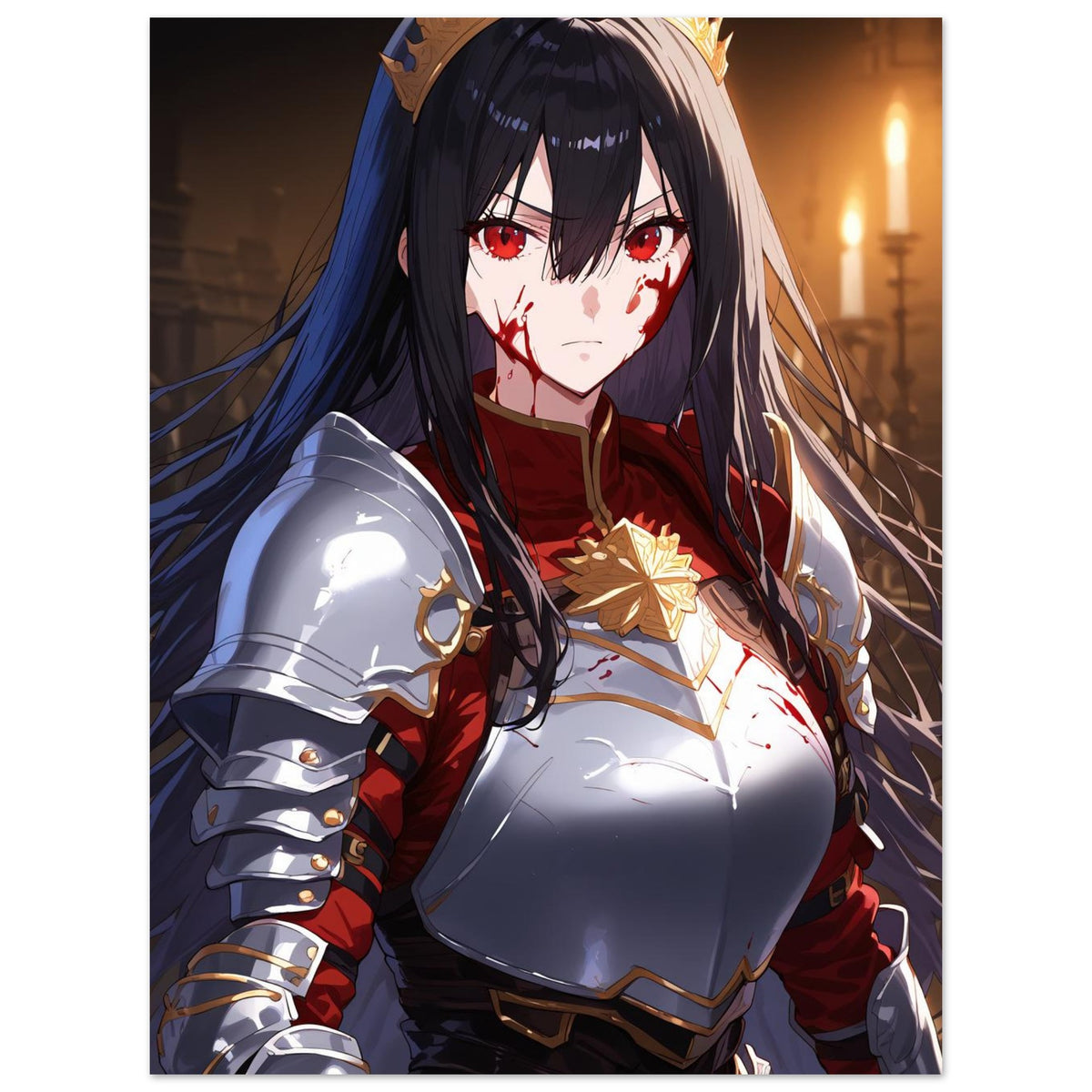Beneath the flicker of candlelight, a crowned warrior stands unyielding in silver and crimson armor, the gold of her coronet gleaming against the soot and blood of battle. Her gaze is sharp, unwavering, and heavy with the burden of rule. The hall behind her, lined with gothic arches, breathes of ancient power and oaths unbroken. Crowned in Ash is a portrait of elegance forged in fire — a ruler who wears both victory and ruin upon her brow.