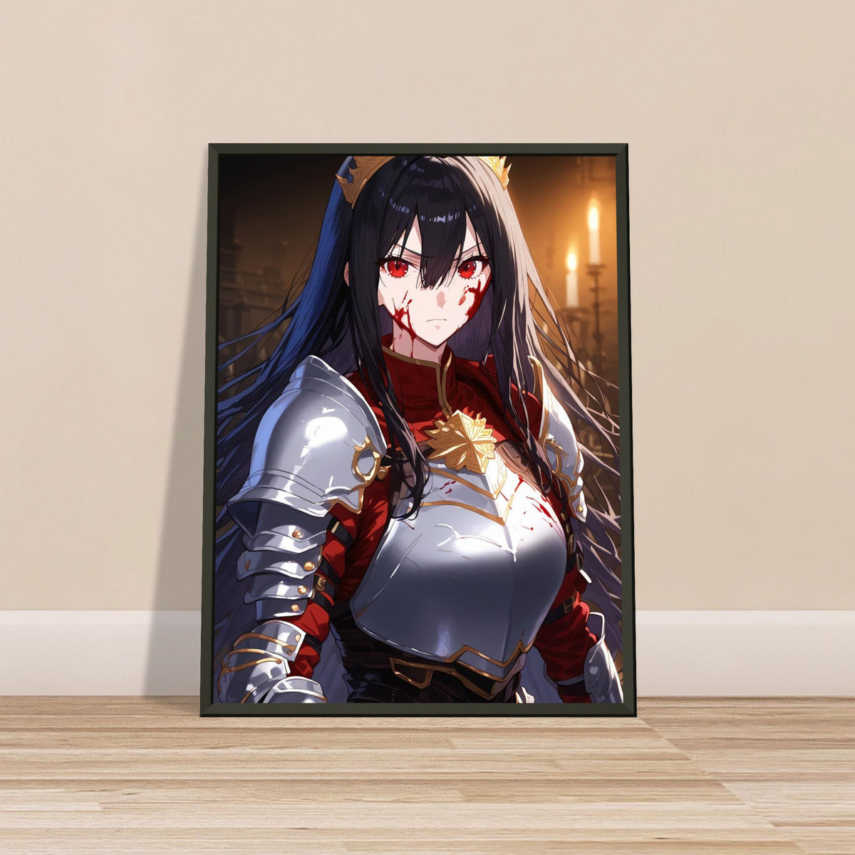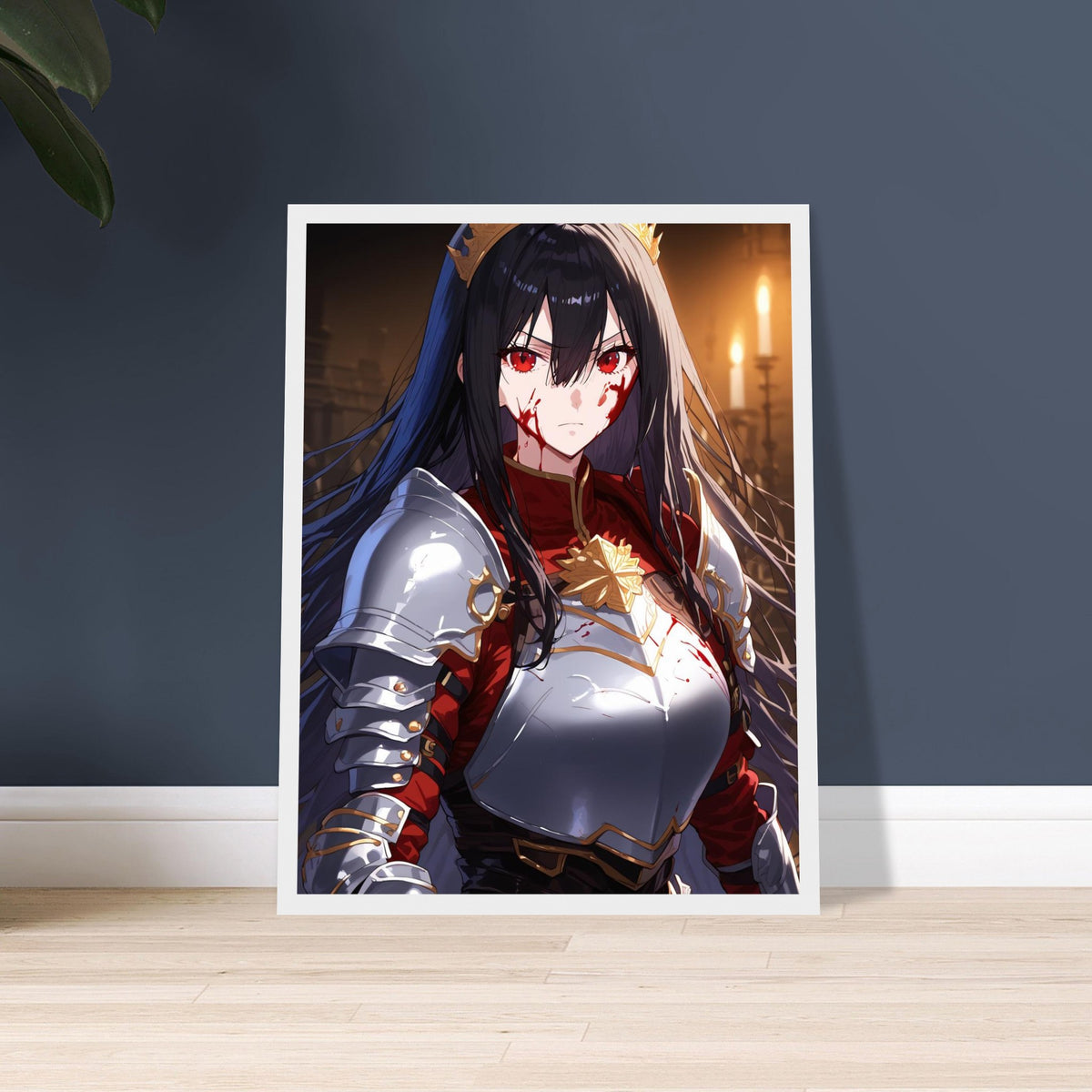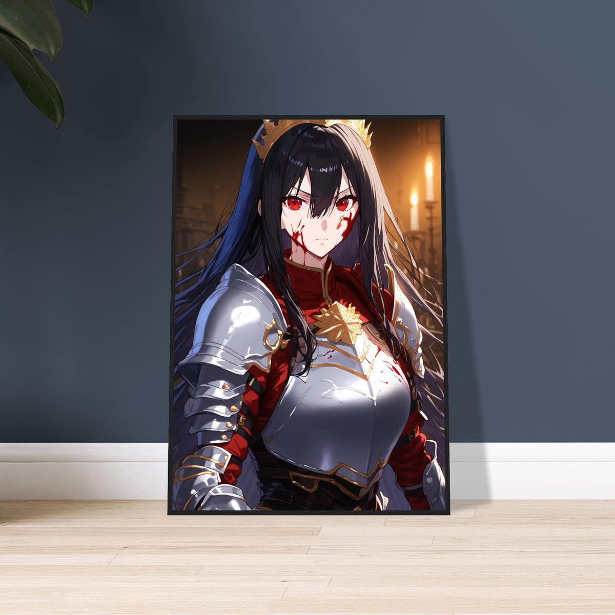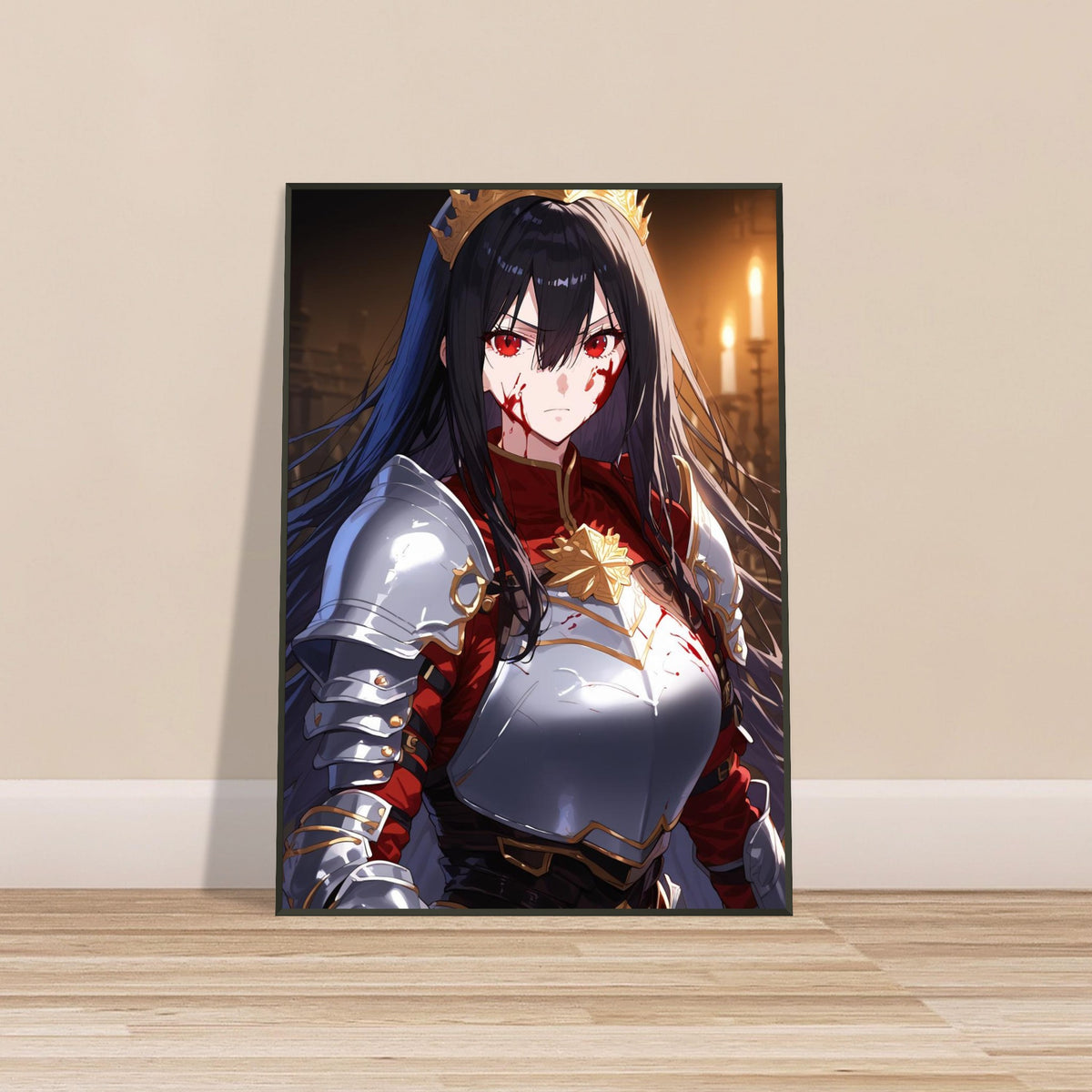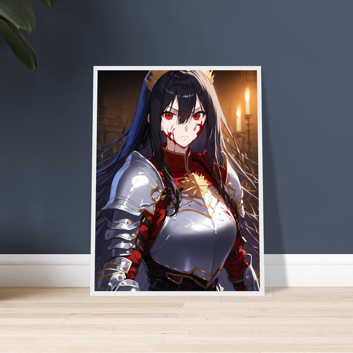 Beneath the flicker of candlelight, a crowned warrior stands unyielding in silver and crimson armor, the gold of her coronet gleaming against the soot and blood of battle. Her gaze is sharp, unwavering, and heavy with the burden of rule. The hall behind her, lined with gothic arches, breathes of ancient power and oaths unbroken. Crowned in Ash is a portrait of elegance forged in fire — a ruler who wears both victory and ruin upon her brow.