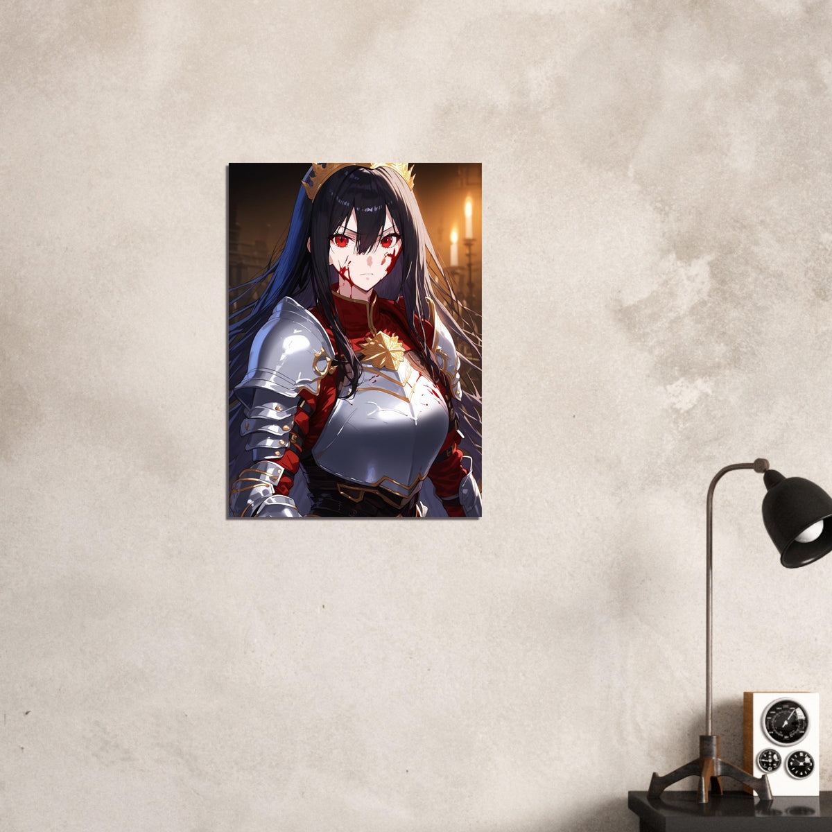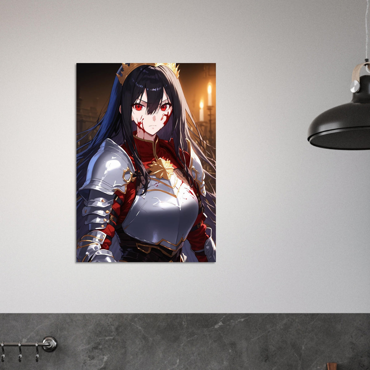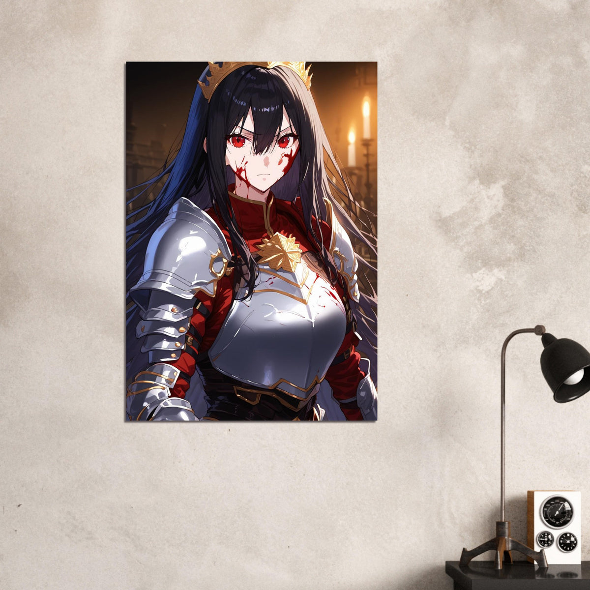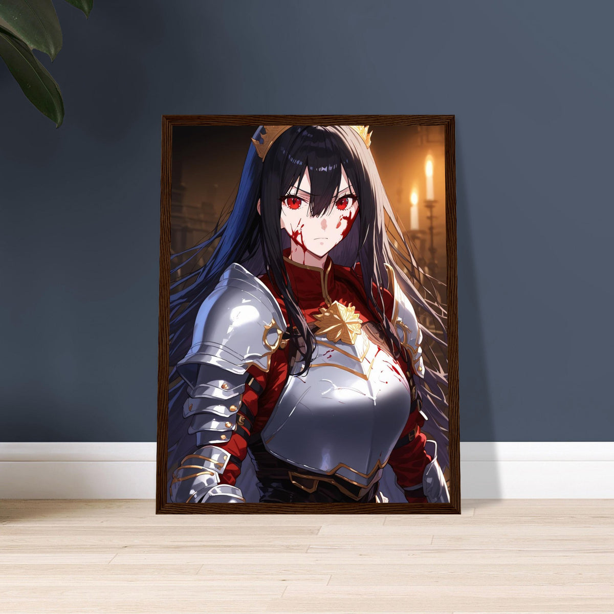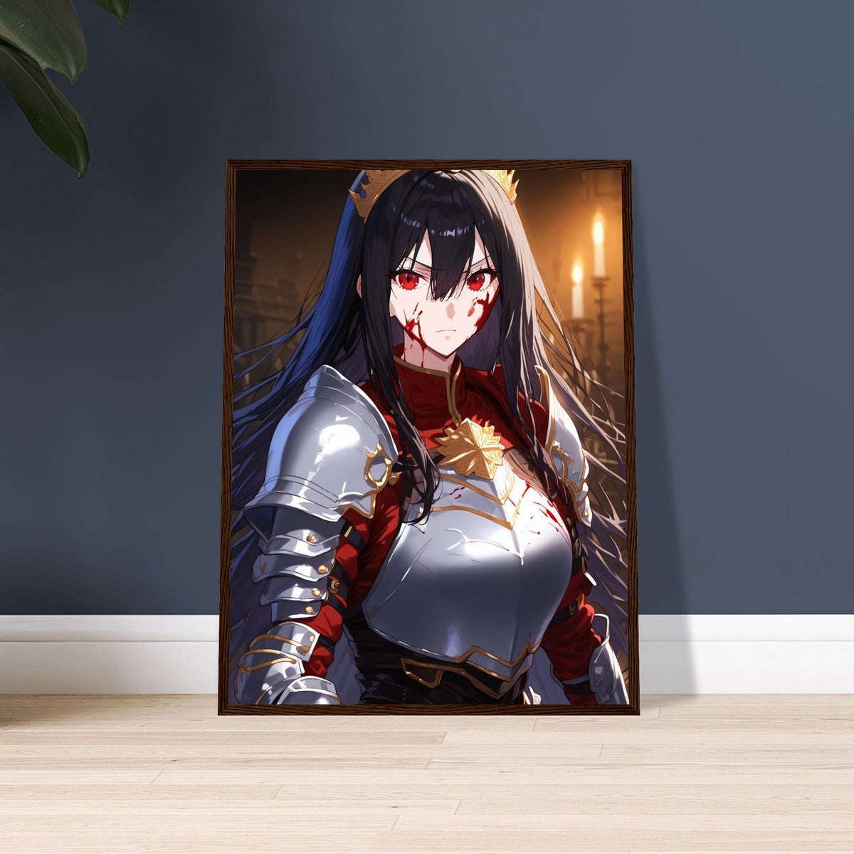 Beneath the flicker of candlelight, a crowned warrior stands unyielding in silver and crimson armor, the gold of her coronet gleaming against the soot and blood of battle. Her gaze is sharp, unwavering, and heavy with the burden of rule. The hall behind her, lined with gothic arches, breathes of ancient power and oaths unbroken. Crowned in Ash is a portrait of elegance forged in fire — a ruler who wears both victory and ruin upon her brow.