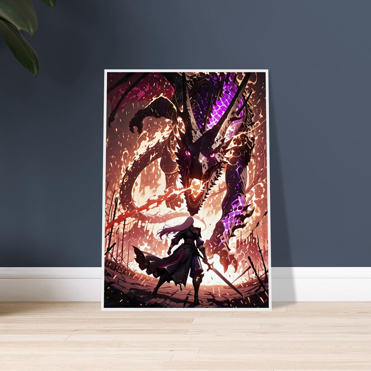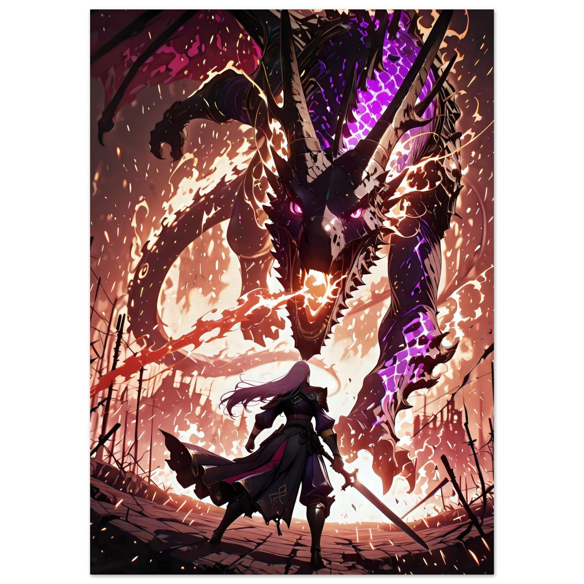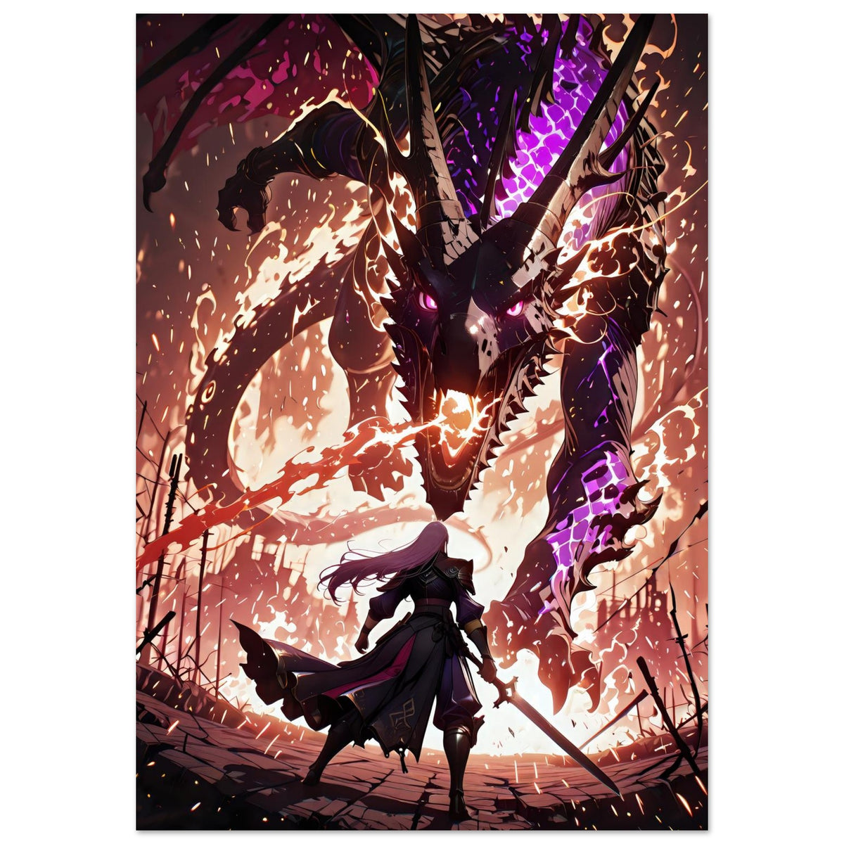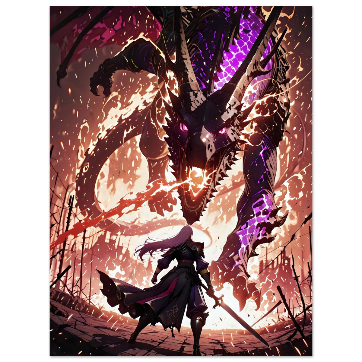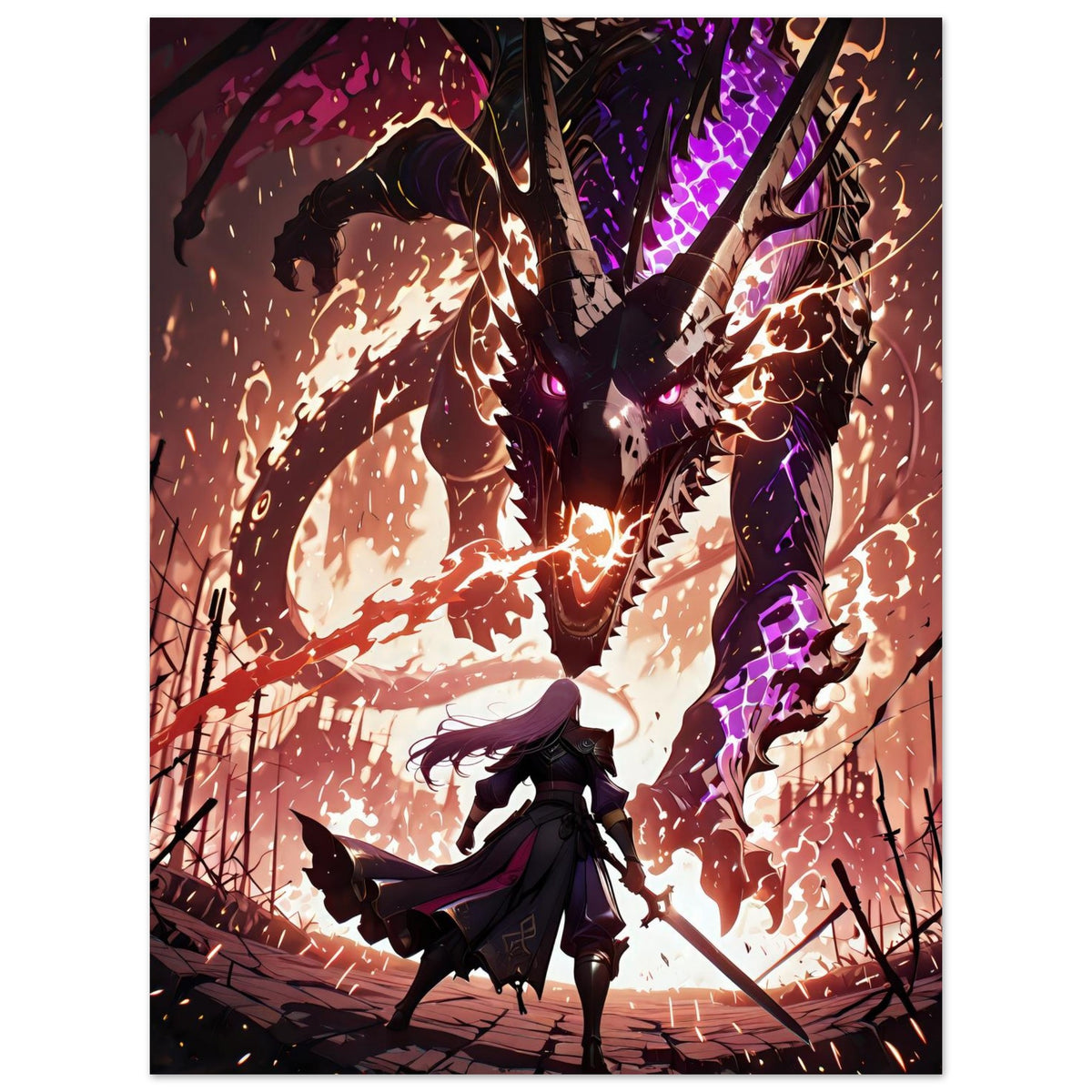 Amid flames and ruin, a lone warrior stands unyielding, blade drawn against a dragon wreathed in violet fire. Spears lie broken, the sky burns, and the beast towers above — yet the figure does not falter. The Last Defiance is inspired by the timeless myth of mortal versus monster, a moment suspended between annihilation and legend. It captures the essence of heroism in its rawest form: courage in the face of impossible odds.