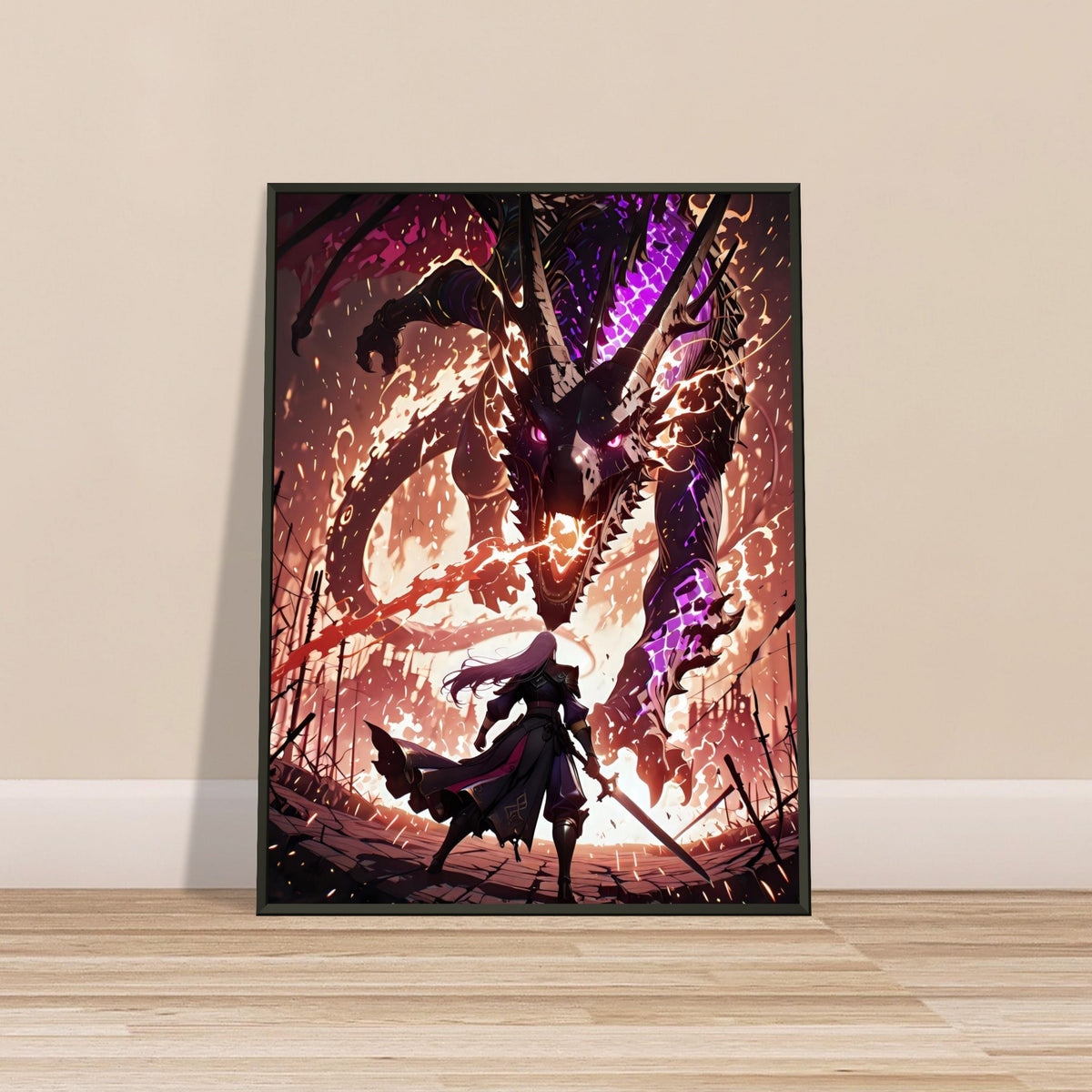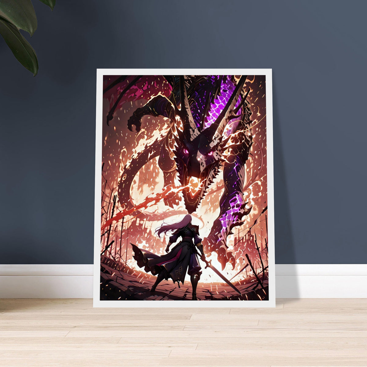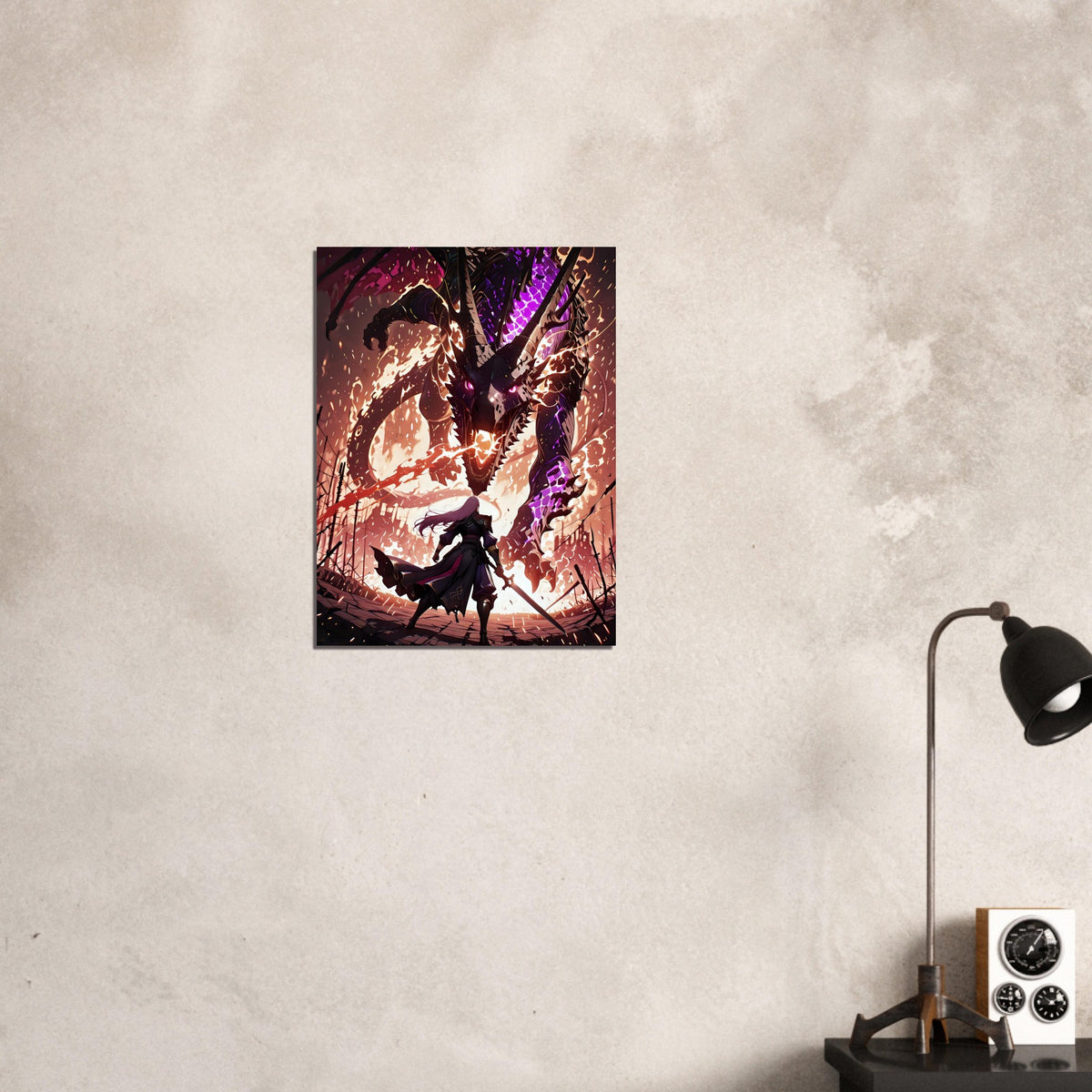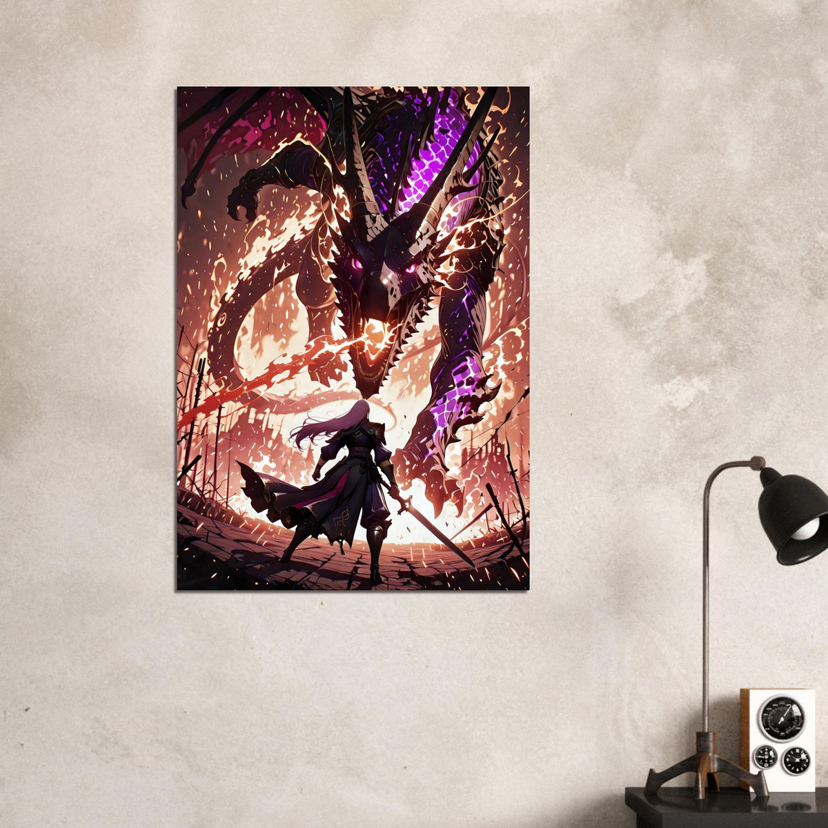 Amid flames and ruin, a lone warrior stands unyielding, blade drawn against a dragon wreathed in violet fire. Spears lie broken, the sky burns, and the beast towers above — yet the figure does not falter. The Last Defiance is inspired by the timeless myth of mortal versus monster, a moment suspended between annihilation and legend. It captures the essence of heroism in its rawest form: courage in the face of impossible odds.