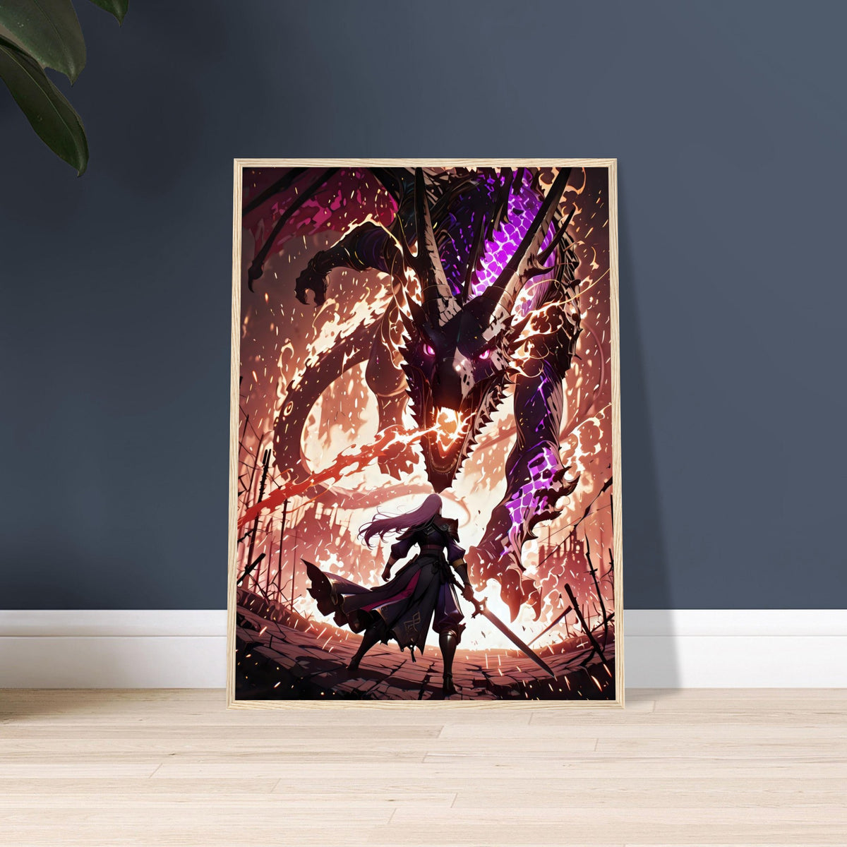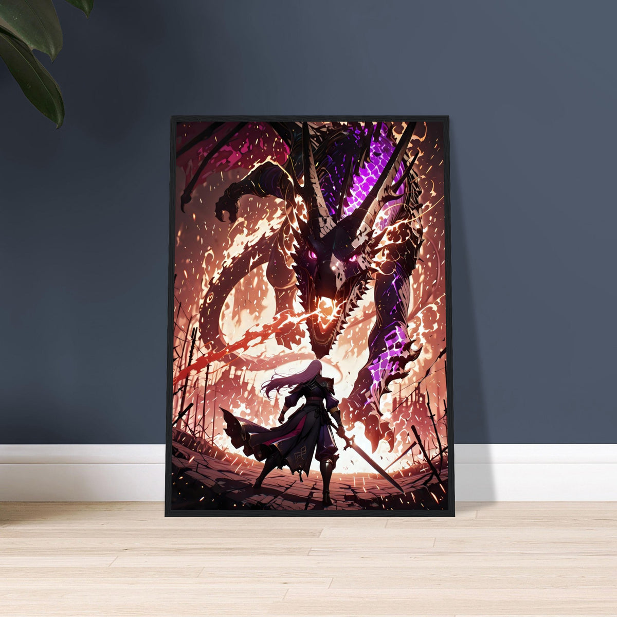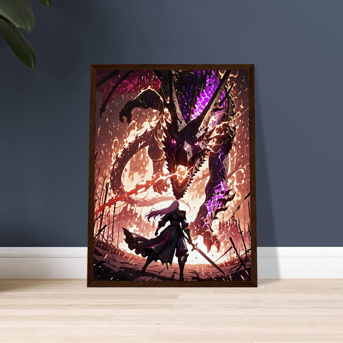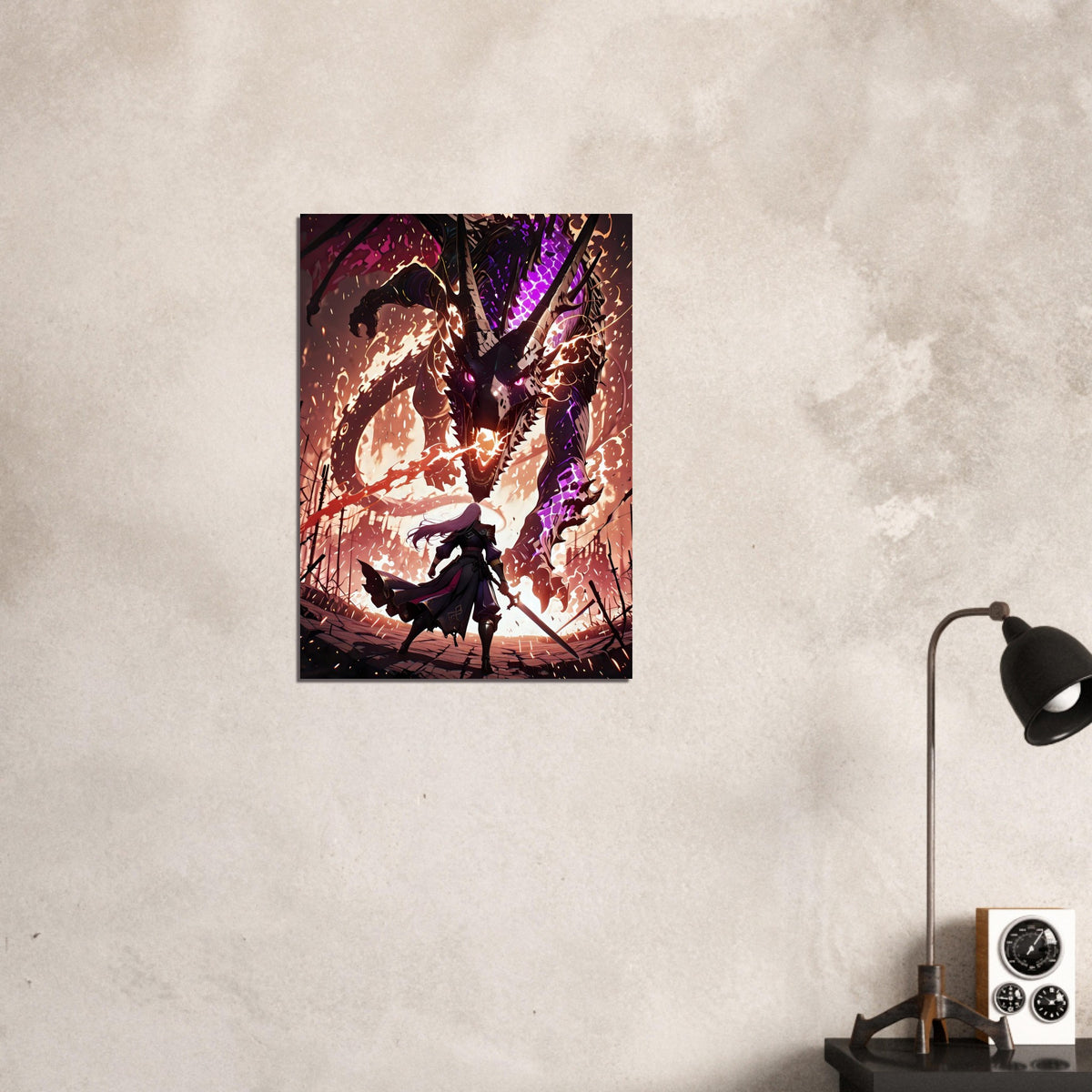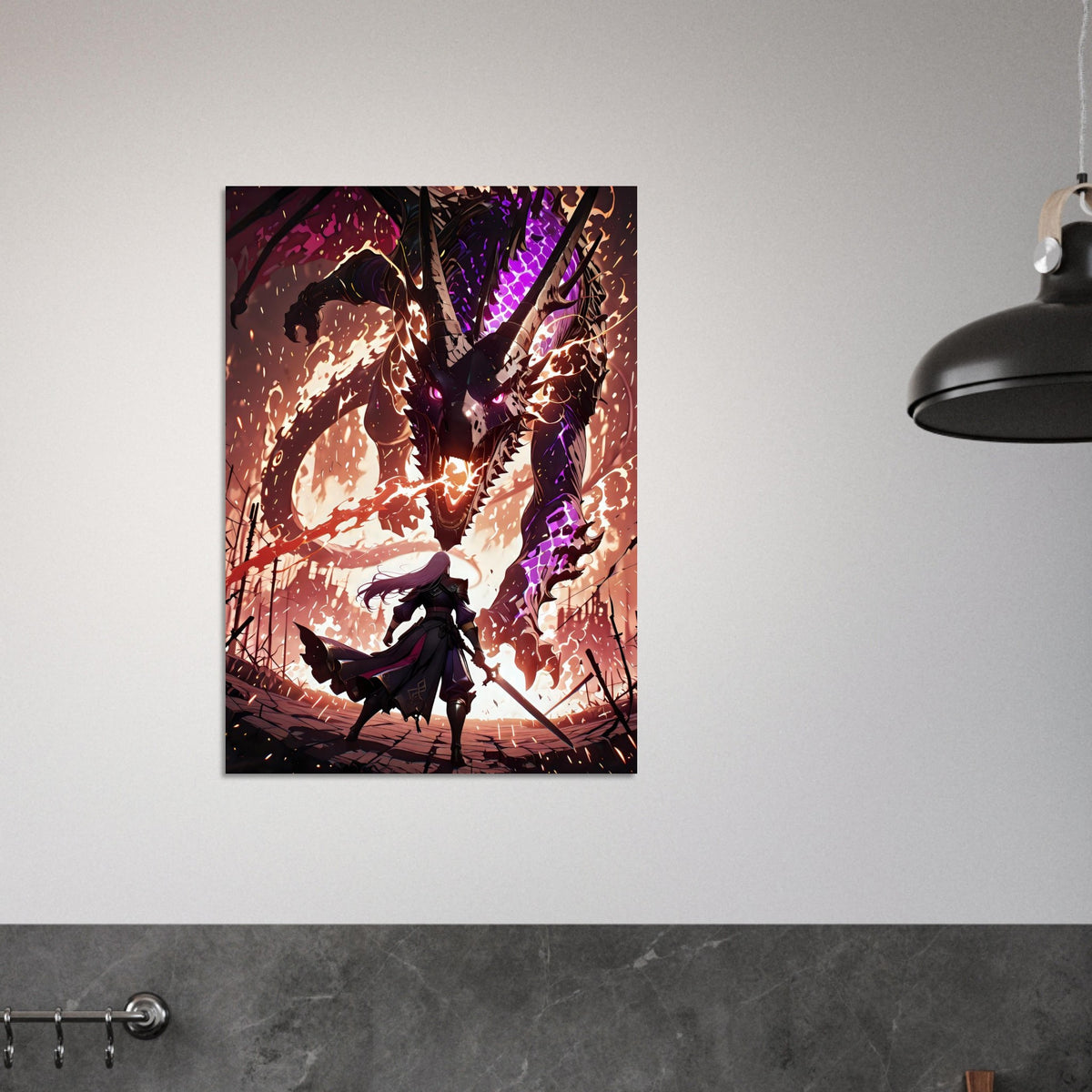 Amid flames and ruin, a lone warrior stands unyielding, blade drawn against a dragon wreathed in violet fire. Spears lie broken, the sky burns, and the beast towers above — yet the figure does not falter. The Last Defiance is inspired by the timeless myth of mortal versus monster, a moment suspended between annihilation and legend. It captures the essence of heroism in its rawest form: courage in the face of impossible odds.
