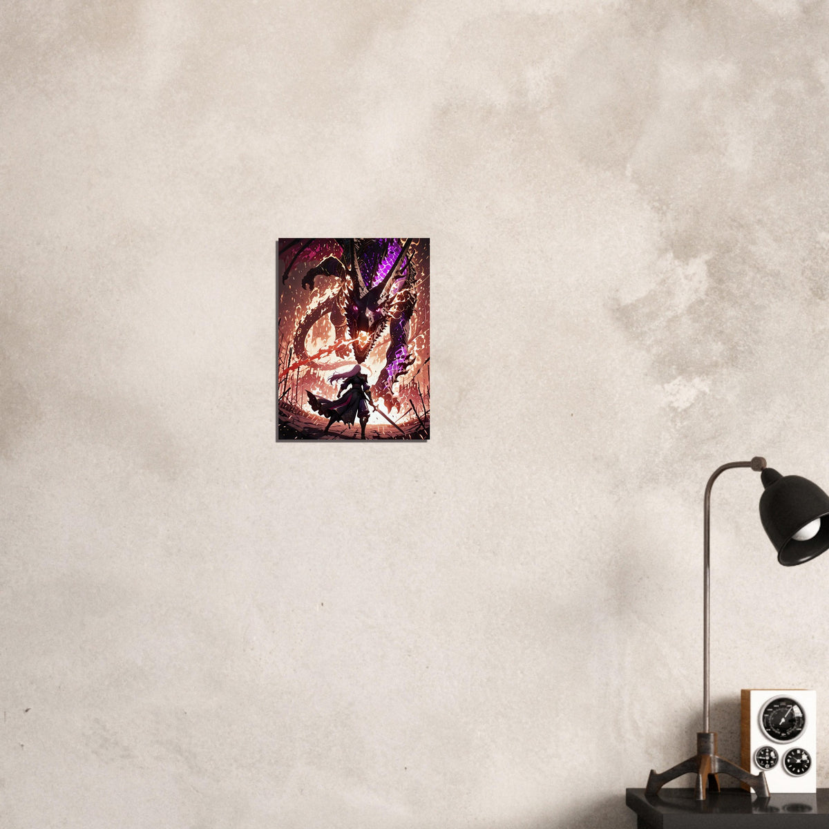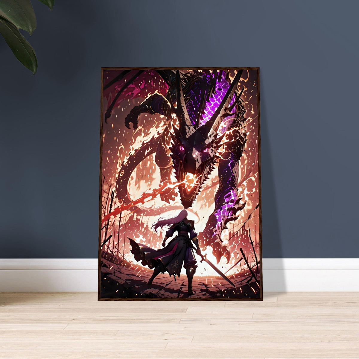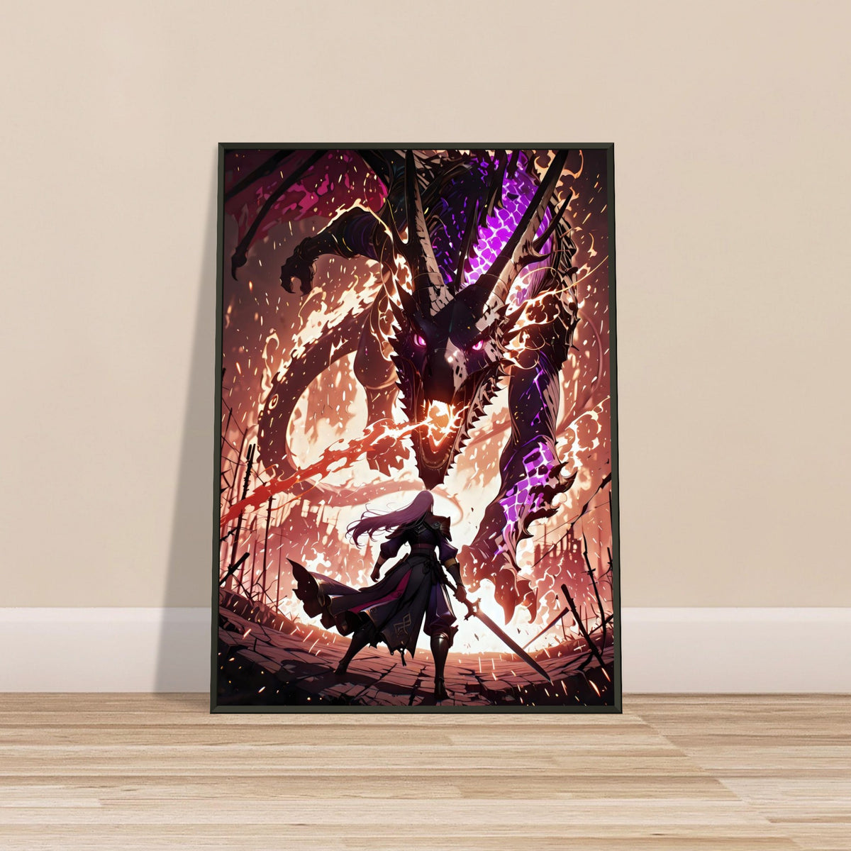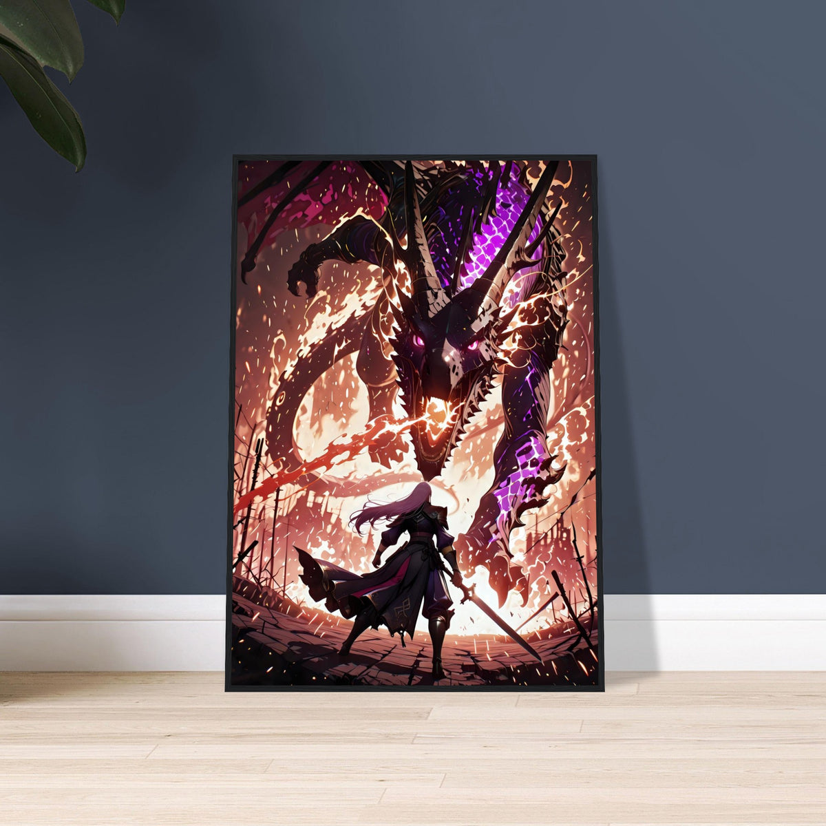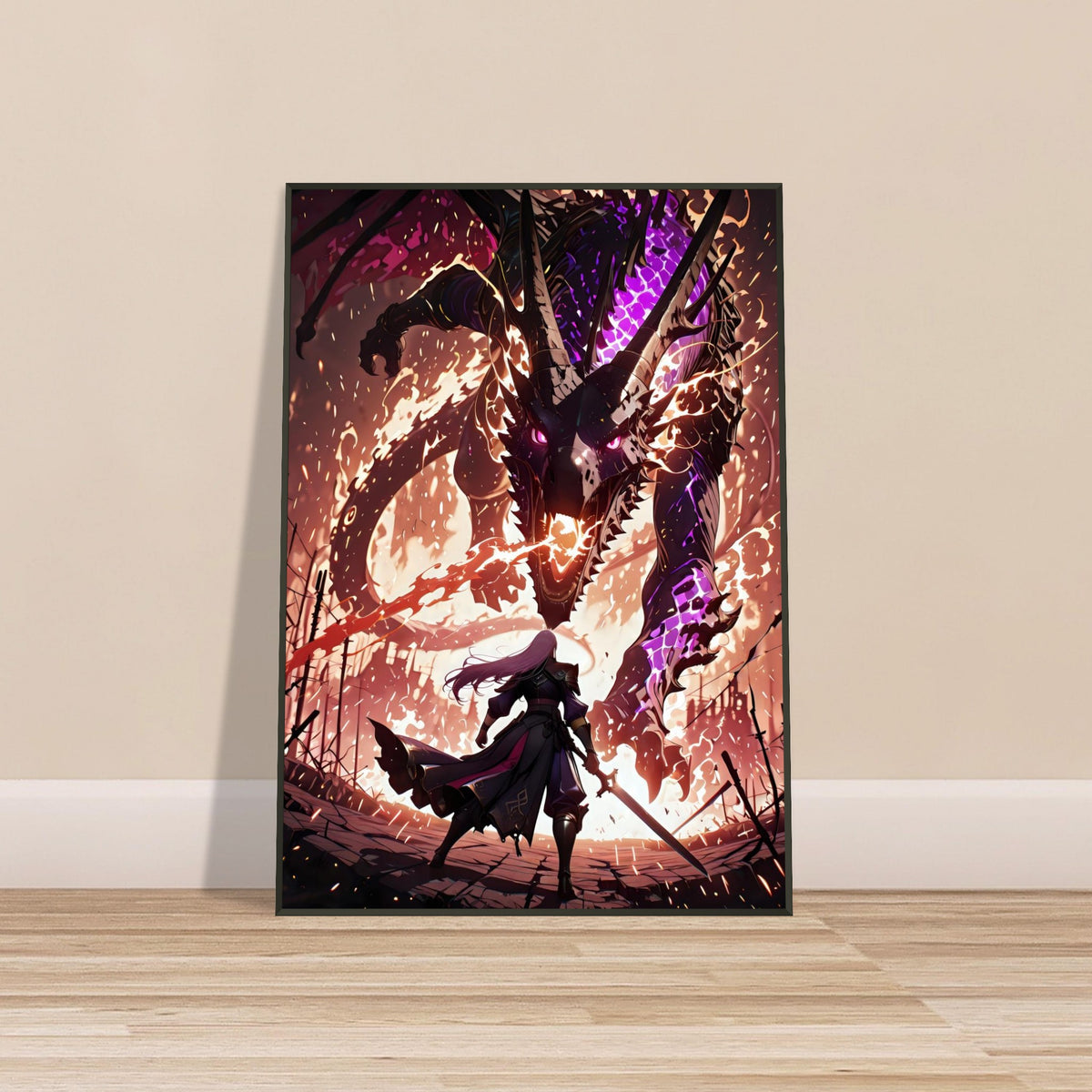 Amid flames and ruin, a lone warrior stands unyielding, blade drawn against a dragon wreathed in violet fire. Spears lie broken, the sky burns, and the beast towers above — yet the figure does not falter. The Last Defiance is inspired by the timeless myth of mortal versus monster, a moment suspended between annihilation and legend. It captures the essence of heroism in its rawest form: courage in the face of impossible odds.