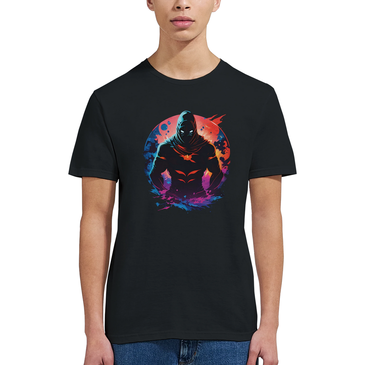 He stands before the breaking moon, a silhouette carved from the deepest night. While the cosmos explodes in a riot of cyan, magenta, and solar flares behind him, he remains absolute stillness—a void in the center of the chaos. With eyes of pure white starlight and sigils burning on his chest, he watches over the boundary between the known world and the unknown.