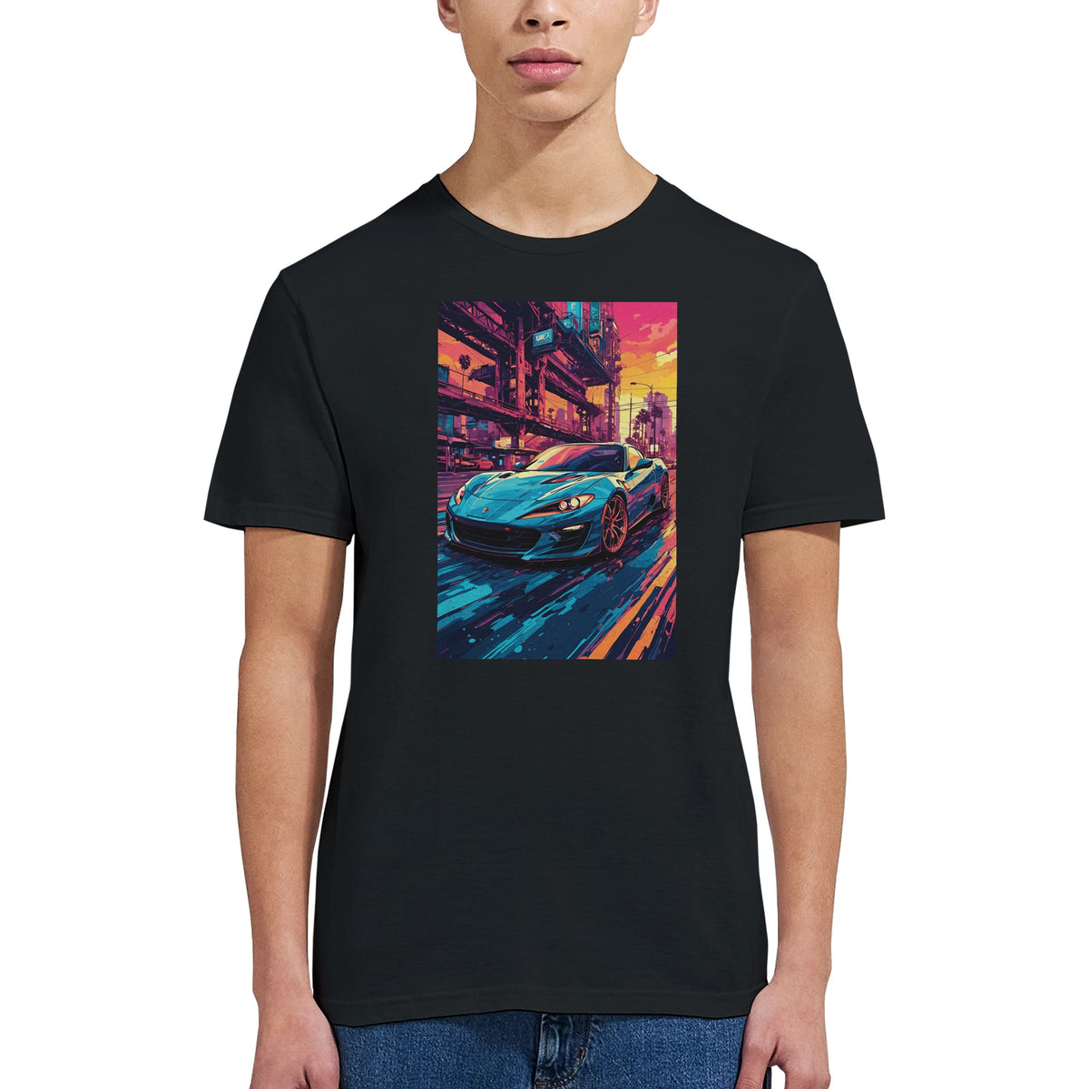 The blue‑skinned machine cuts through the city’s twilight, its curves igniting with the fire of a sky painted in orange, pink, and violet — no longer bound to the wall, but carried onto fabric. Elevated highways coil like steel serpents above, neon signs flicker against palm‑lined streets, and the wet pavement mirrors every streak of light.