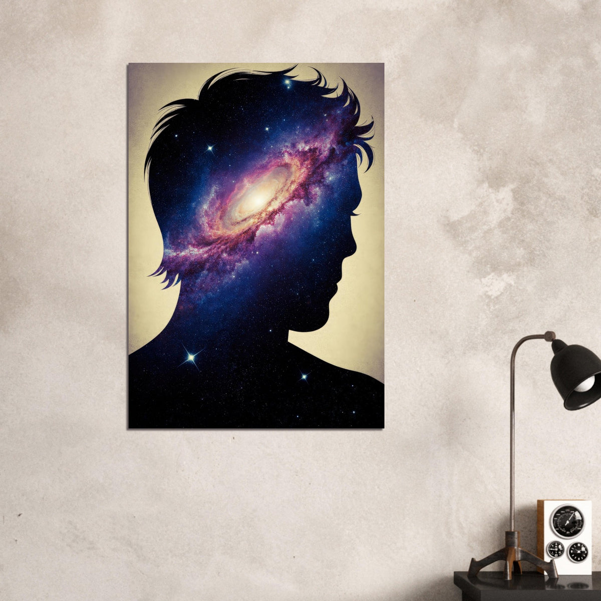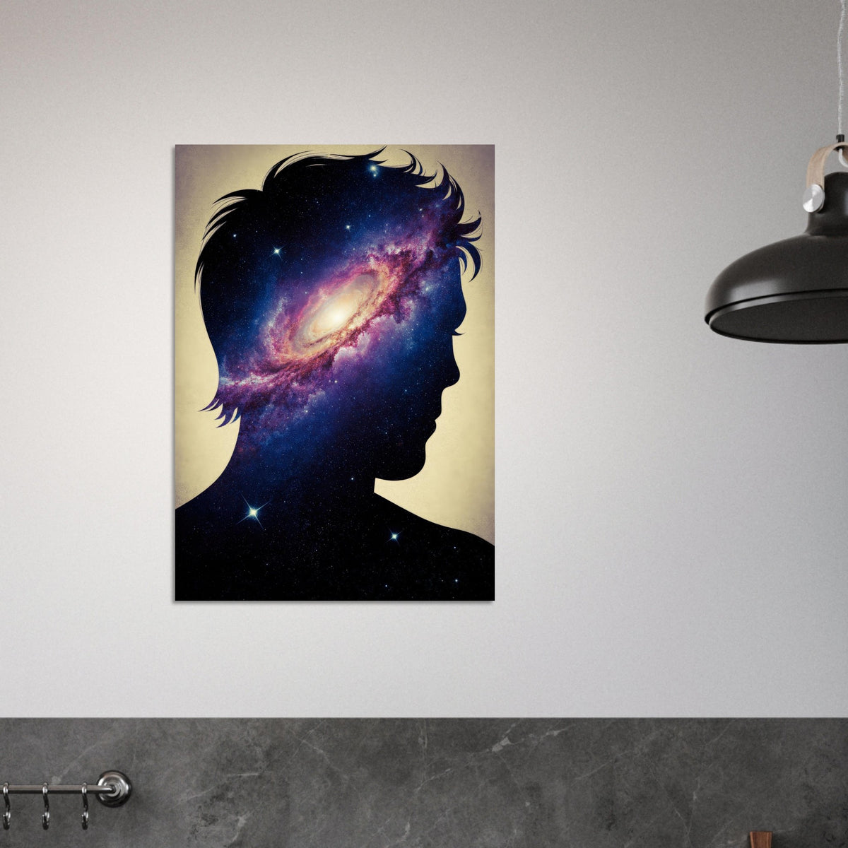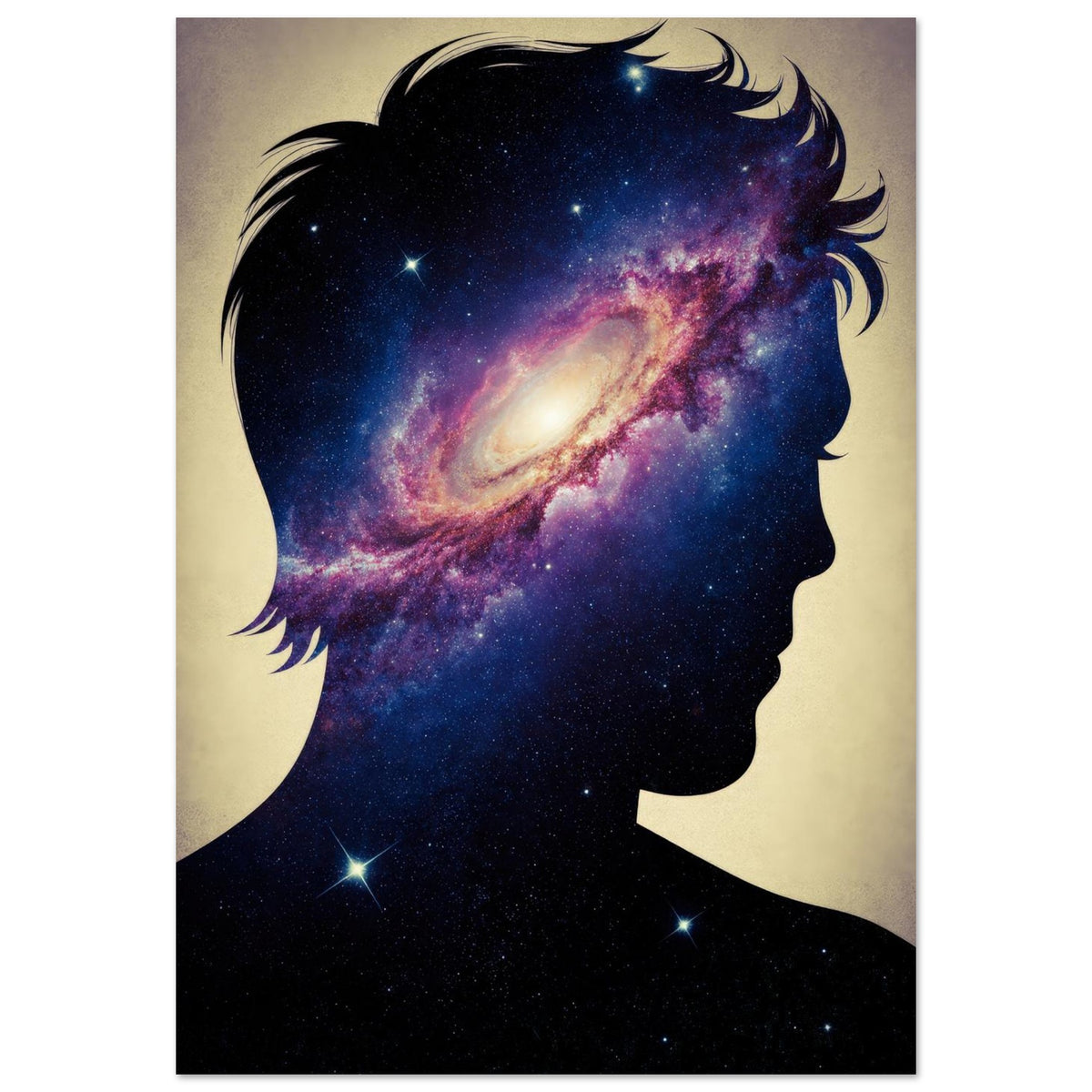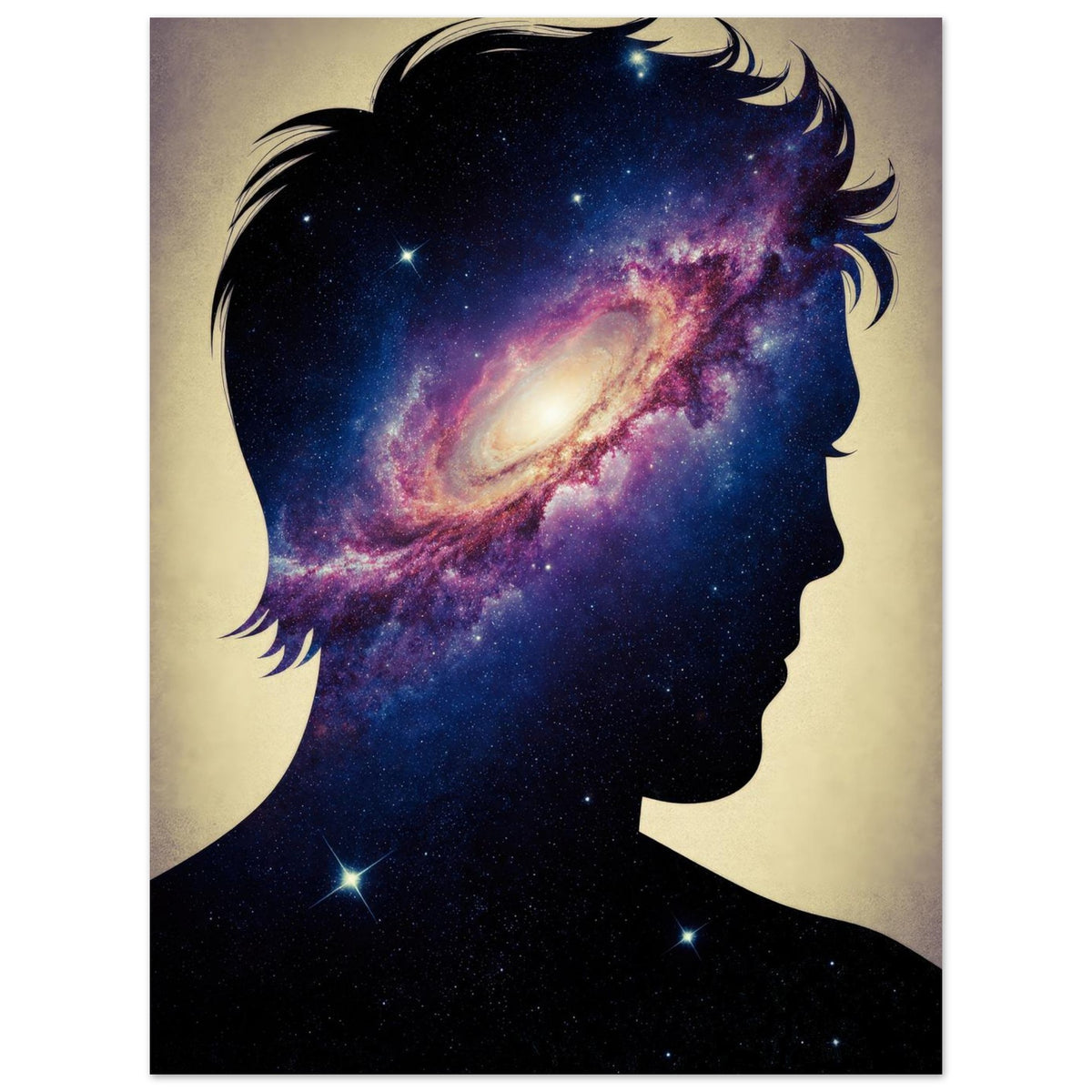 Within the silhouette, a galaxy turns endlessly—stars, dust, and light spiraling around a radiant core aligned with thought itself. The boundary between inner and outer space dissolves, suggesting that consciousness is not separate from the cosmos, but a reflection of it.