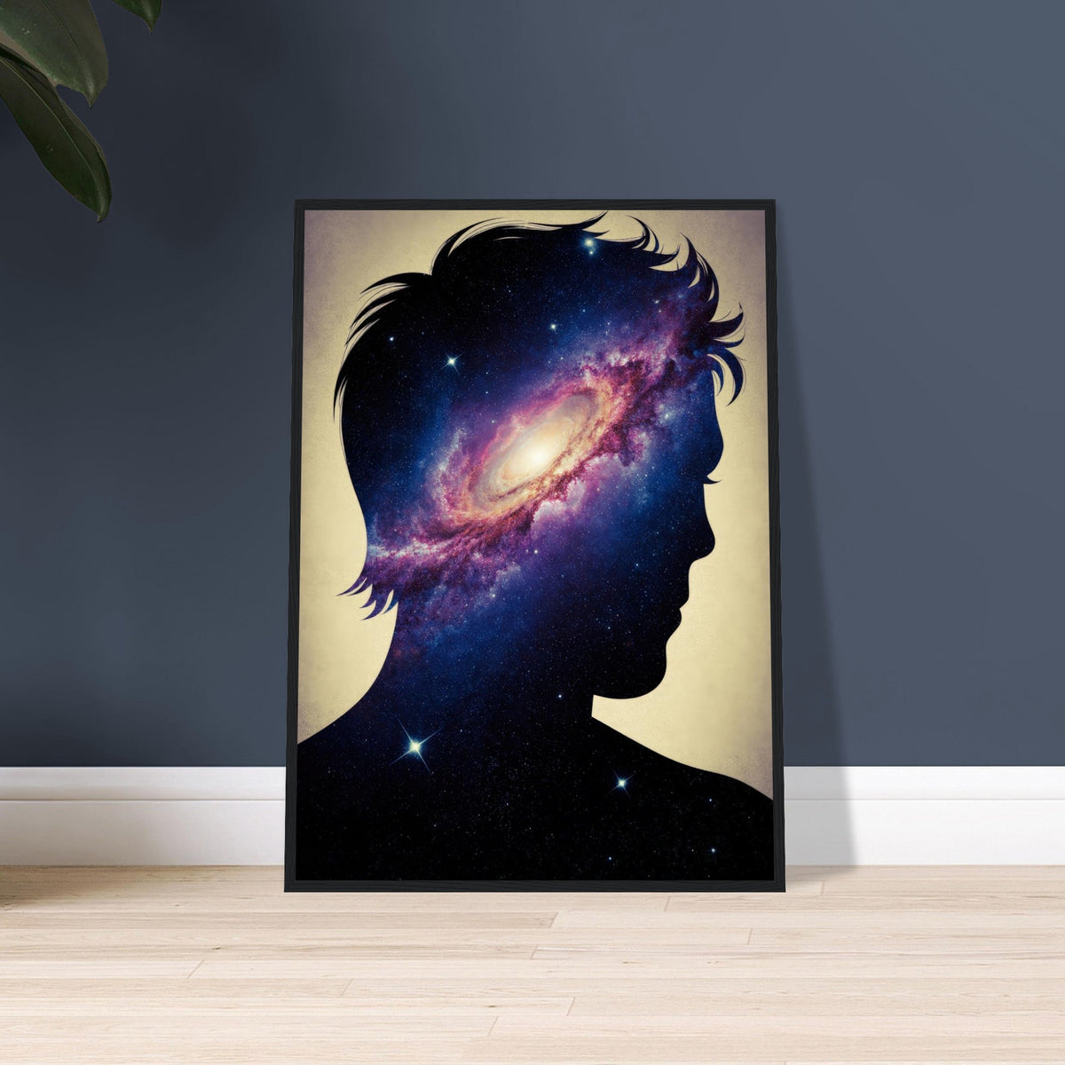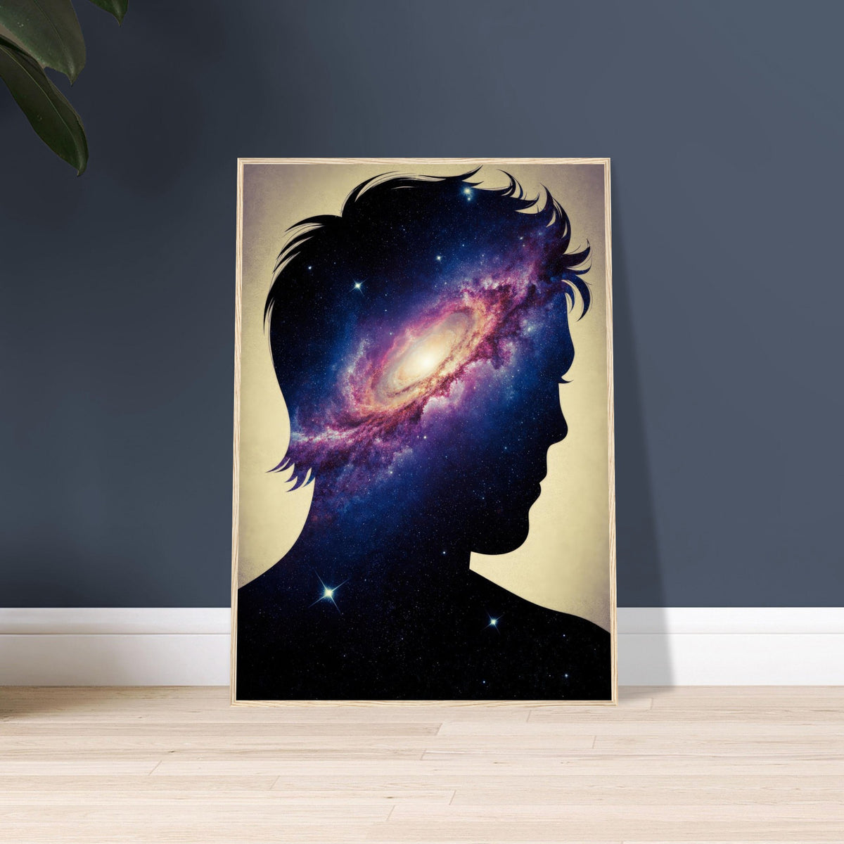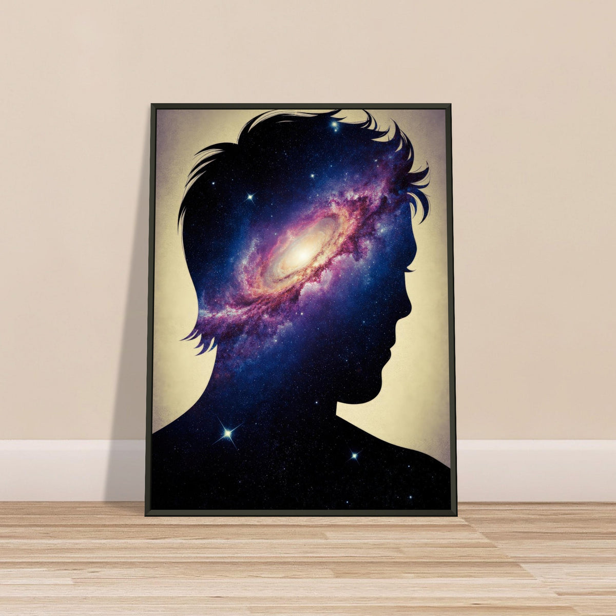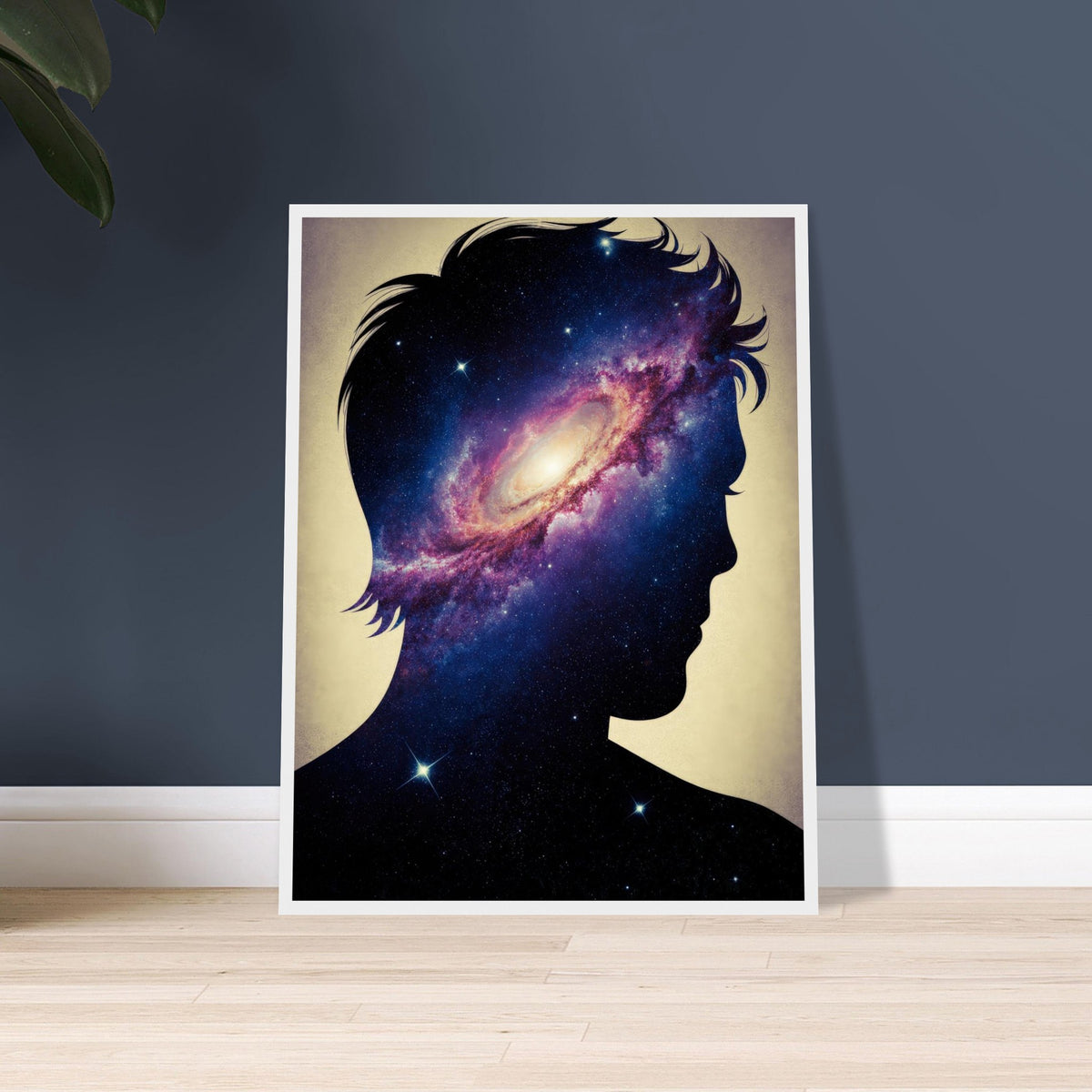 Within the silhouette, a galaxy turns endlessly—stars, dust, and light spiraling around a radiant core aligned with thought itself. The boundary between inner and outer space dissolves, suggesting that consciousness is not separate from the cosmos, but a reflection of it.