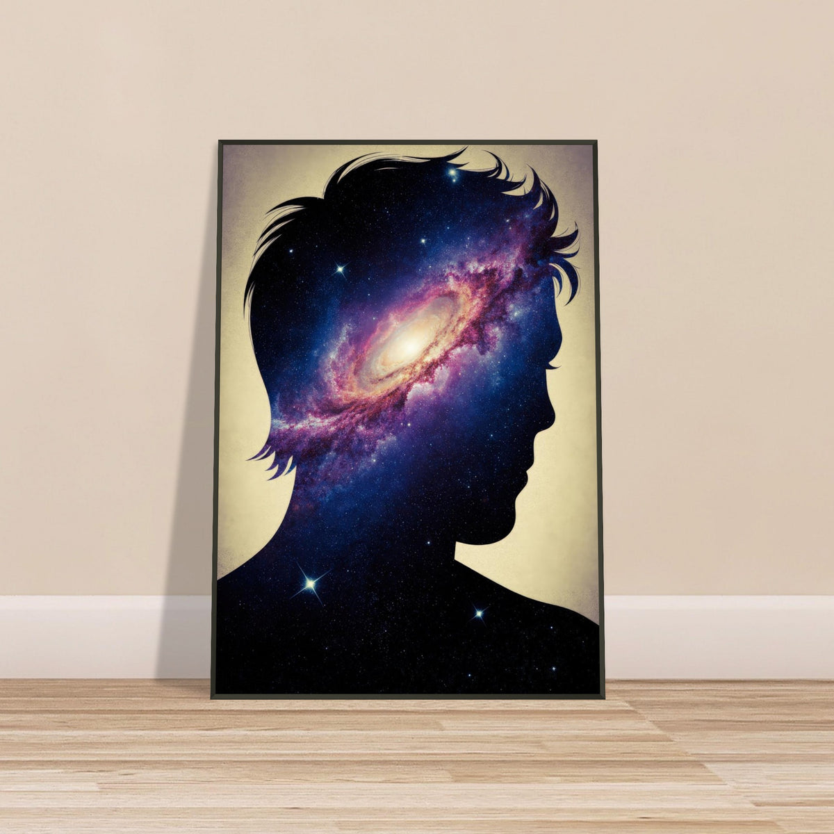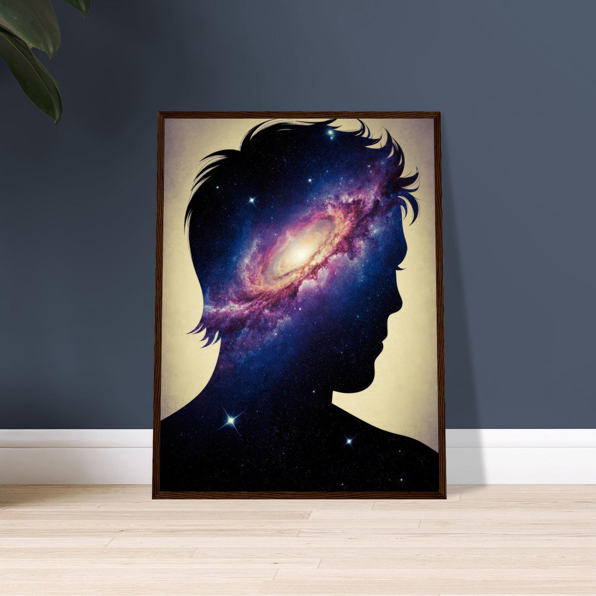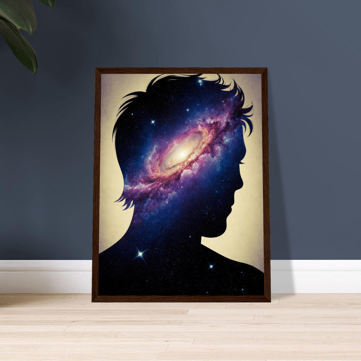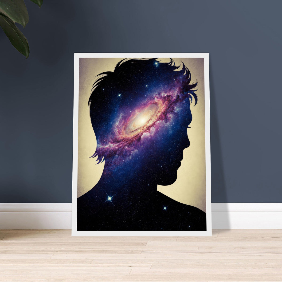 Within the silhouette, a galaxy turns endlessly—stars, dust, and light spiraling around a radiant core aligned with thought itself. The boundary between inner and outer space dissolves, suggesting that consciousness is not separate from the cosmos, but a reflection of it.