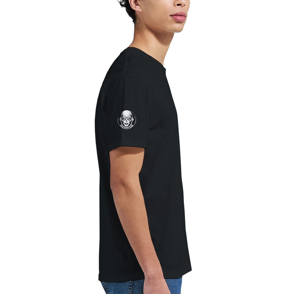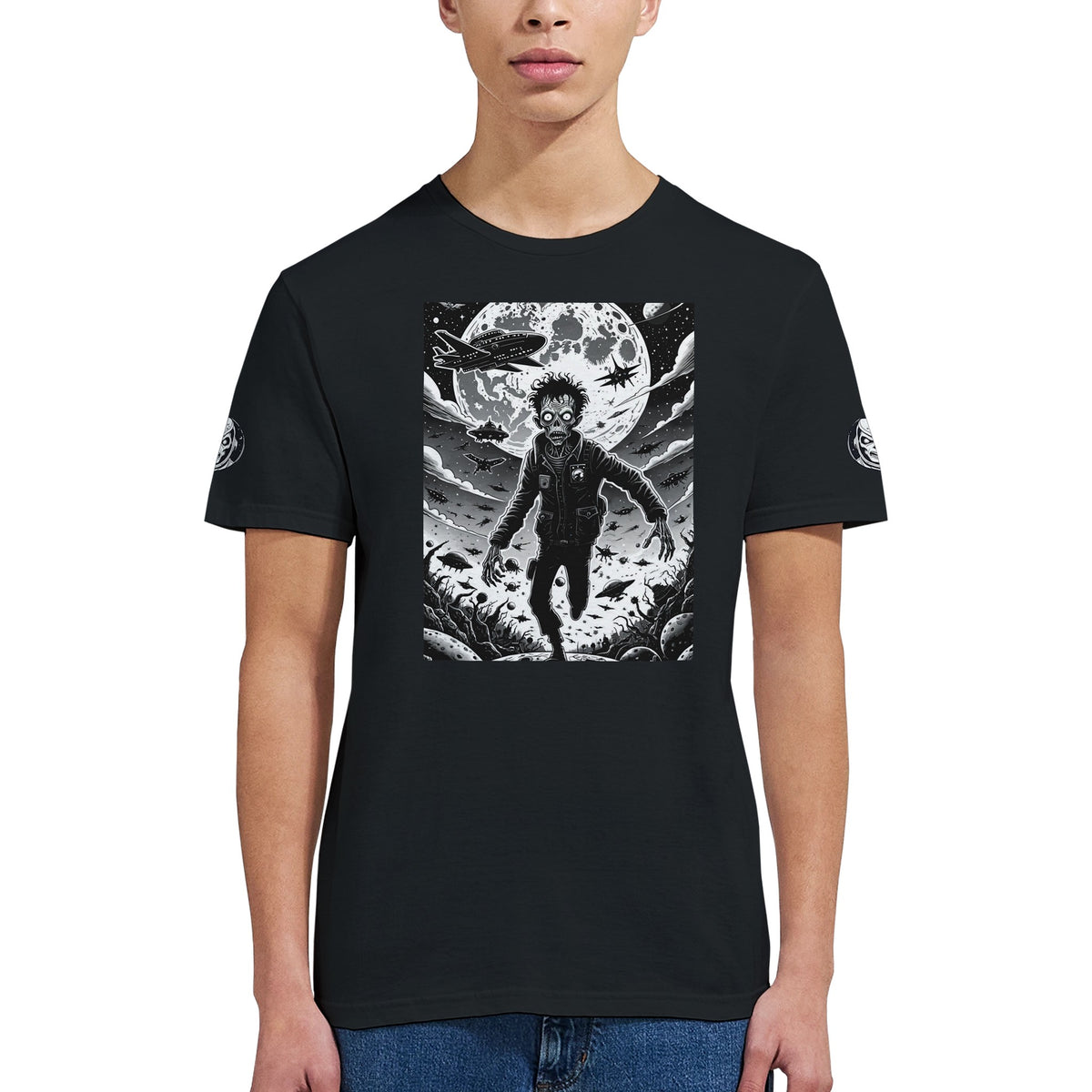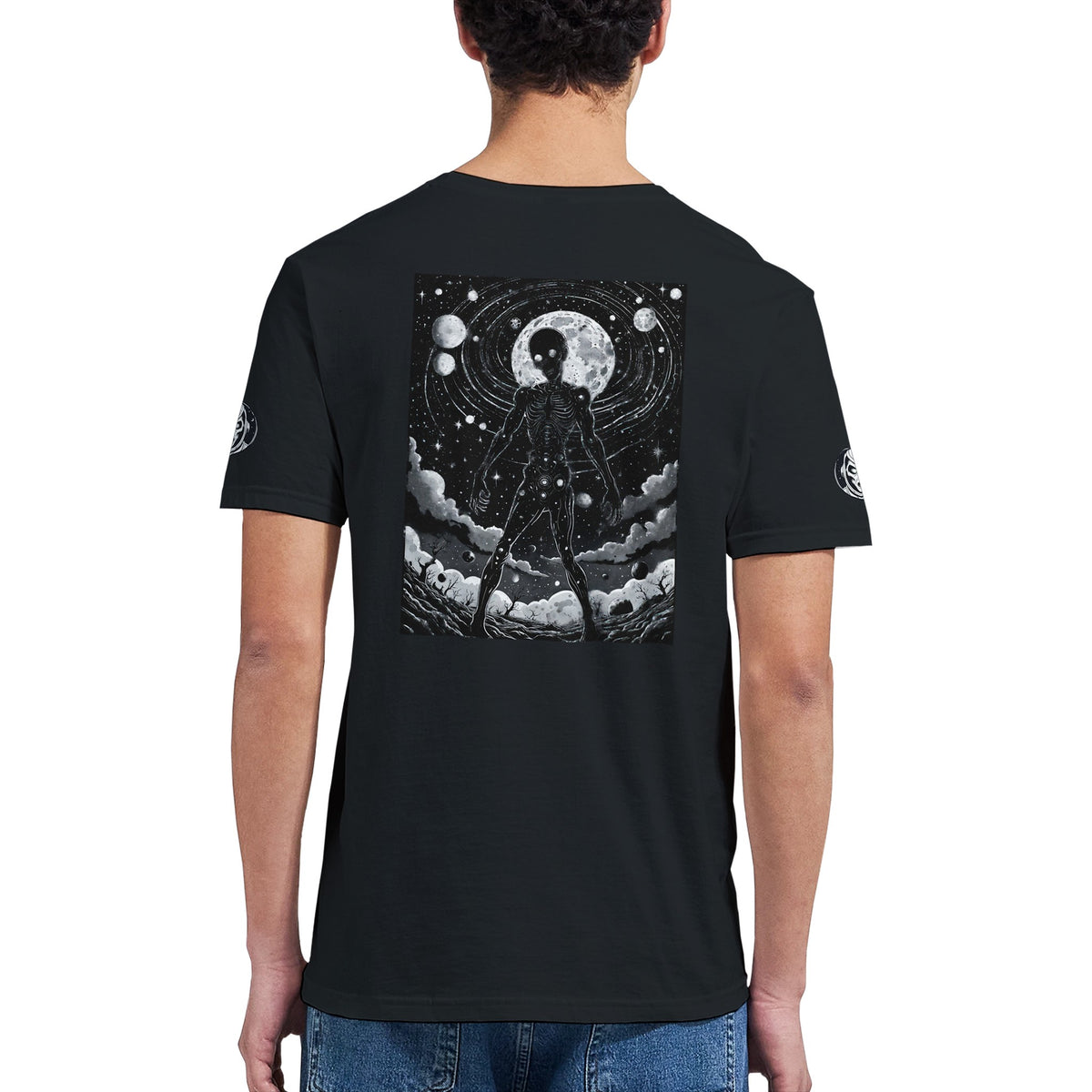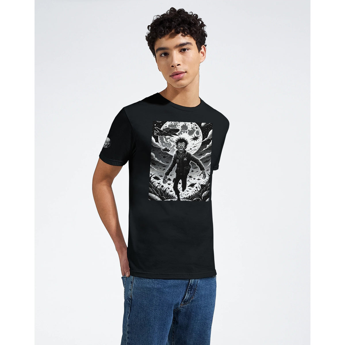 Under the swollen moon, the grotesque silhouette breaks free from the poster and onto fabric — a vision of invasion and apocalypse stitched into the ultra‑soft Gildan 6400. Printed with DTG precision, every fractured dome, wandering planet, and fever‑dream sky is carried forward in stark black and white.