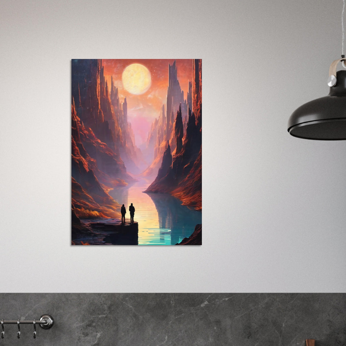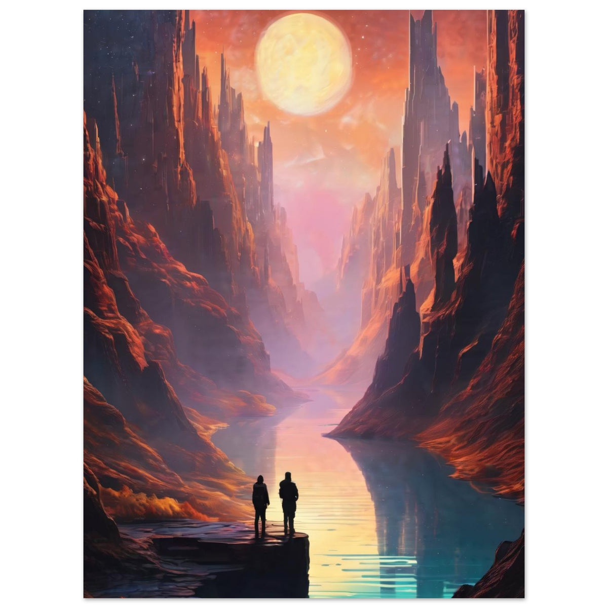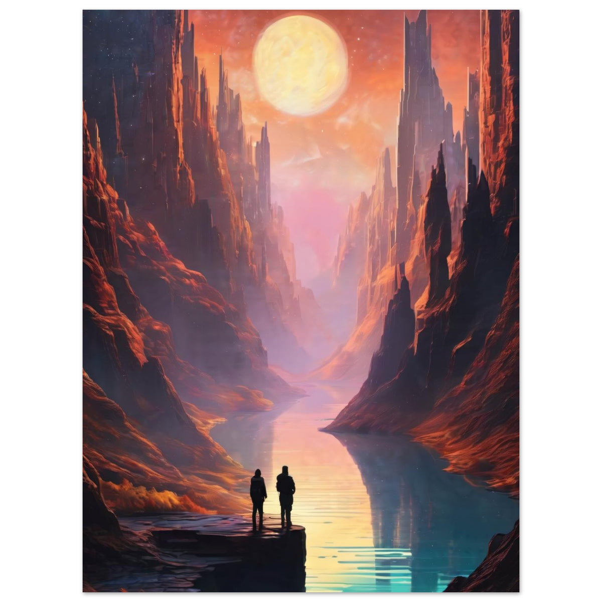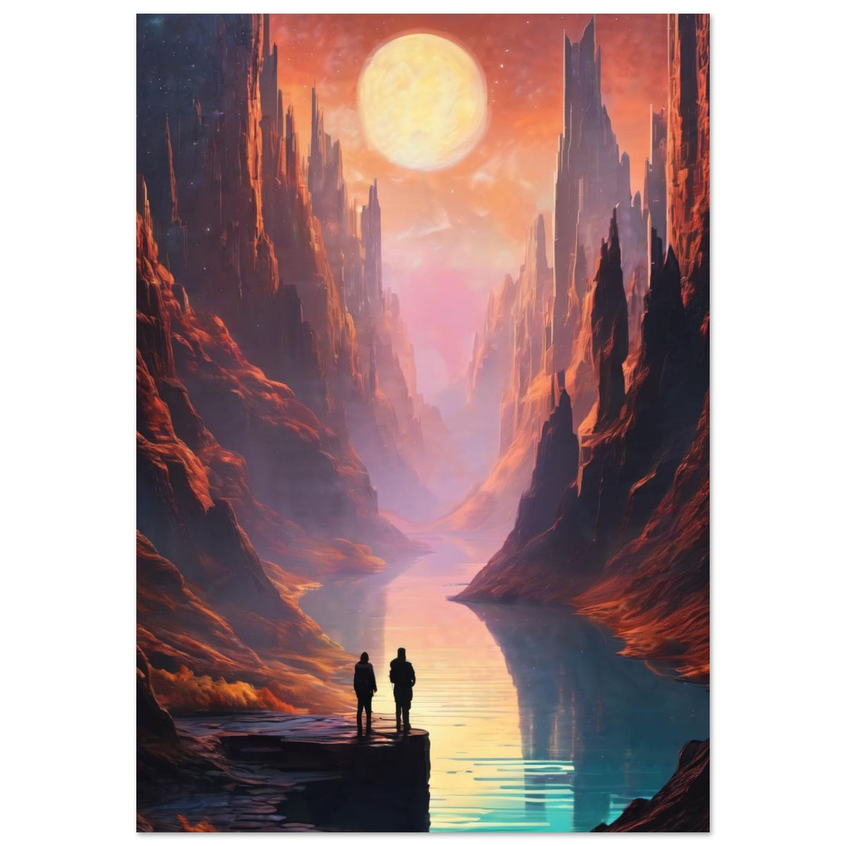 Two figures stand upon a rocky ledge, their silhouettes framed against a canyon bathed in the glow of a vast, luminous moon. Jagged cliffs rise steeply on either side, their surfaces painted in warm hues of orange, rose, and violet as the sky shifts from deep indigo to soft pastels at the horizon. Below, a tranquil river winds through the gorge, its surface mirroring both the cliffs and the celestial light above. The atmosphere is dreamlike yet grounded, a moment of quiet wonder where human presence feels small against the immensity of stone, water, and sky. Moonlit Passage captures the essence of journey and discovery, where companionship meets the sublime beauty of the unknown.