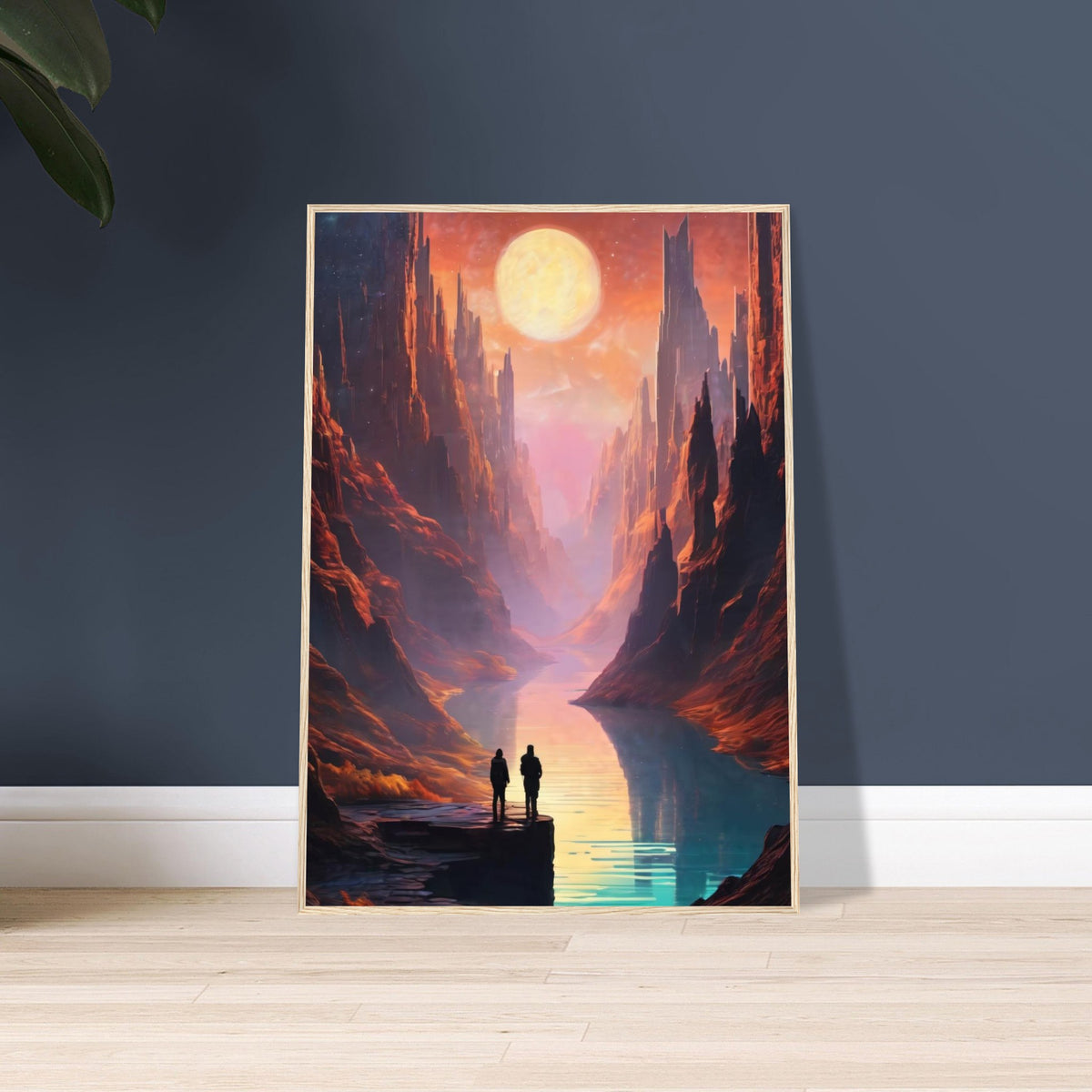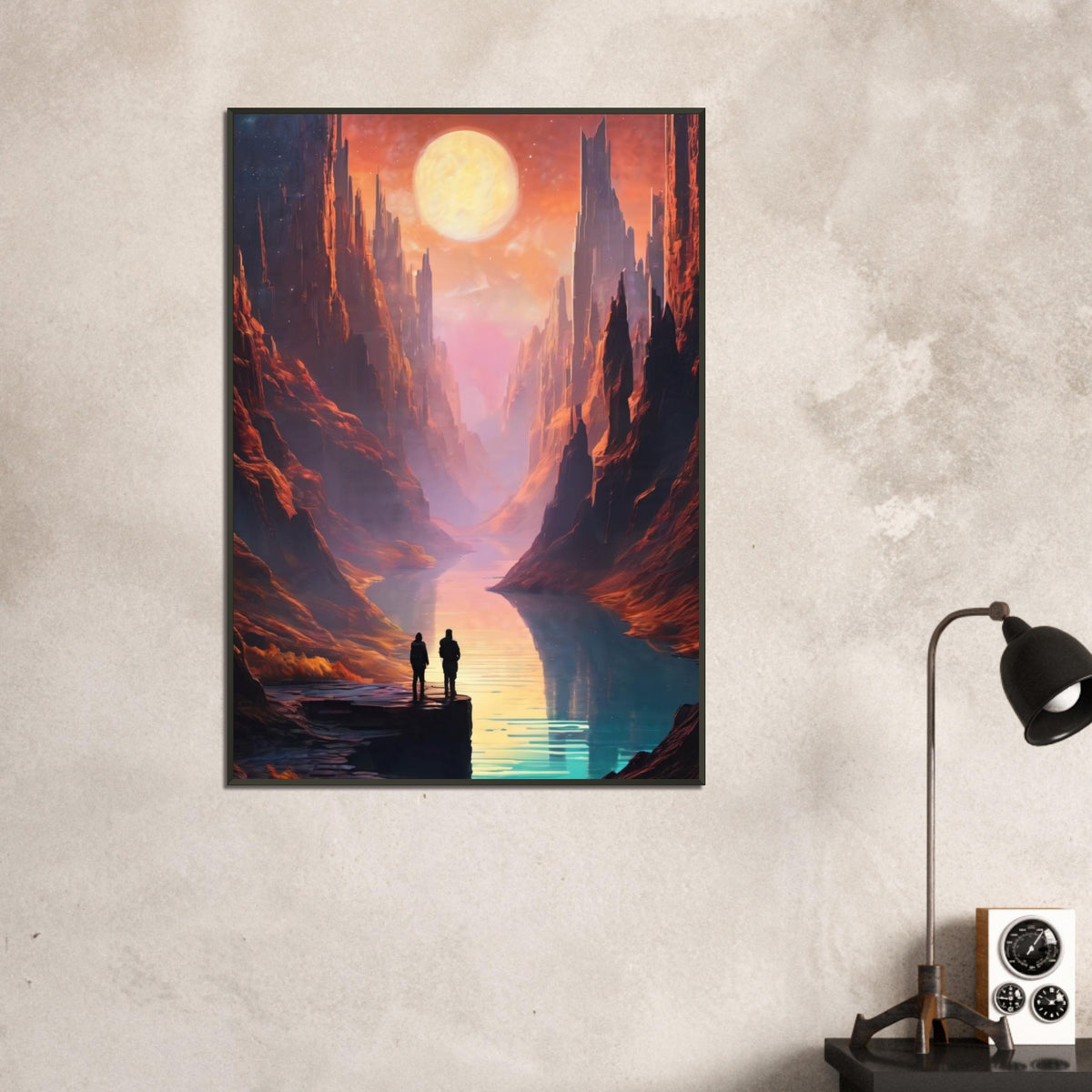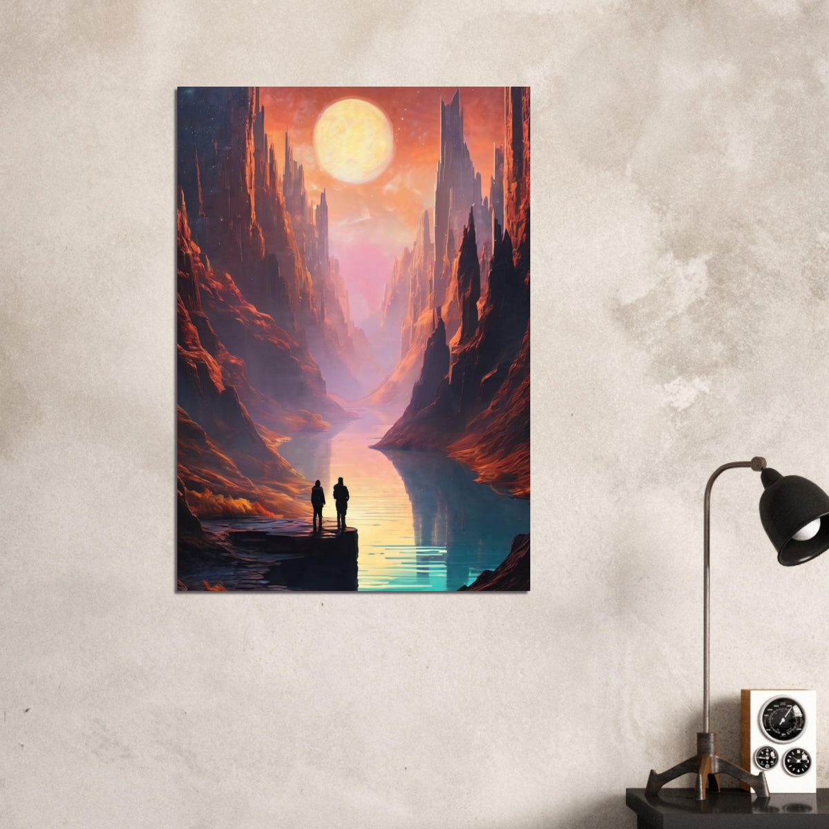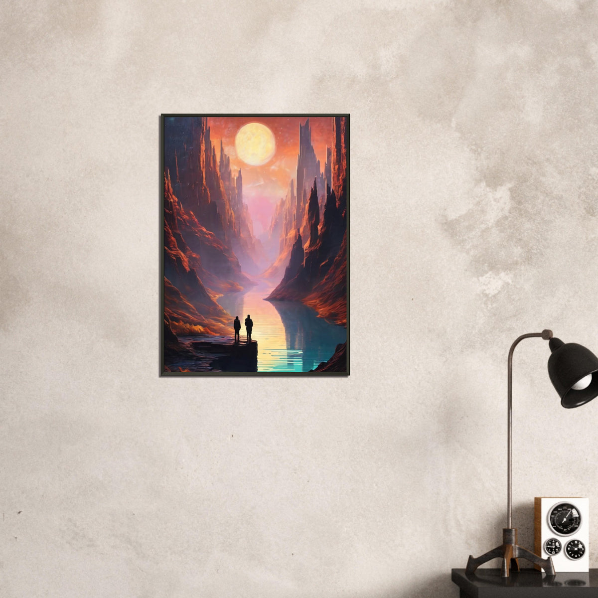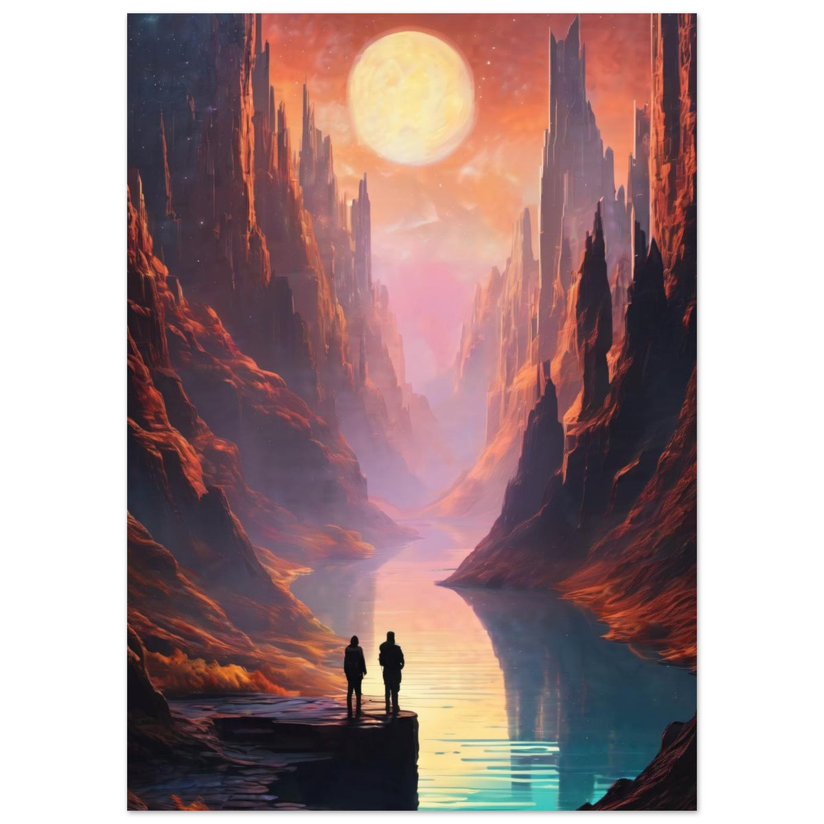 Two figures stand upon a rocky ledge, their silhouettes framed against a canyon bathed in the glow of a vast, luminous moon. Jagged cliffs rise steeply on either side, their surfaces painted in warm hues of orange, rose, and violet as the sky shifts from deep indigo to soft pastels at the horizon. Below, a tranquil river winds through the gorge, its surface mirroring both the cliffs and the celestial light above. The atmosphere is dreamlike yet grounded, a moment of quiet wonder where human presence feels small against the immensity of stone, water, and sky. Moonlit Passage captures the essence of journey and discovery, where companionship meets the sublime beauty of the unknown.