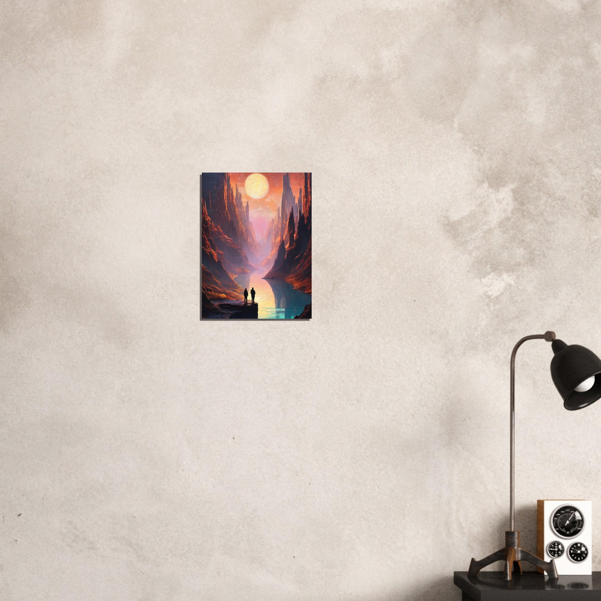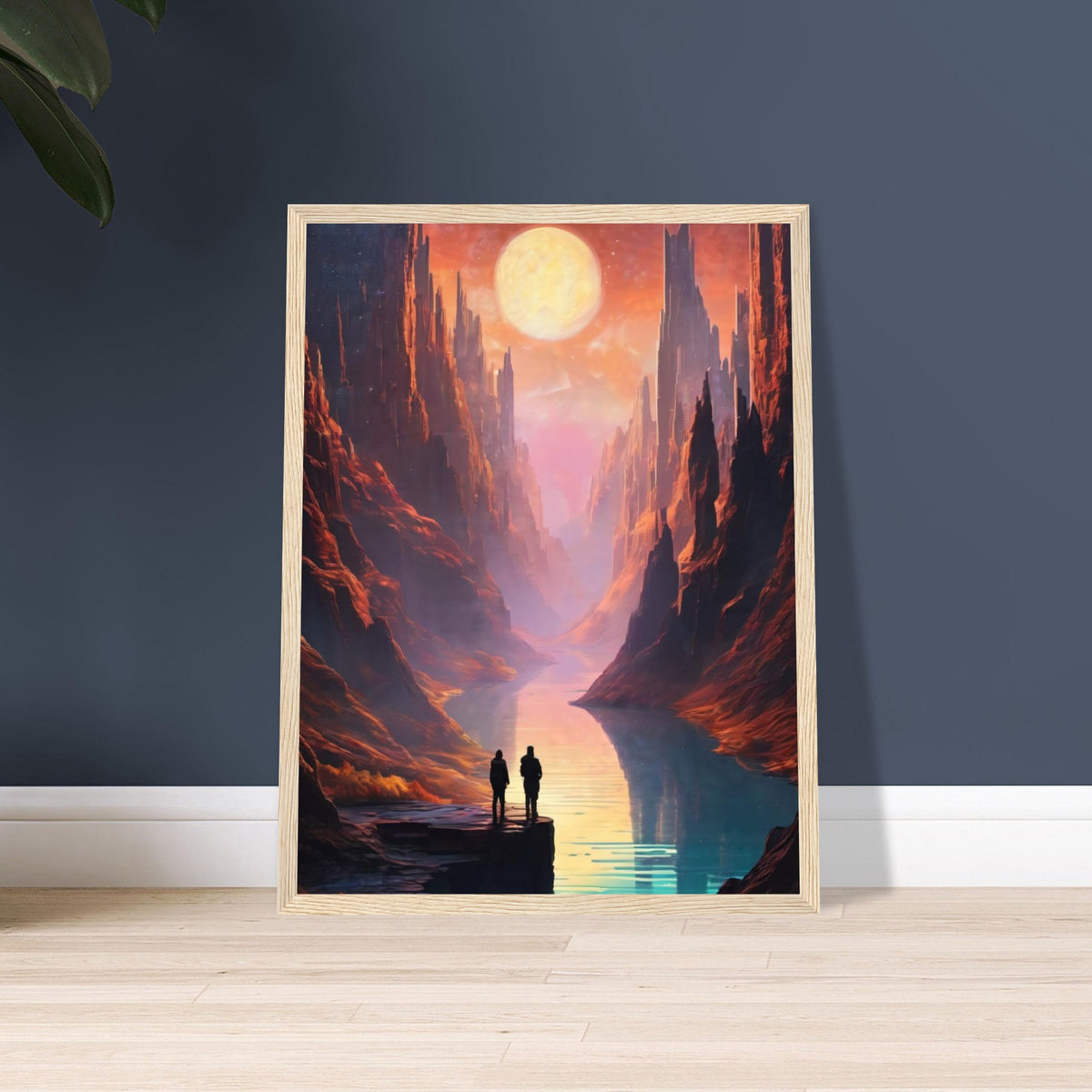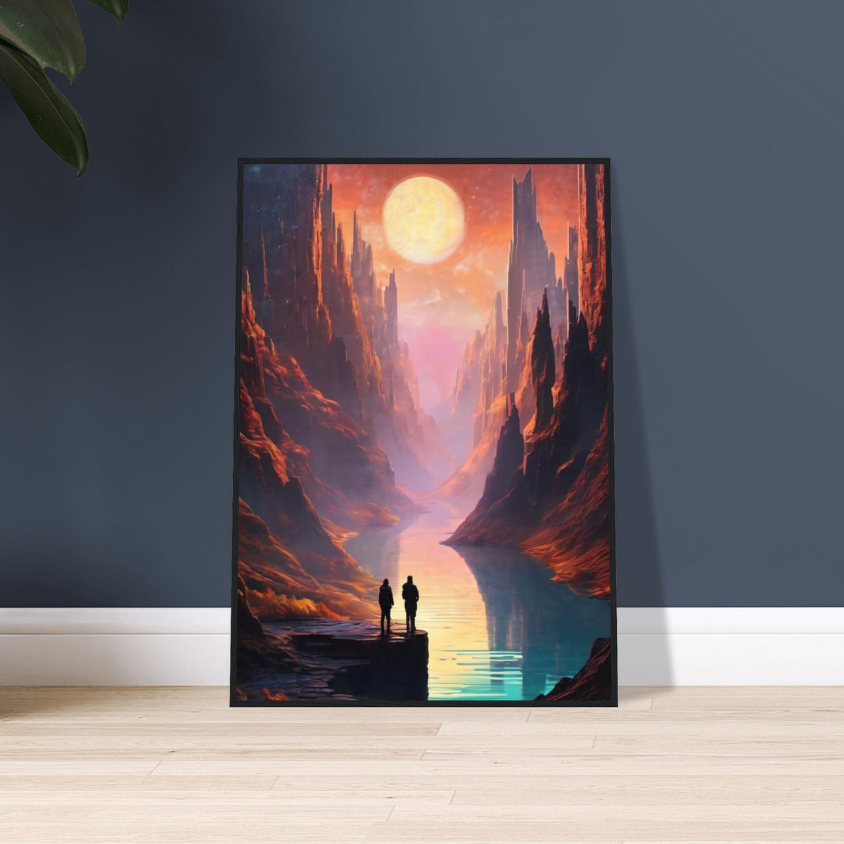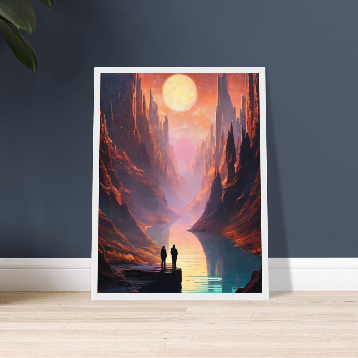 Two figures stand upon a rocky ledge, their silhouettes framed against a canyon bathed in the glow of a vast, luminous moon. Jagged cliffs rise steeply on either side, their surfaces painted in warm hues of orange, rose, and violet as the sky shifts from deep indigo to soft pastels at the horizon. Below, a tranquil river winds through the gorge, its surface mirroring both the cliffs and the celestial light above. The atmosphere is dreamlike yet grounded, a moment of quiet wonder where human presence feels small against the immensity of stone, water, and sky. Moonlit Passage captures the essence of journey and discovery, where companionship meets the sublime beauty of the unknown.