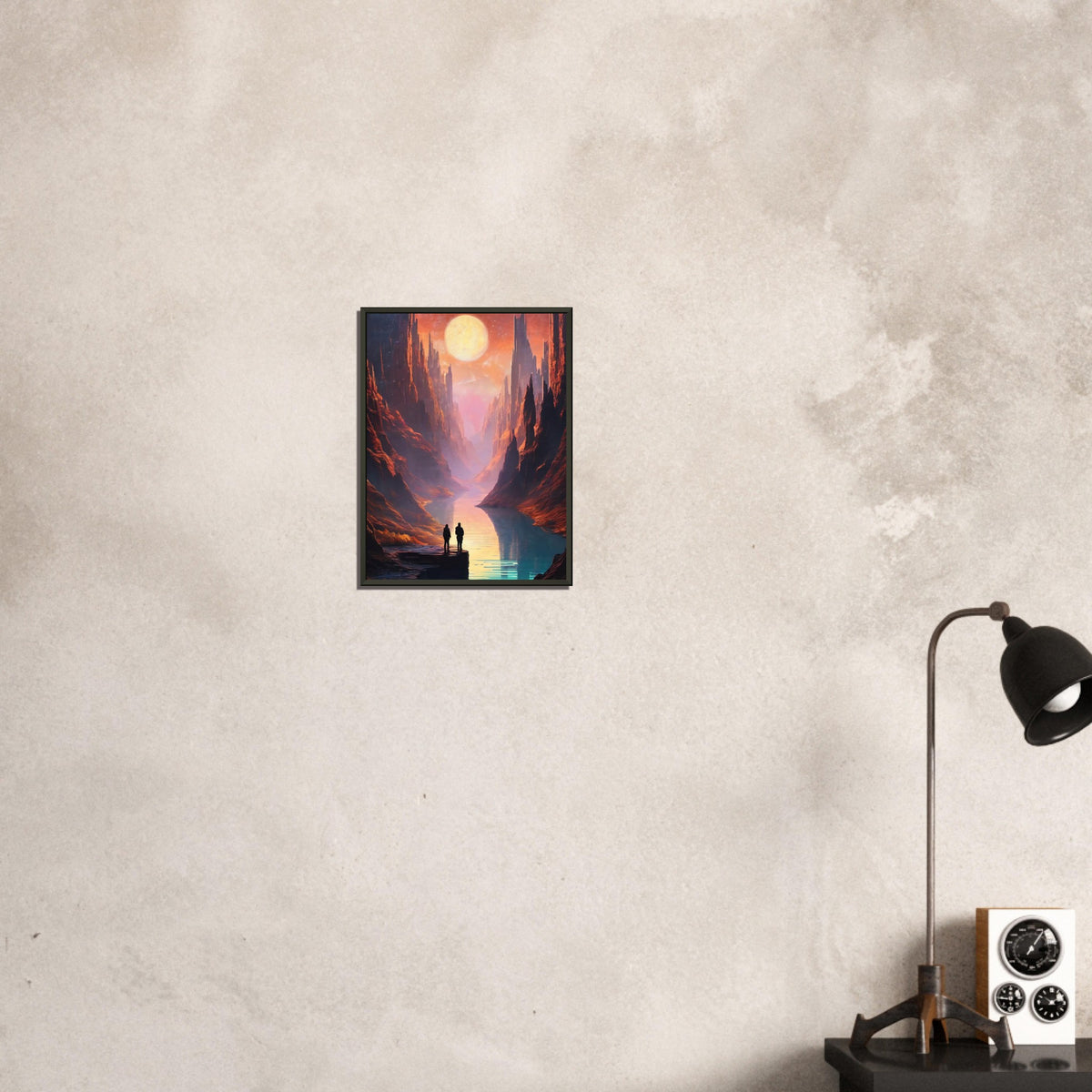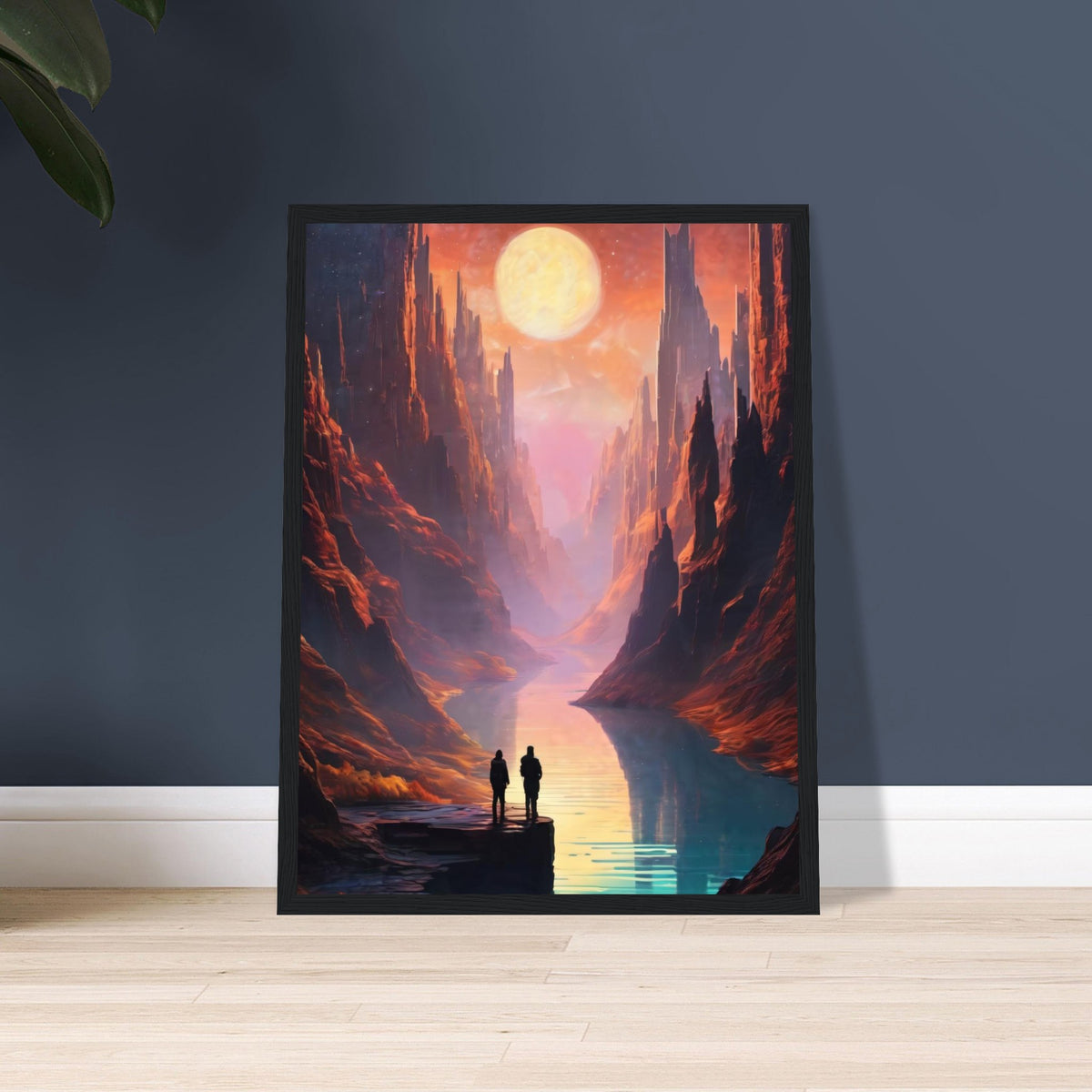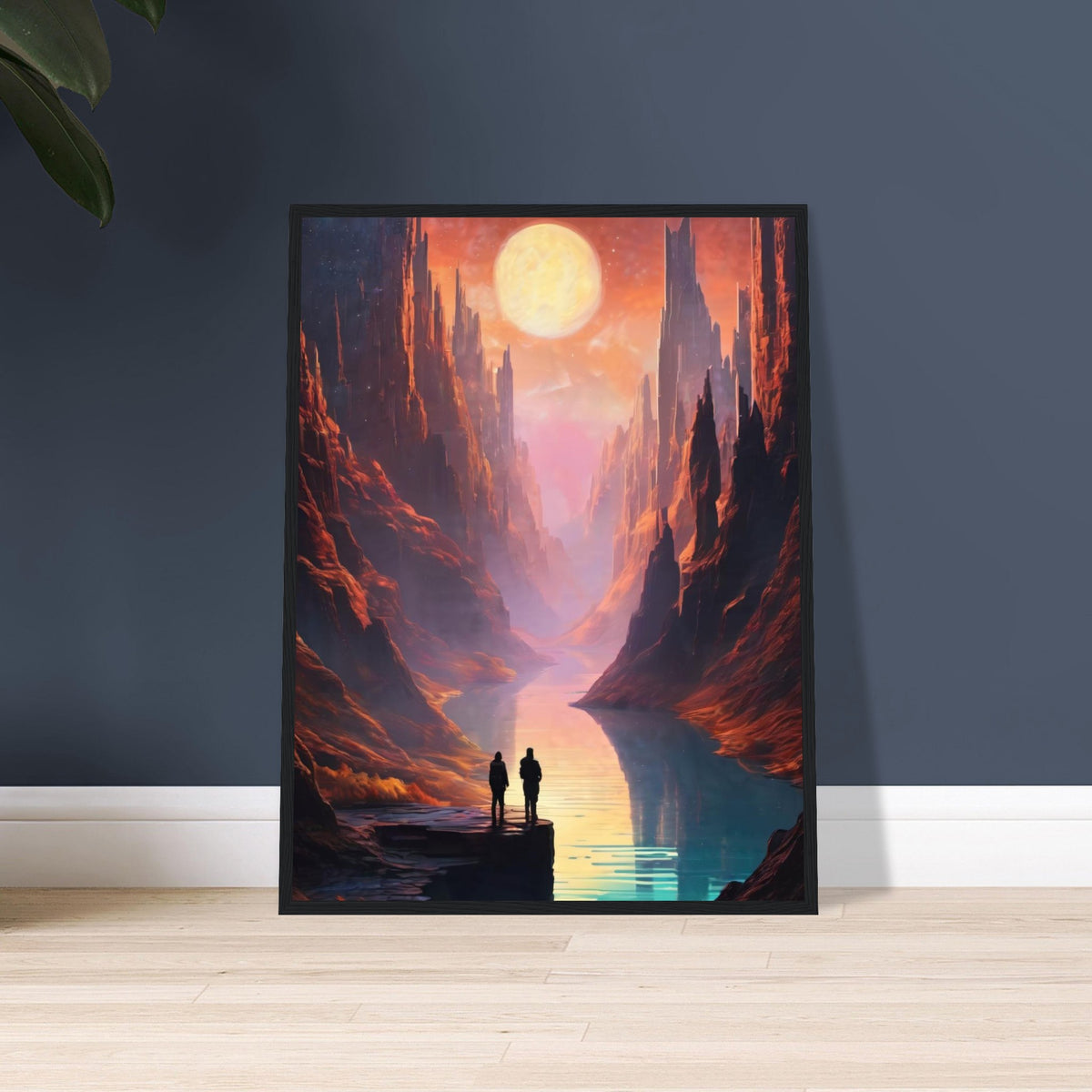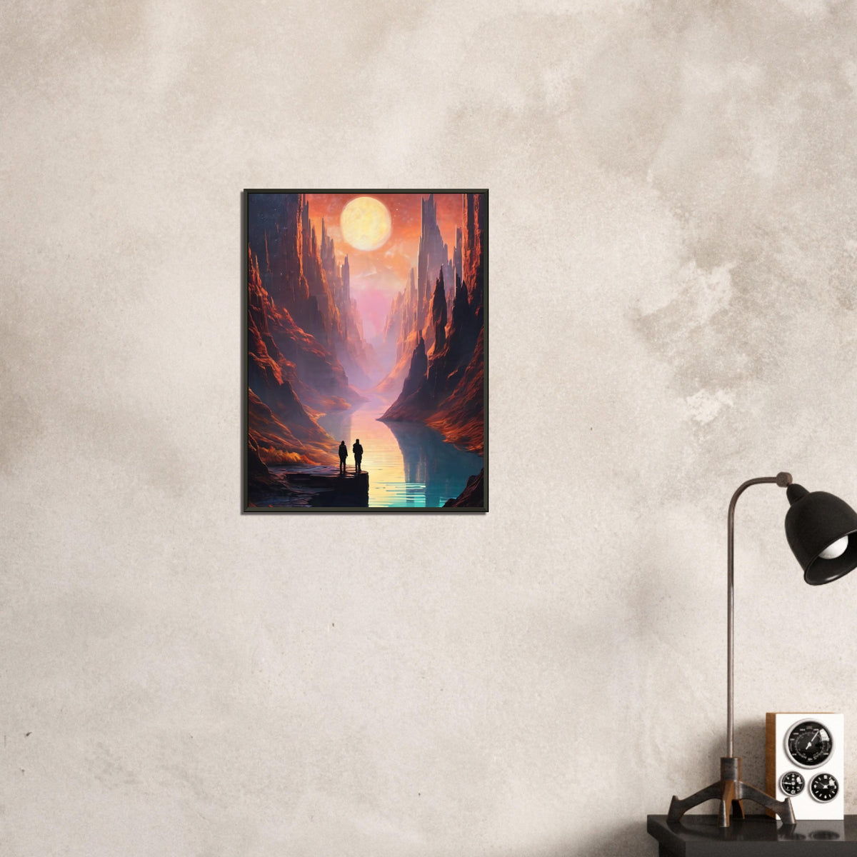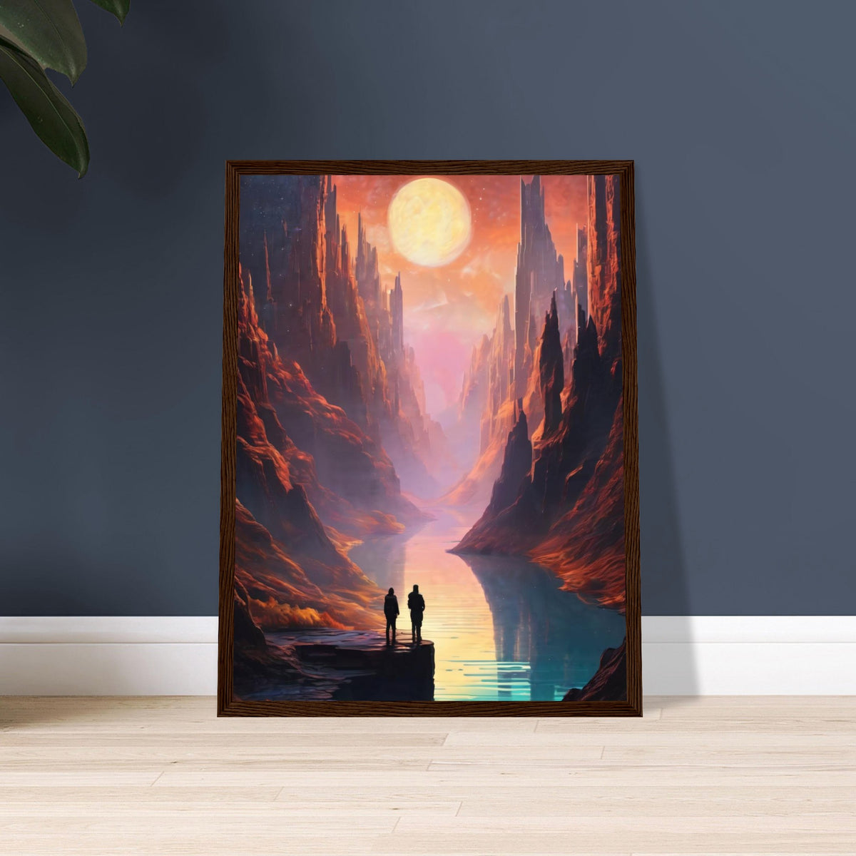 Two figures stand upon a rocky ledge, their silhouettes framed against a canyon bathed in the glow of a vast, luminous moon. Jagged cliffs rise steeply on either side, their surfaces painted in warm hues of orange, rose, and violet as the sky shifts from deep indigo to soft pastels at the horizon. Below, a tranquil river winds through the gorge, its surface mirroring both the cliffs and the celestial light above. The atmosphere is dreamlike yet grounded, a moment of quiet wonder where human presence feels small against the immensity of stone, water, and sky. Moonlit Passage captures the essence of journey and discovery, where companionship meets the sublime beauty of the unknown.