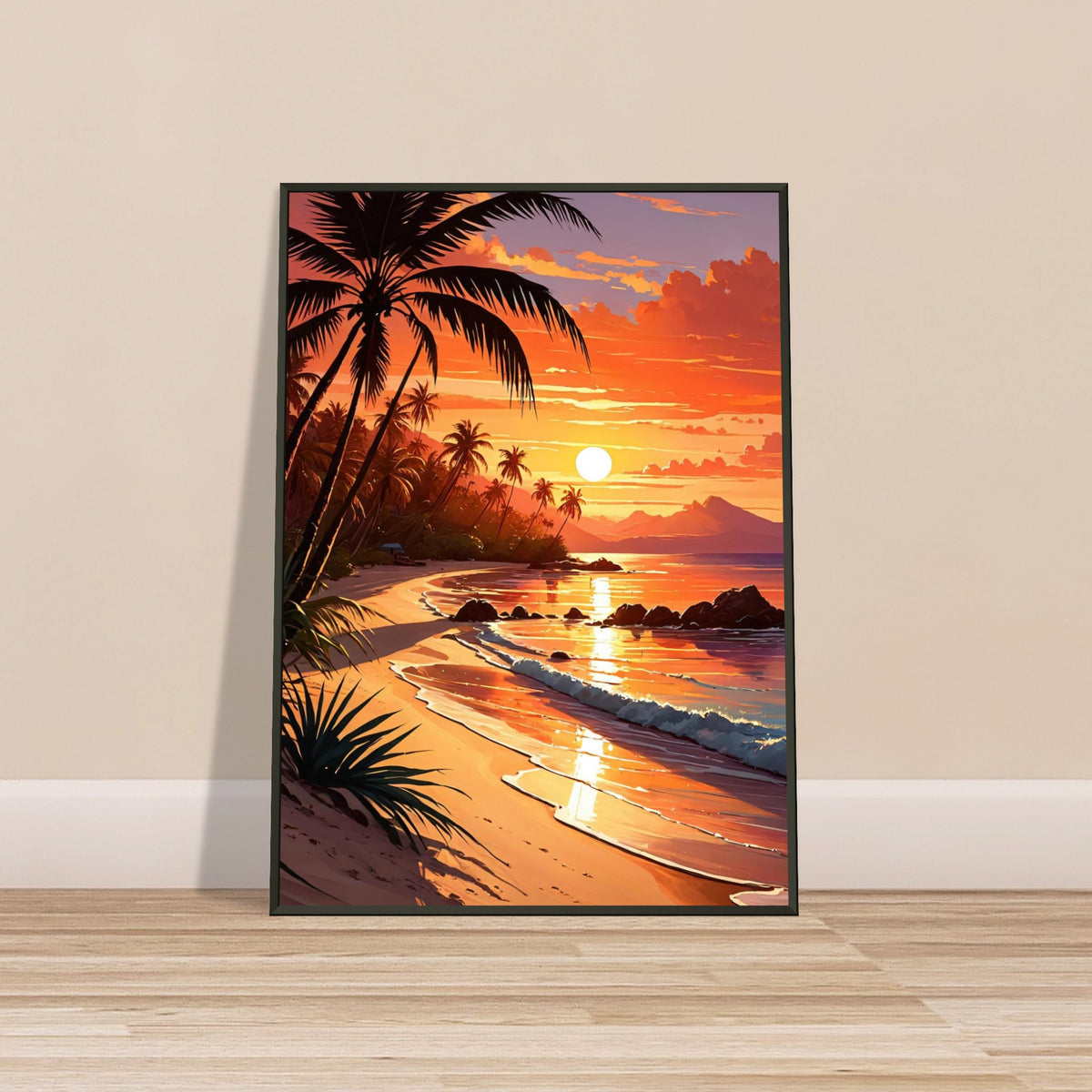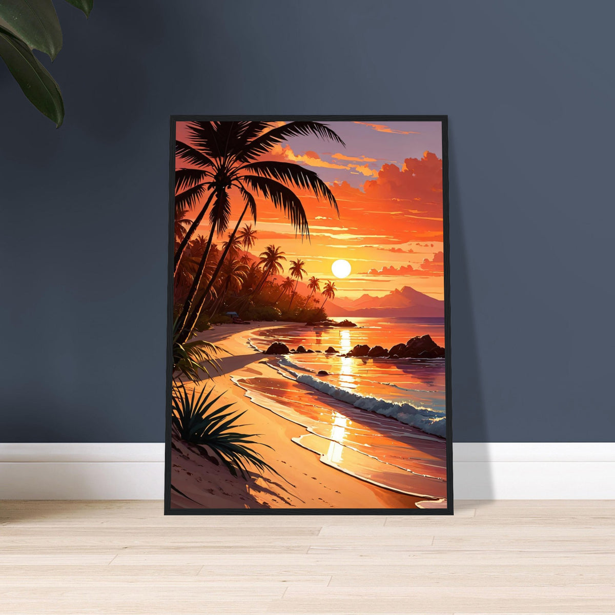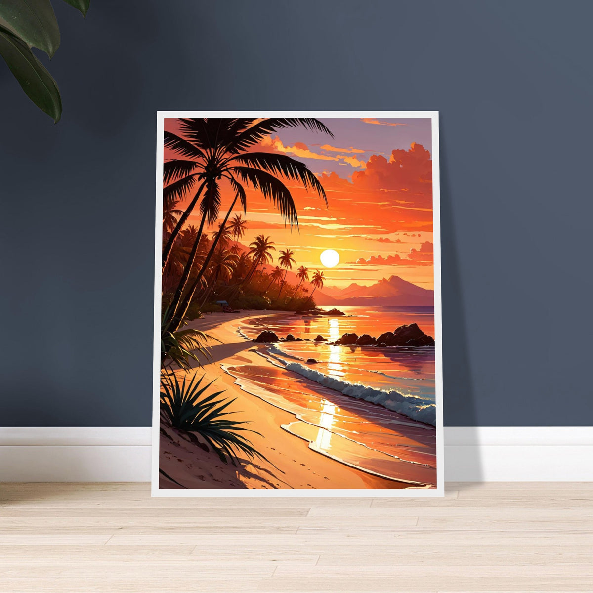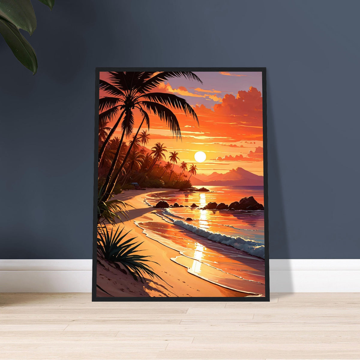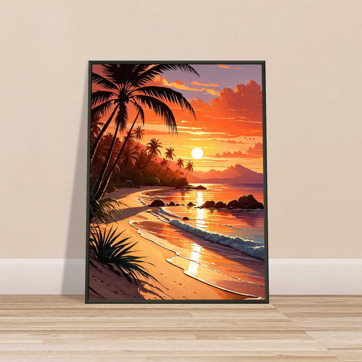 Shores of the Ember Sky captures the tranquil majesty of a tropical sunset at its most cinematic—where light, land, and sea align in a moment meant to be savored.