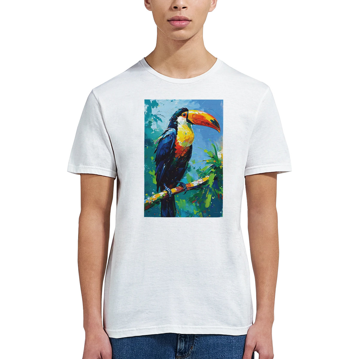 Perched gracefully on fabric instead of canvas, the toucan’s vivid plumage bursts into life — a brilliant orange beak, golden chest, and deep indigo feathers shimmering against painterly foliage. Every brushstroke of sky and leaf is carried forward in cinematic detail, transforming color itself into motion.