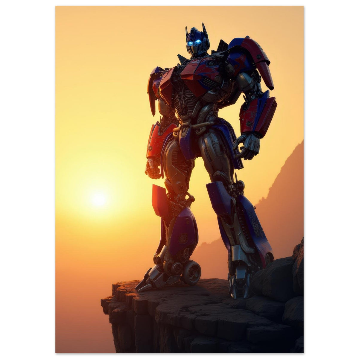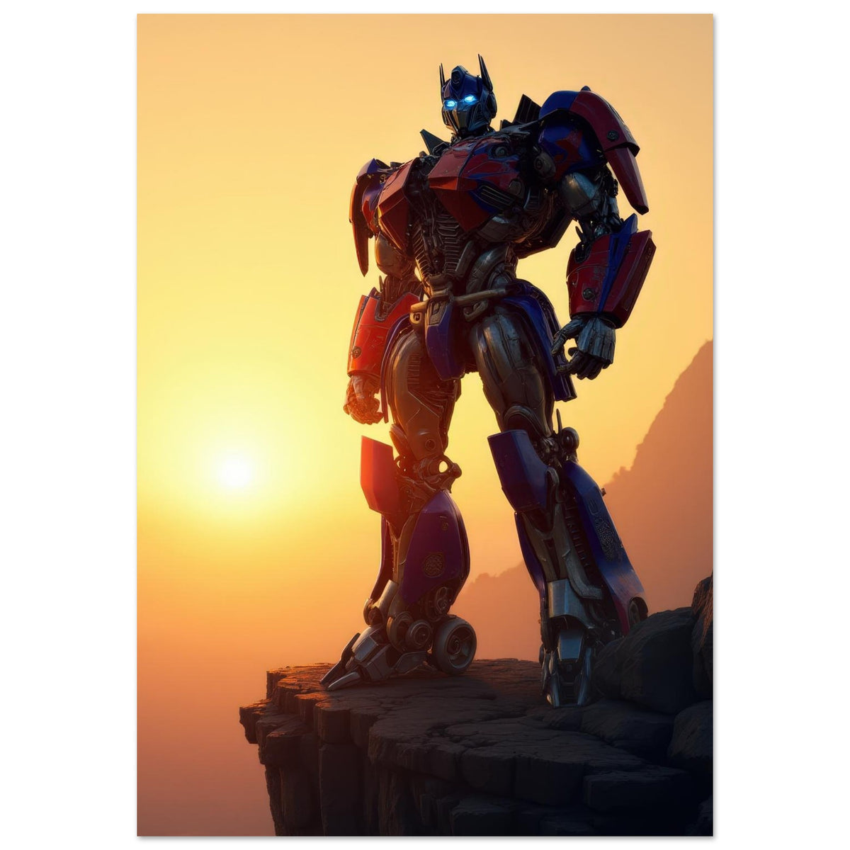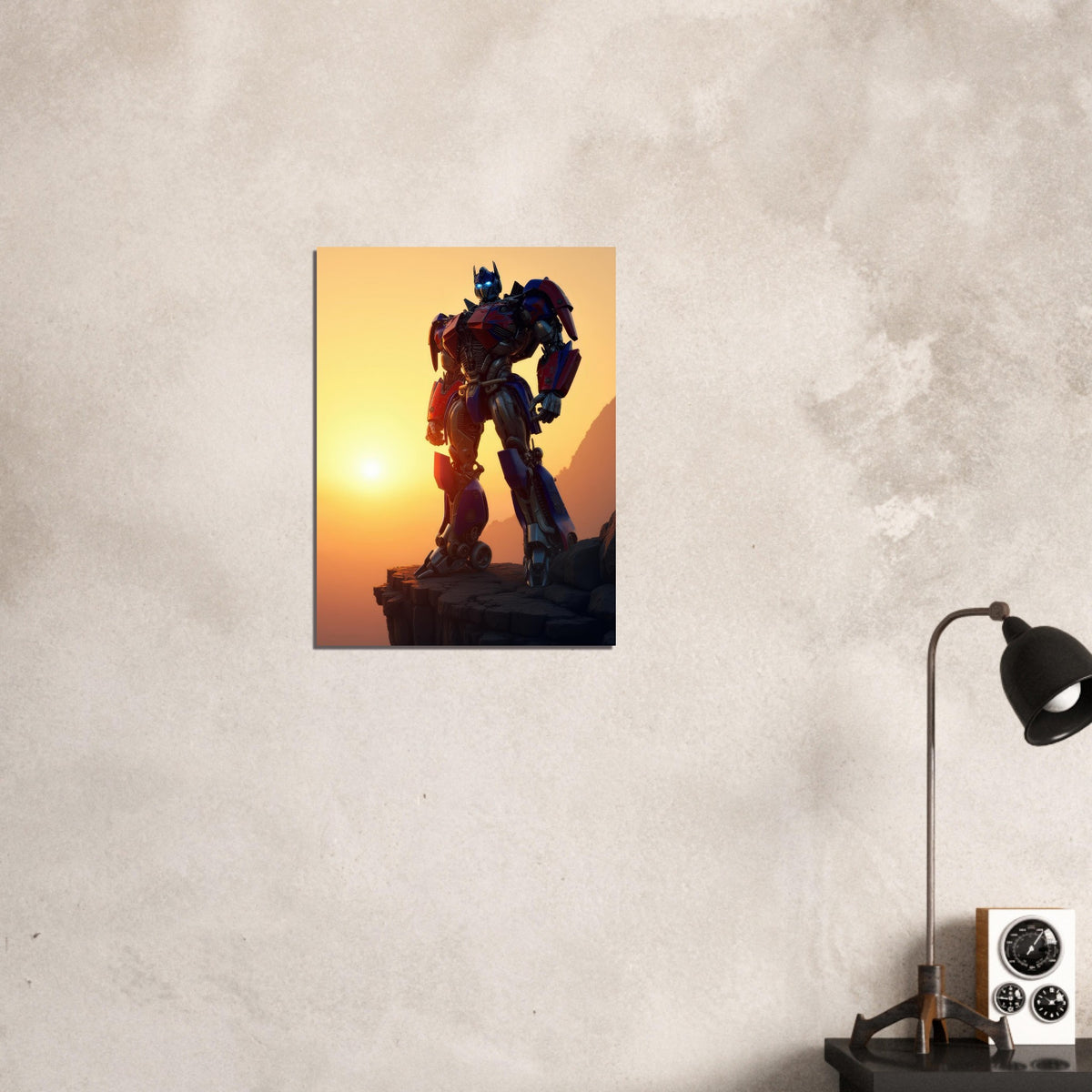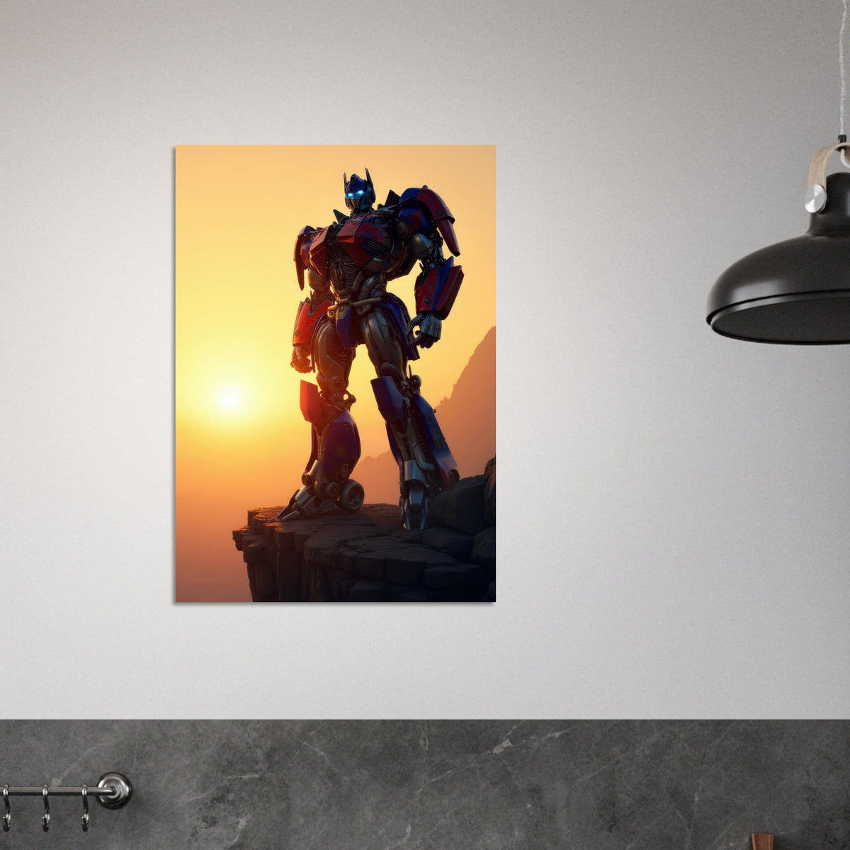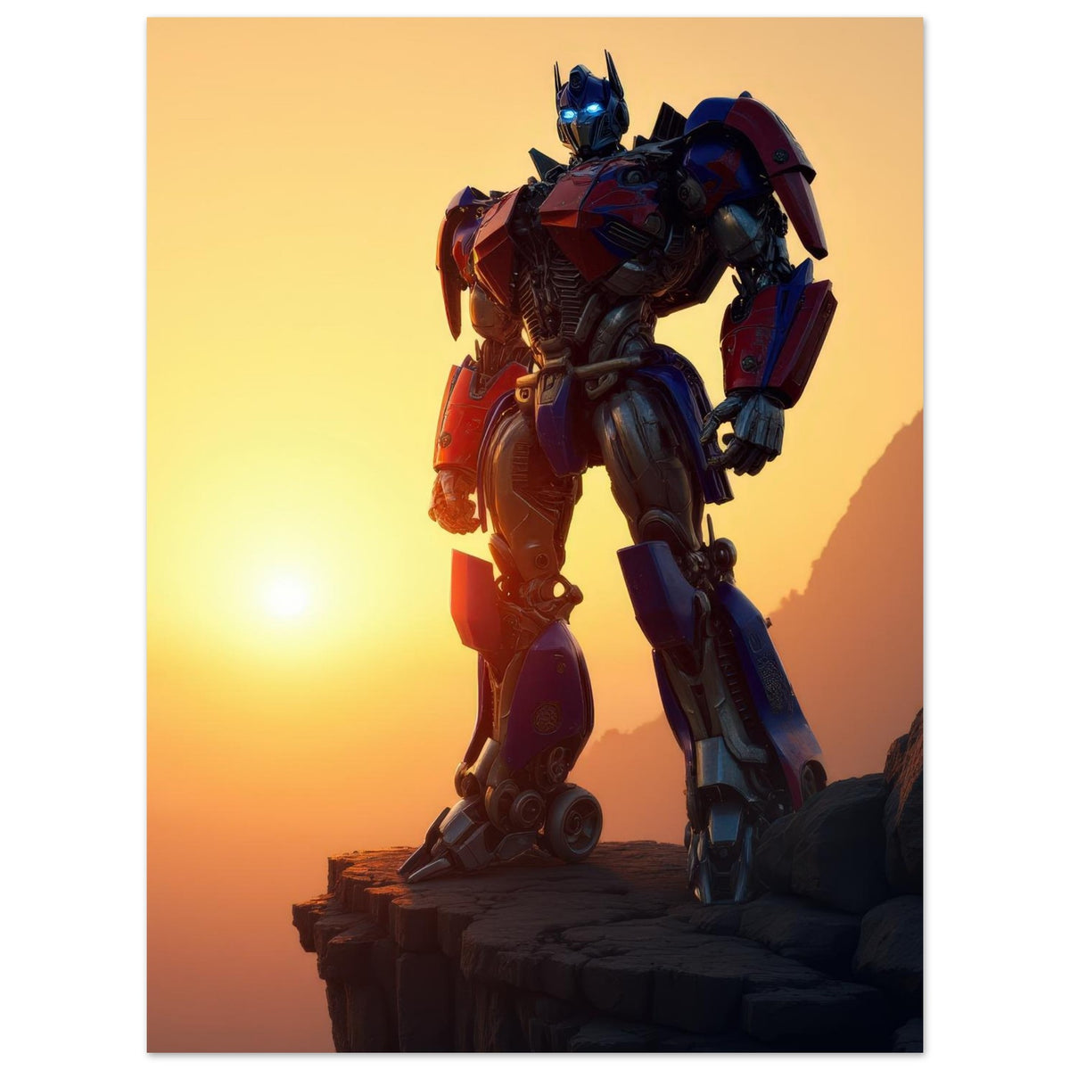 Standing at the edge of a cliff as the sun sets behind shattered mountains, a towering figure of metal and resolve surveys the horizon. His armor gleams in red, blue, and silver — battle-worn but unbowed. Eyes aglow with purpose, weapon at the ready, he is more than a machine: he is a symbol. Known as The Last Prime, he carries the weight of a dying world and the hope of its rebirth. This piece captures the essence of Optimus Prime — noble, unyielding, and forged for sacrifice.
