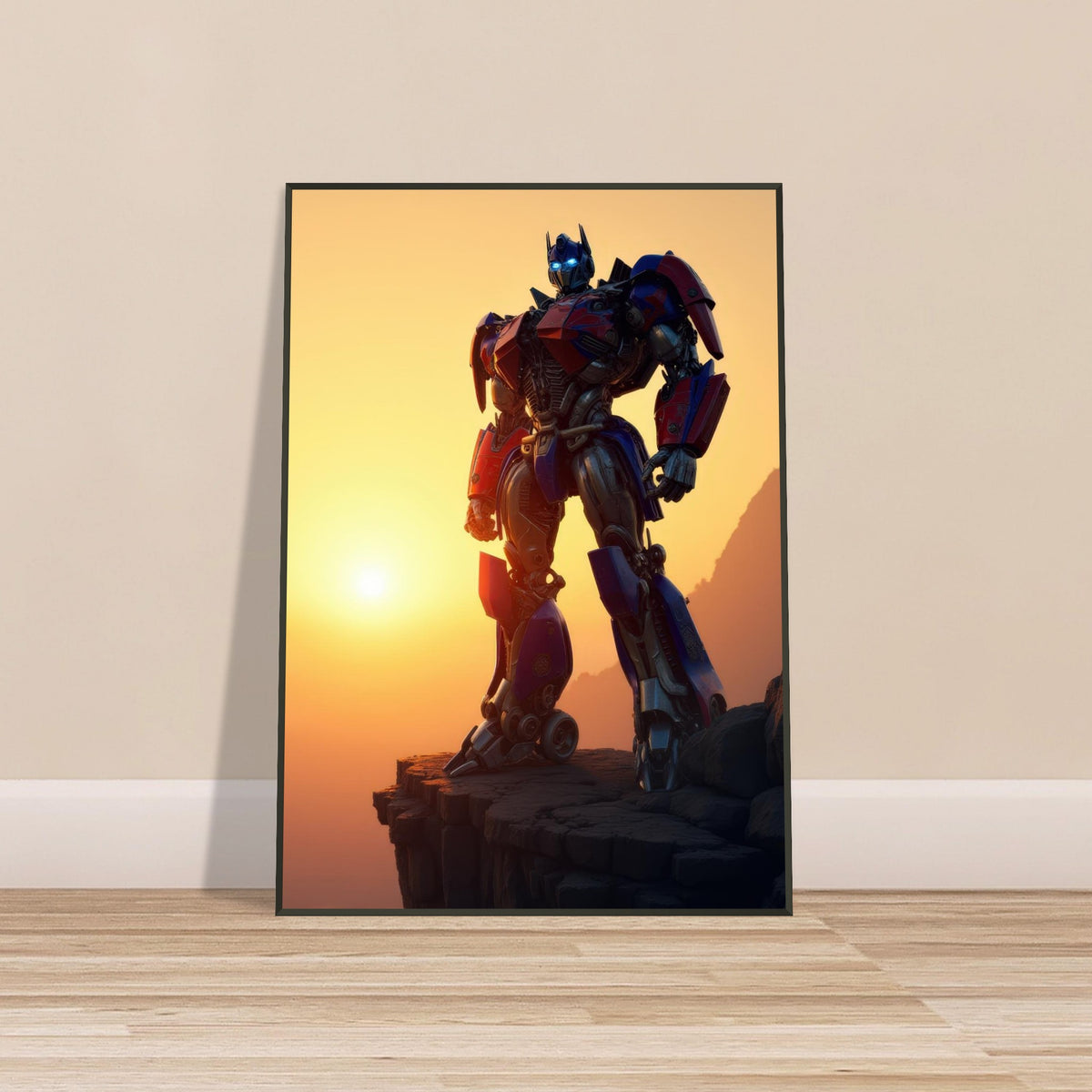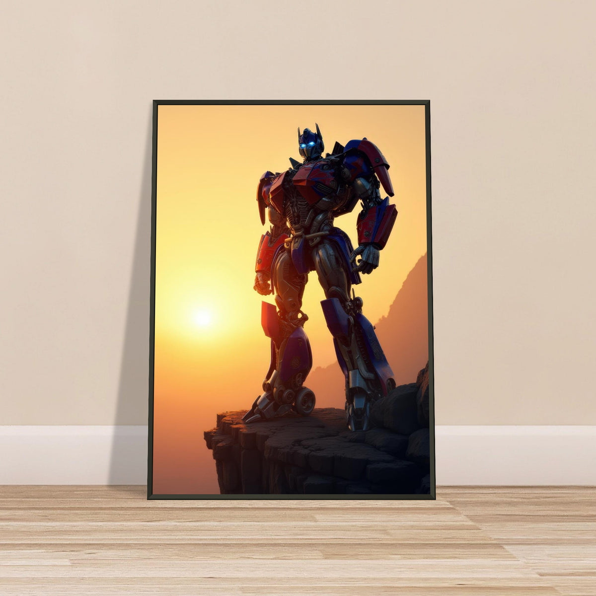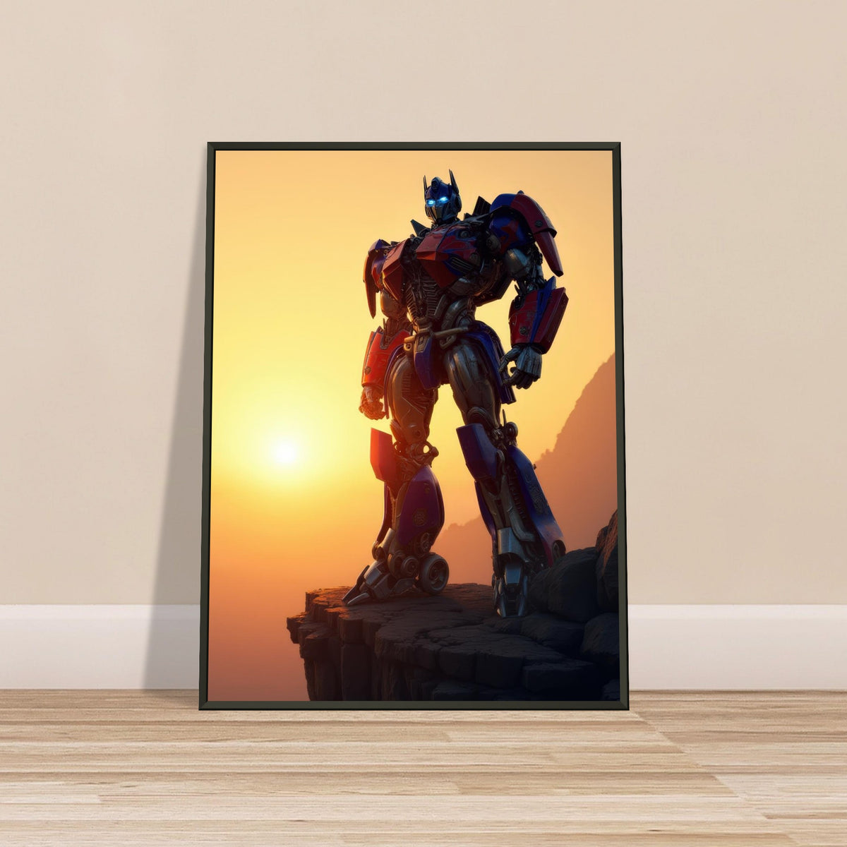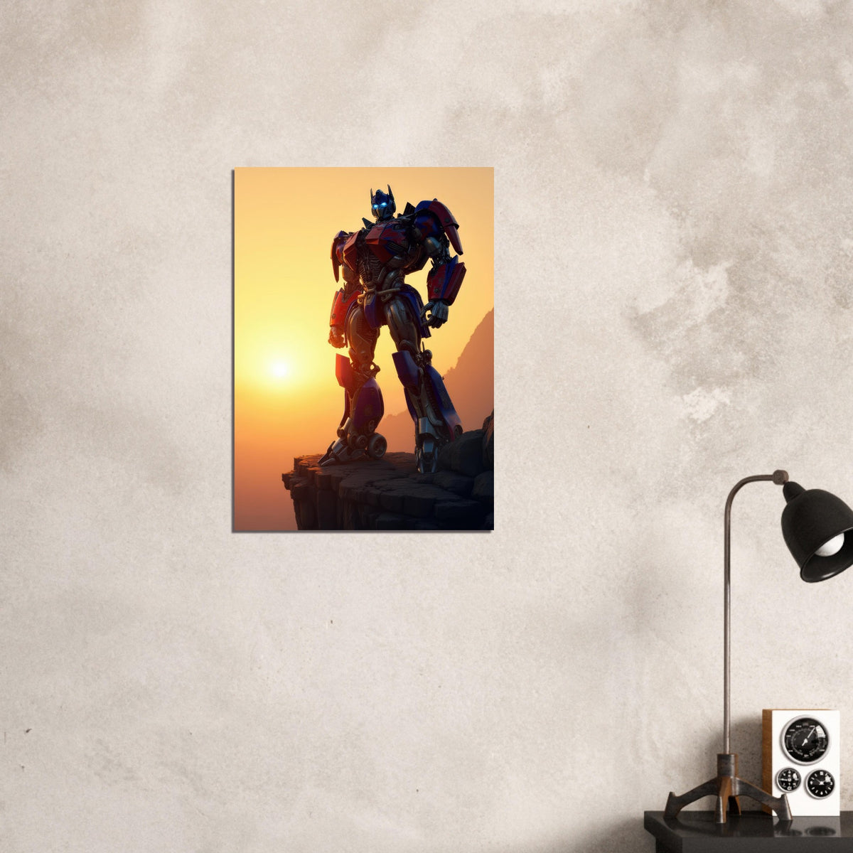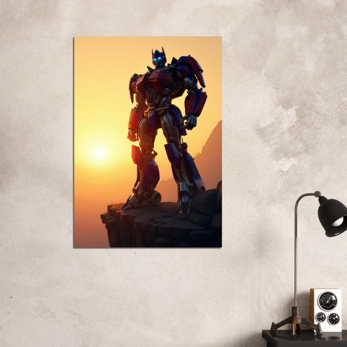 Standing at the edge of a cliff as the sun sets behind shattered mountains, a towering figure of metal and resolve surveys the horizon. His armor gleams in red, blue, and silver — battle-worn but unbowed. Eyes aglow with purpose, weapon at the ready, he is more than a machine: he is a symbol. Known as The Last Prime, he carries the weight of a dying world and the hope of its rebirth. This piece captures the essence of Optimus Prime — noble, unyielding, and forged for sacrifice.
