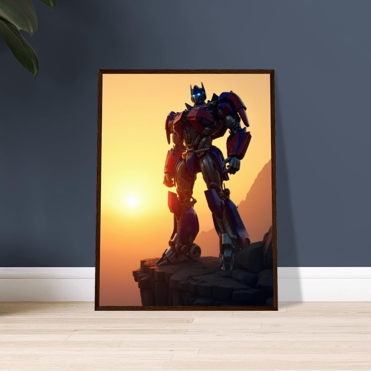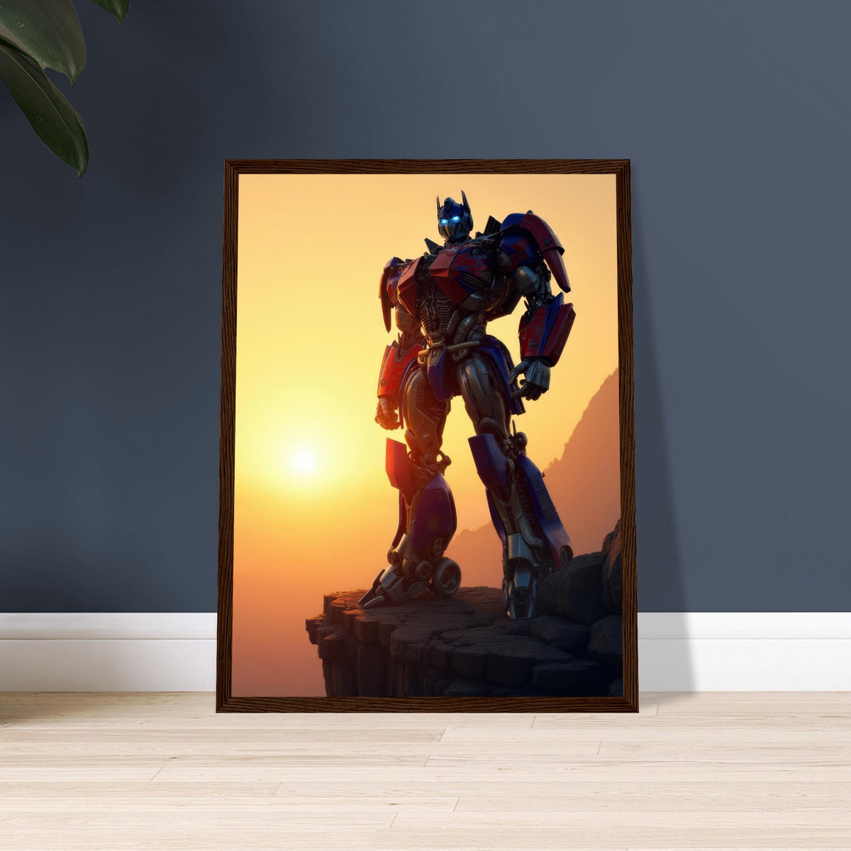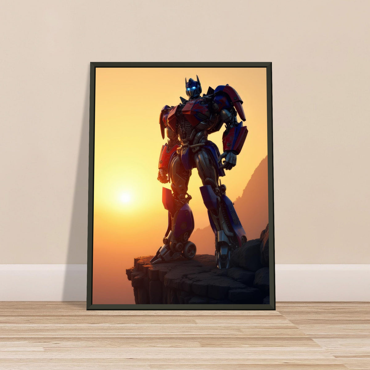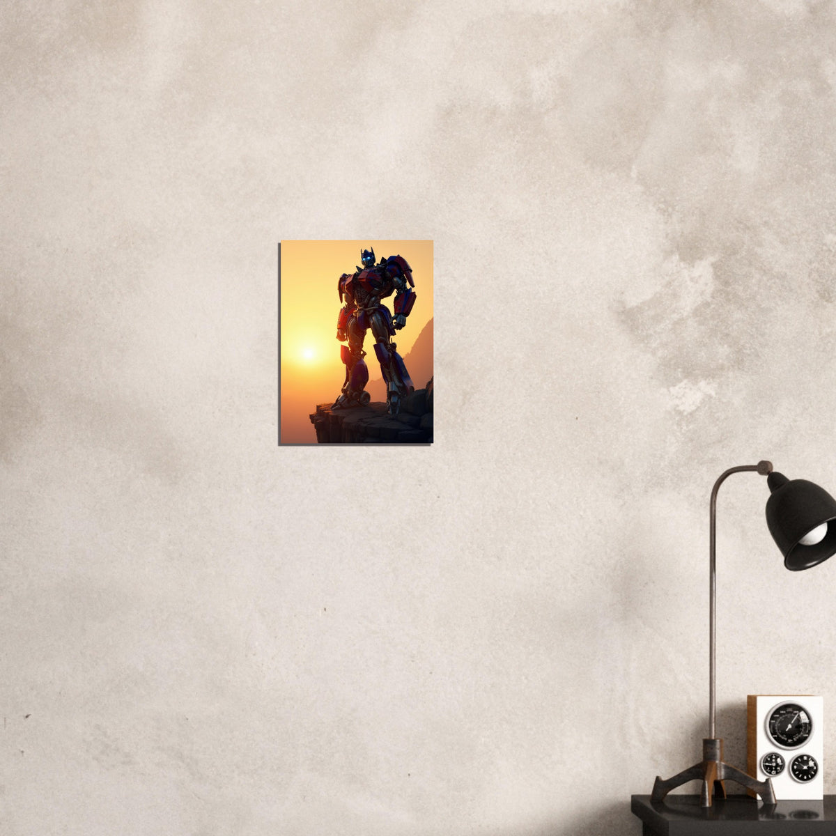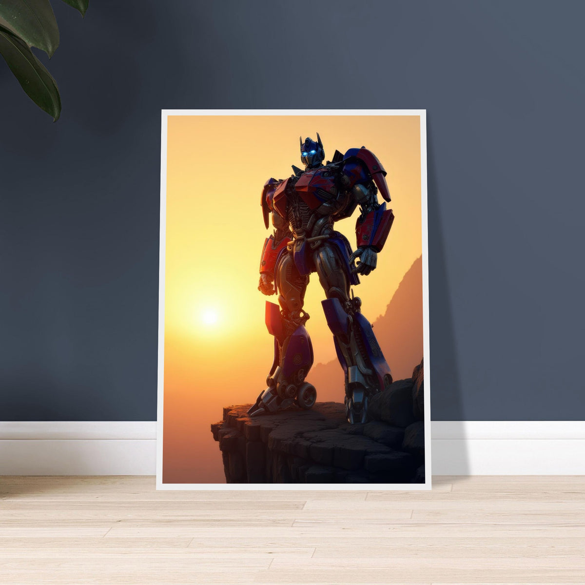 Standing at the edge of a cliff as the sun sets behind shattered mountains, a towering figure of metal and resolve surveys the horizon. His armor gleams in red, blue, and silver — battle-worn but unbowed. Eyes aglow with purpose, weapon at the ready, he is more than a machine: he is a symbol. Known as The Last Prime, he carries the weight of a dying world and the hope of its rebirth. This piece captures the essence of Optimus Prime — noble, unyielding, and forged for sacrifice.