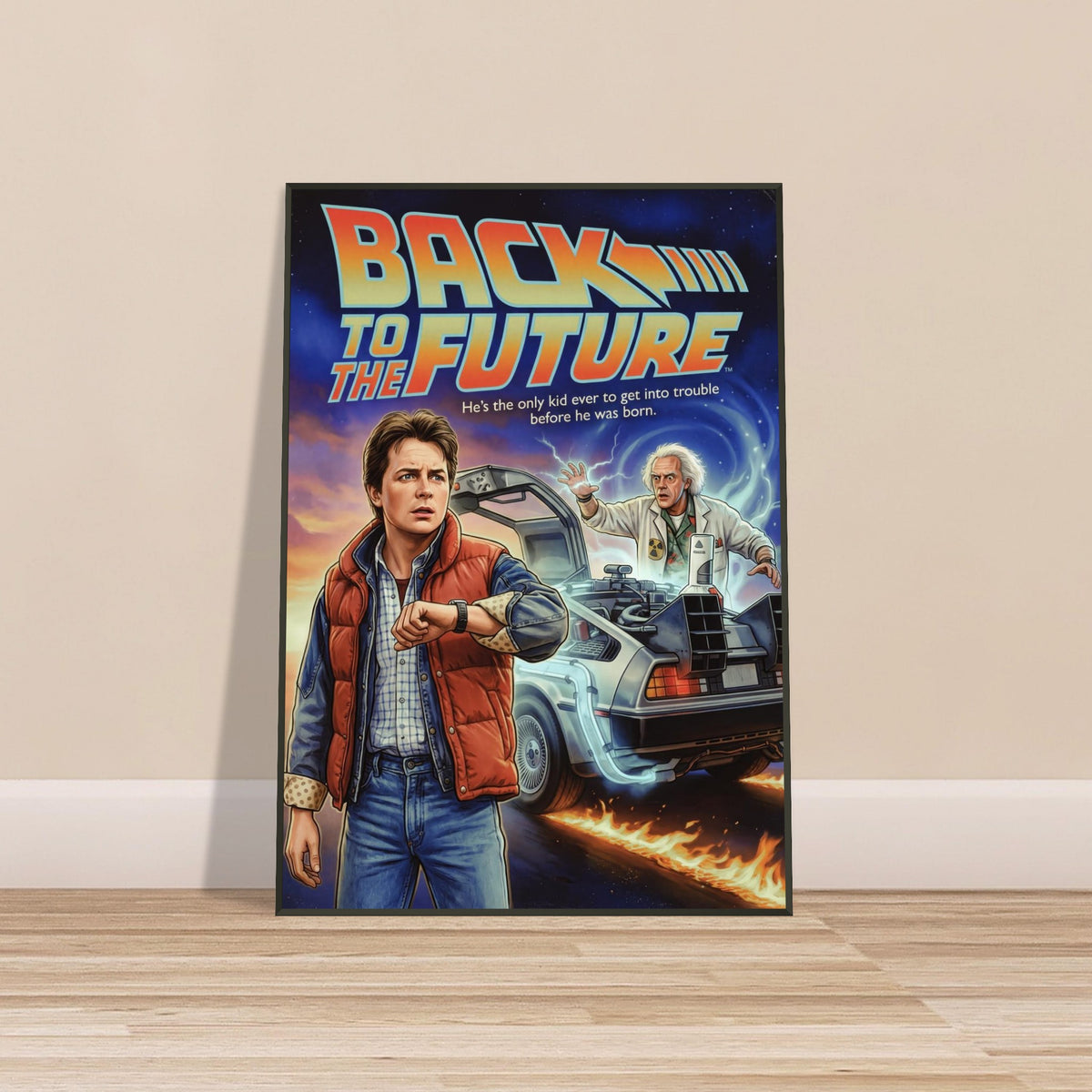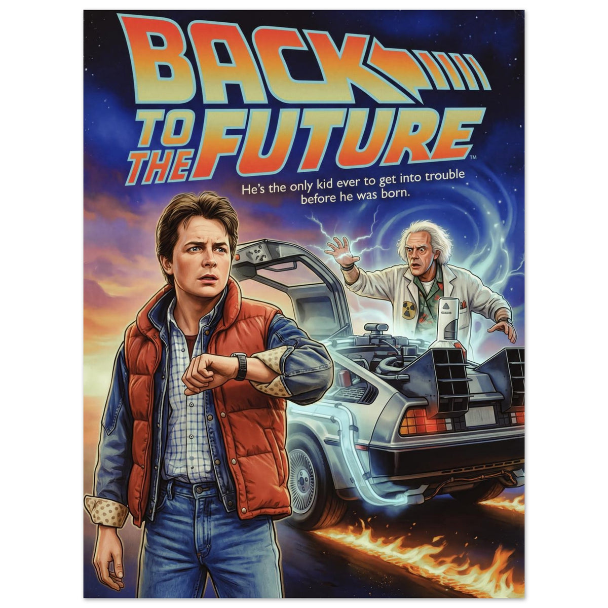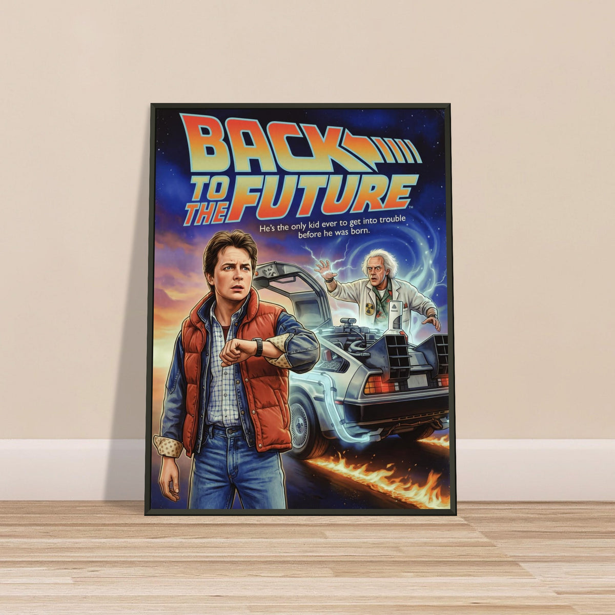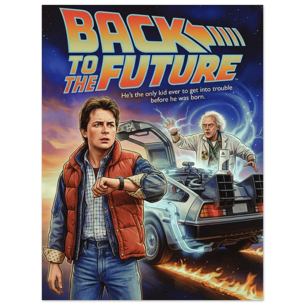 Beside him, Doc gestures with urgent certainty, alive with the reckless brilliance of a man who built the impossible and expects the universe to keep up. Between them rests the DeLorean, no longer just a machine, but a contradiction on wheels — proof that cause can arrive before consequence.