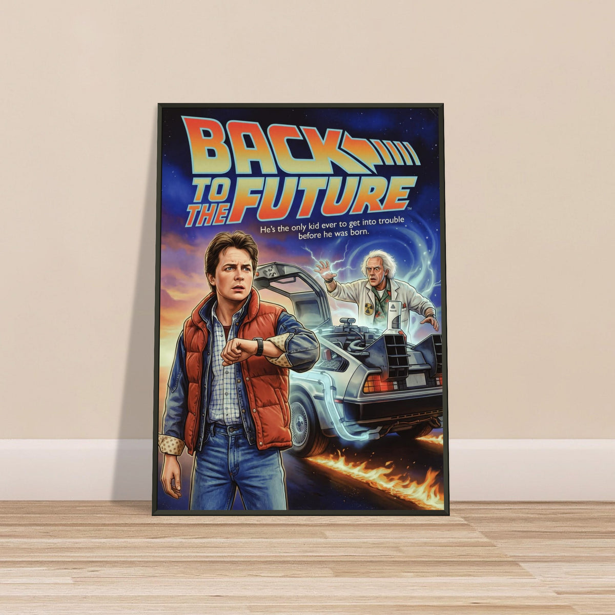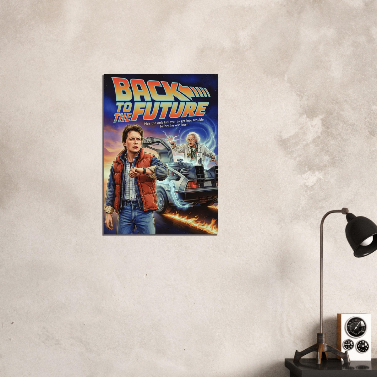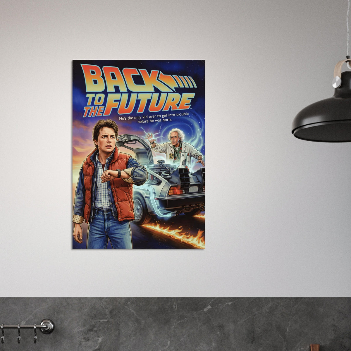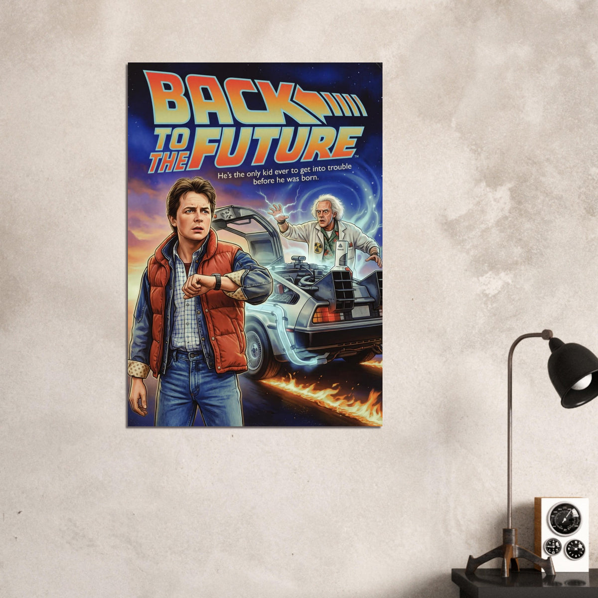 Beside him, Doc gestures with urgent certainty, alive with the reckless brilliance of a man who built the impossible and expects the universe to keep up. Between them rests the DeLorean, no longer just a machine, but a contradiction on wheels — proof that cause can arrive before consequence.