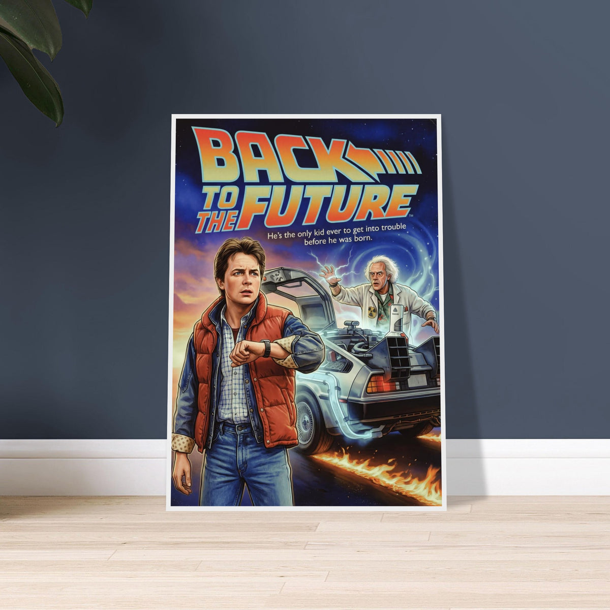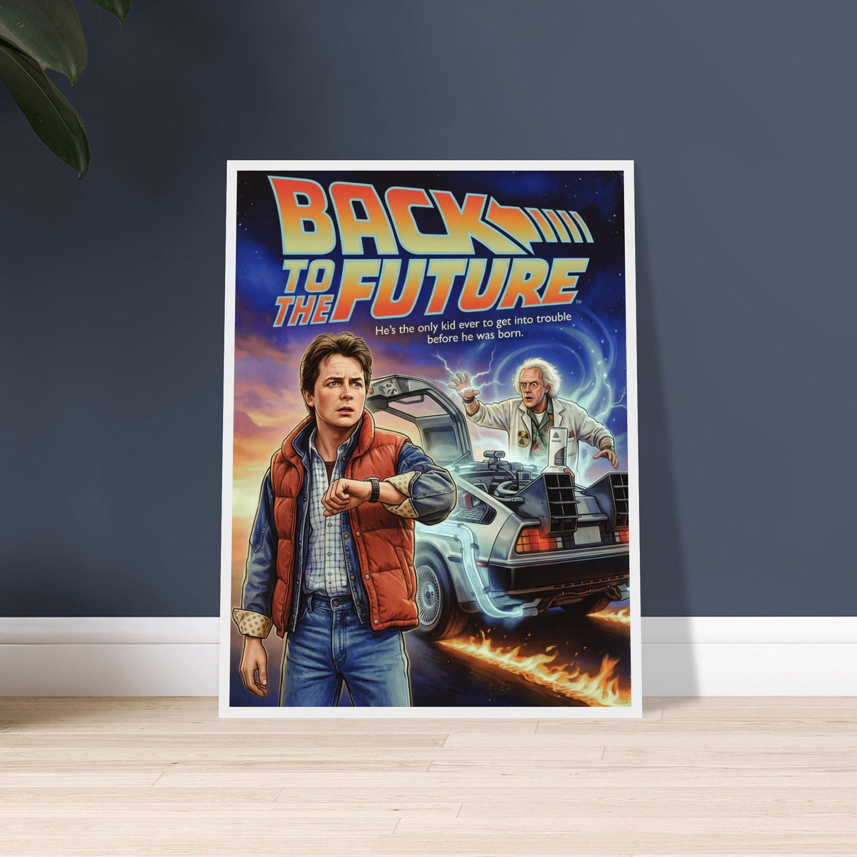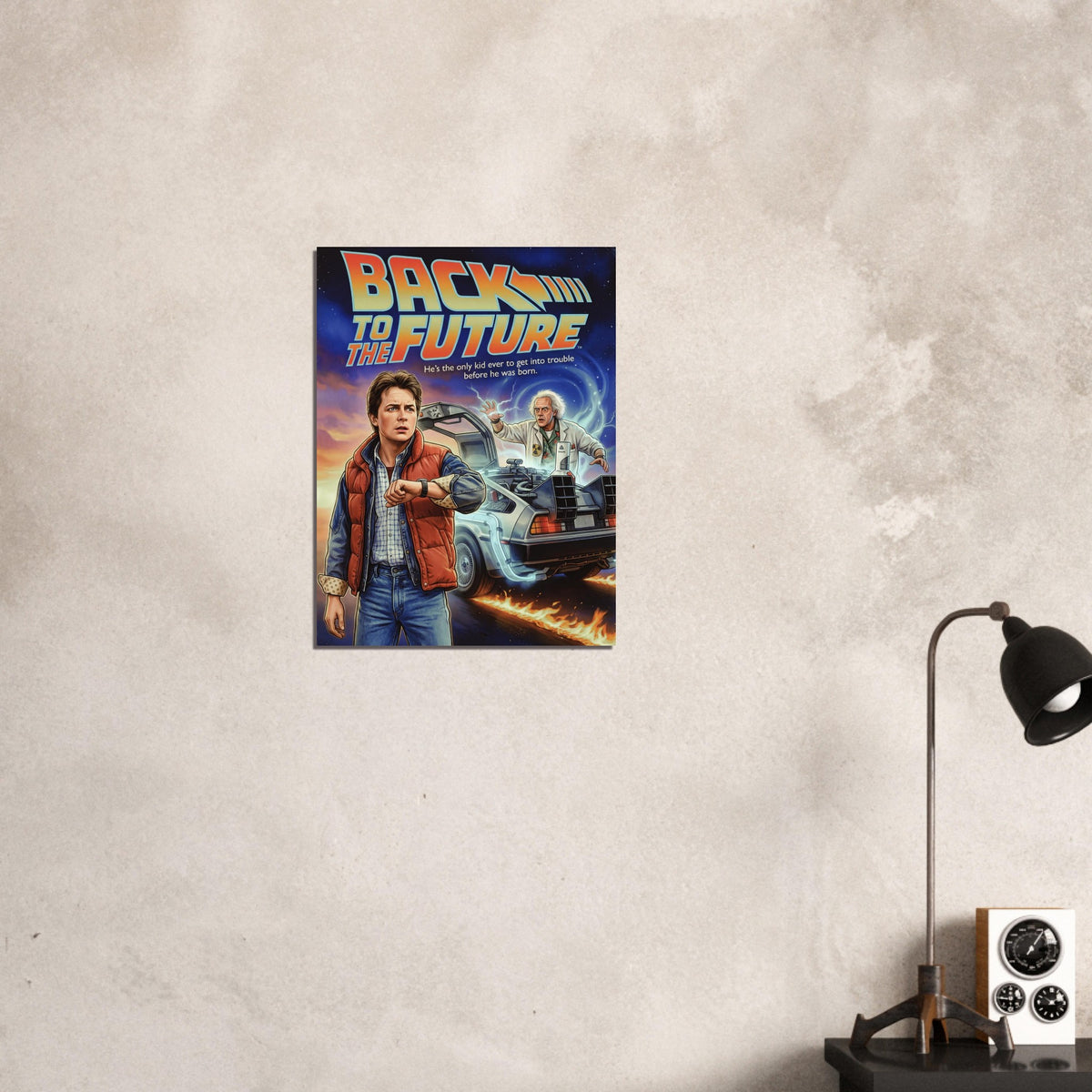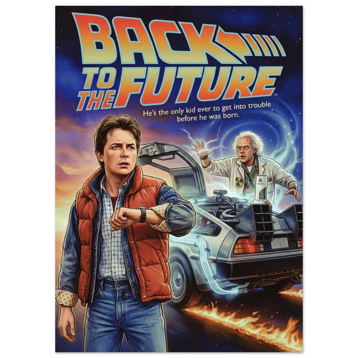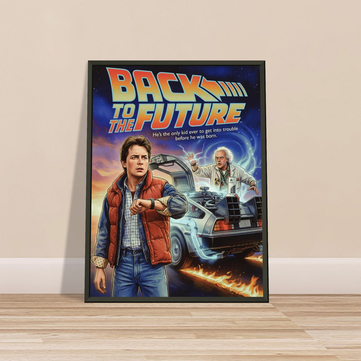 Beside him, Doc gestures with urgent certainty, alive with the reckless brilliance of a man who built the impossible and expects the universe to keep up. Between them rests the DeLorean, no longer just a machine, but a contradiction on wheels — proof that cause can arrive before consequence.