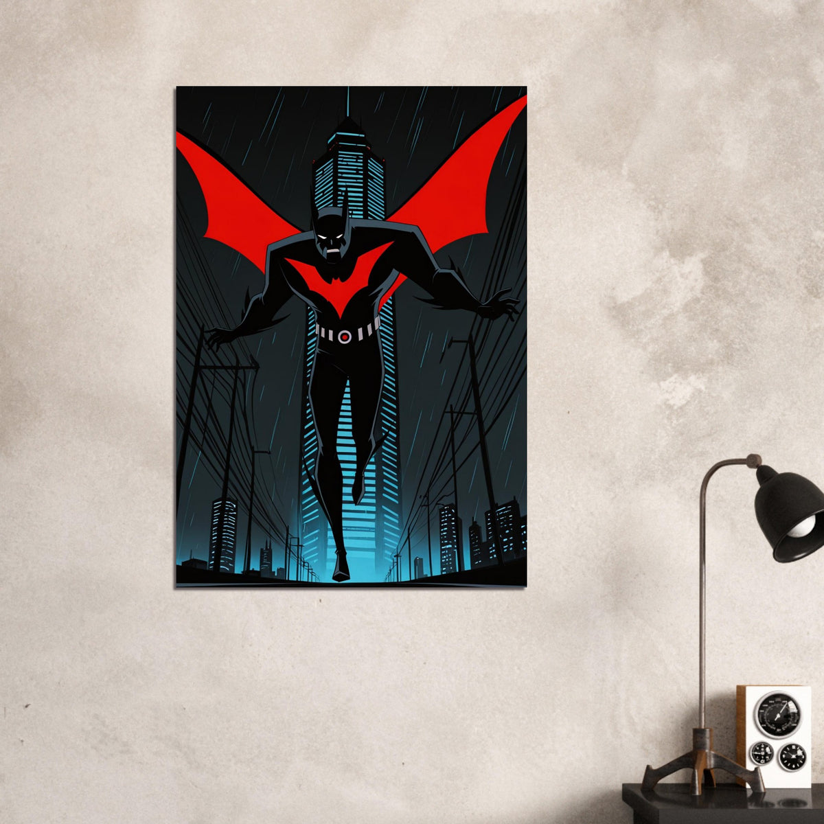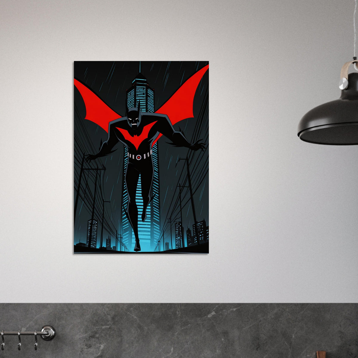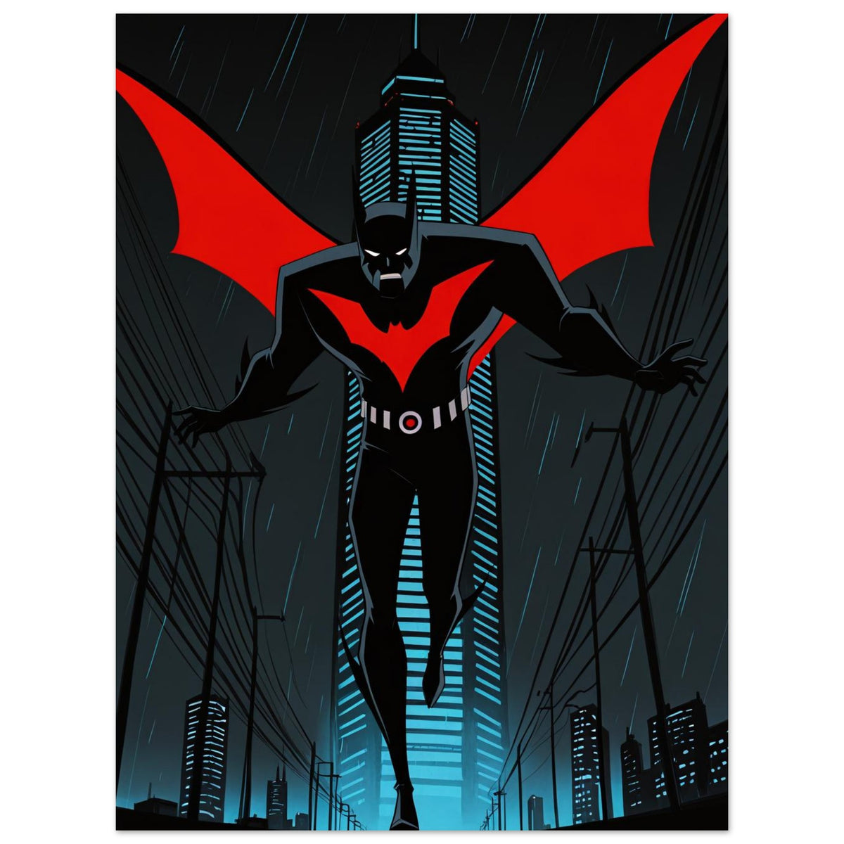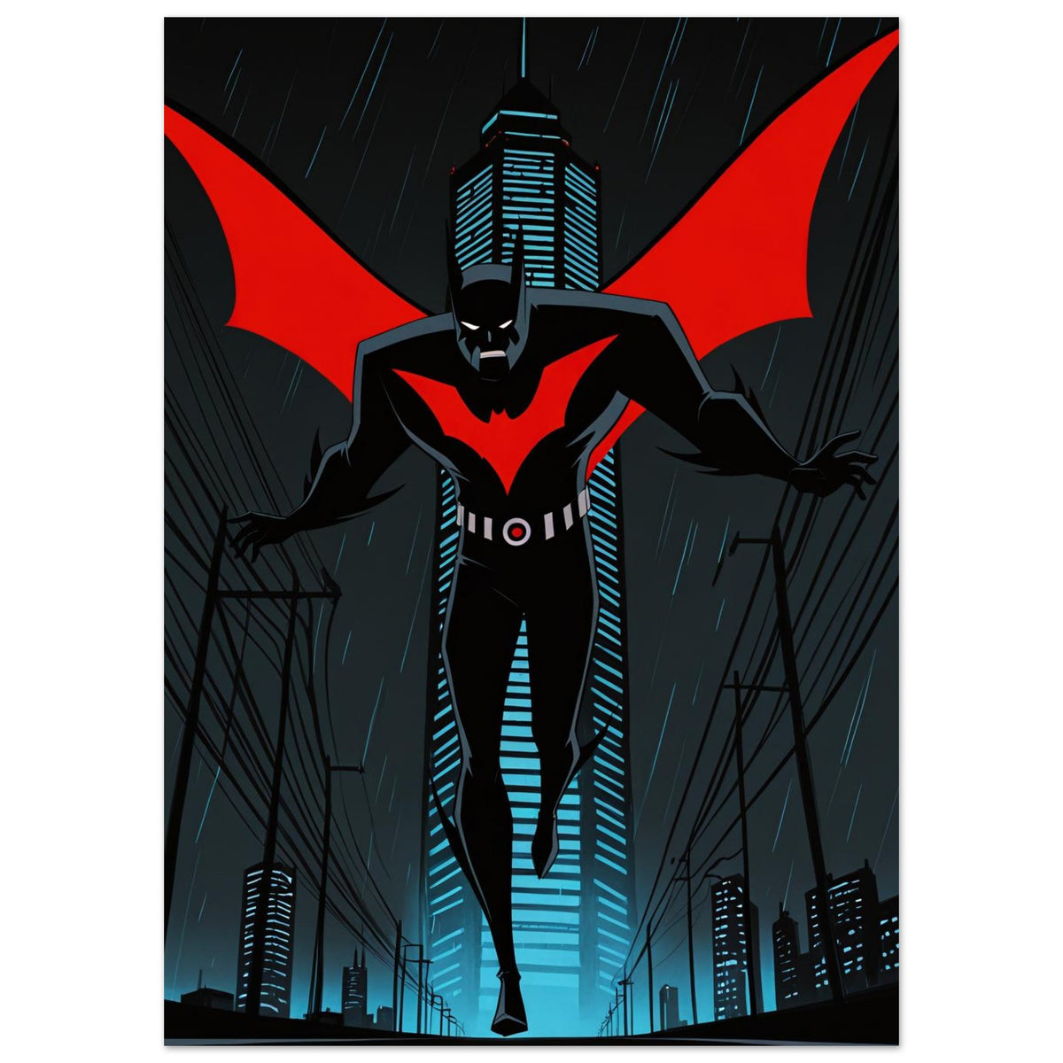 From above, Batman Beyond descends—Terry McGinnis moving through the air on wings of crimson light, the city’s neon reflecting off a suit engineered for speed, stealth, and survival. The black armor absorbs the darkness, while the red bat emblem burns sharply against it, a modern signal inherited from a legend who once ruled the night.