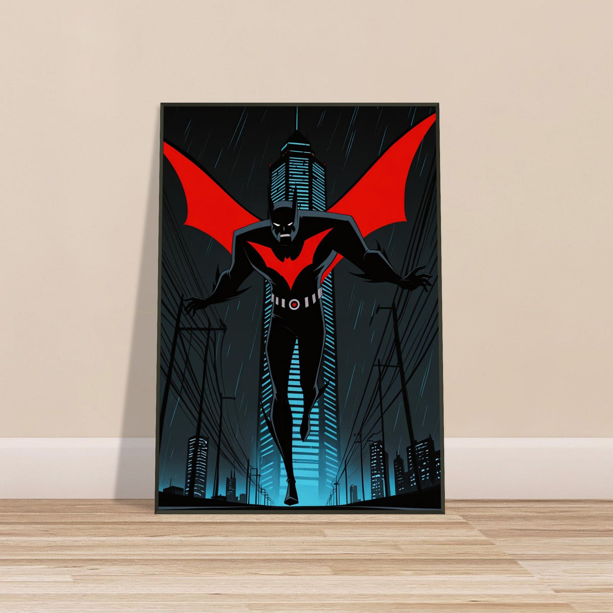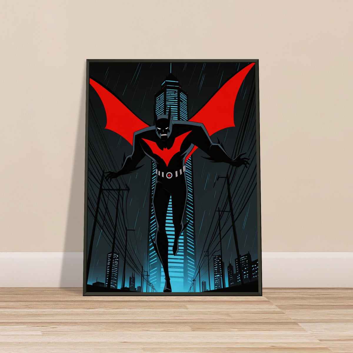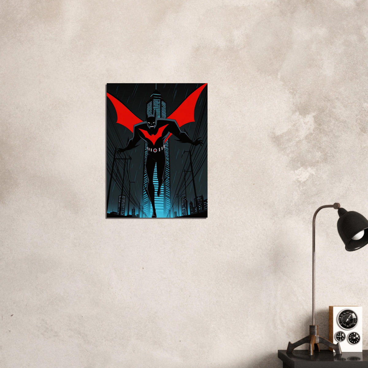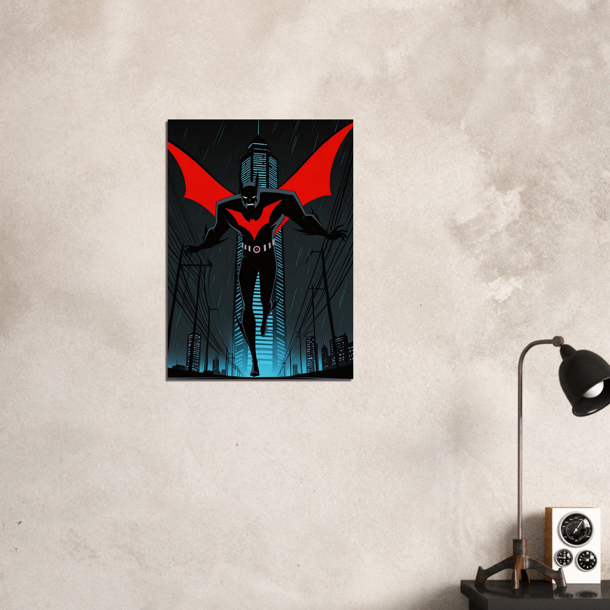 From above, Batman Beyond descends—Terry McGinnis moving through the air on wings of crimson light, the city’s neon reflecting off a suit engineered for speed, stealth, and survival. The black armor absorbs the darkness, while the red bat emblem burns sharply against it, a modern signal inherited from a legend who once ruled the night.
