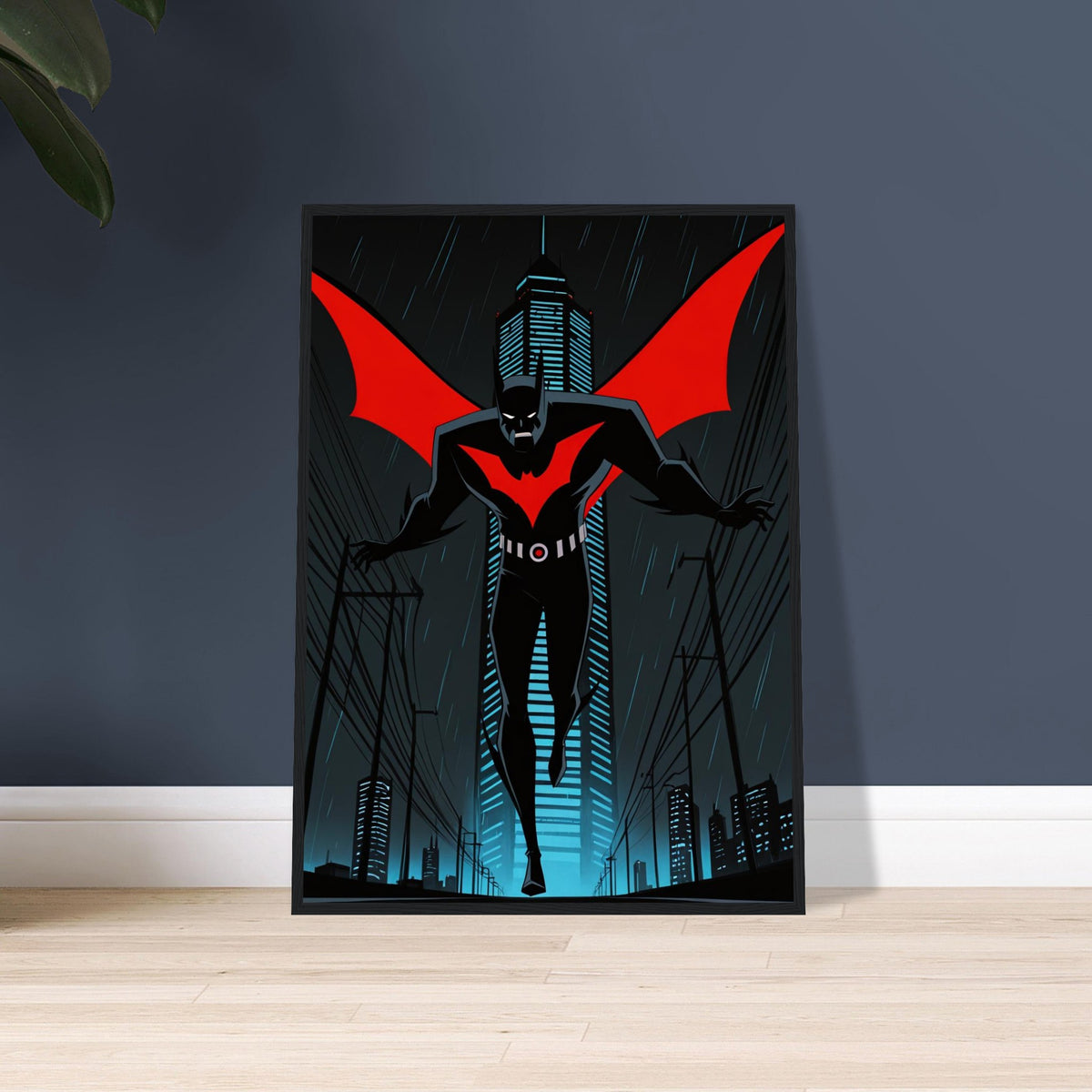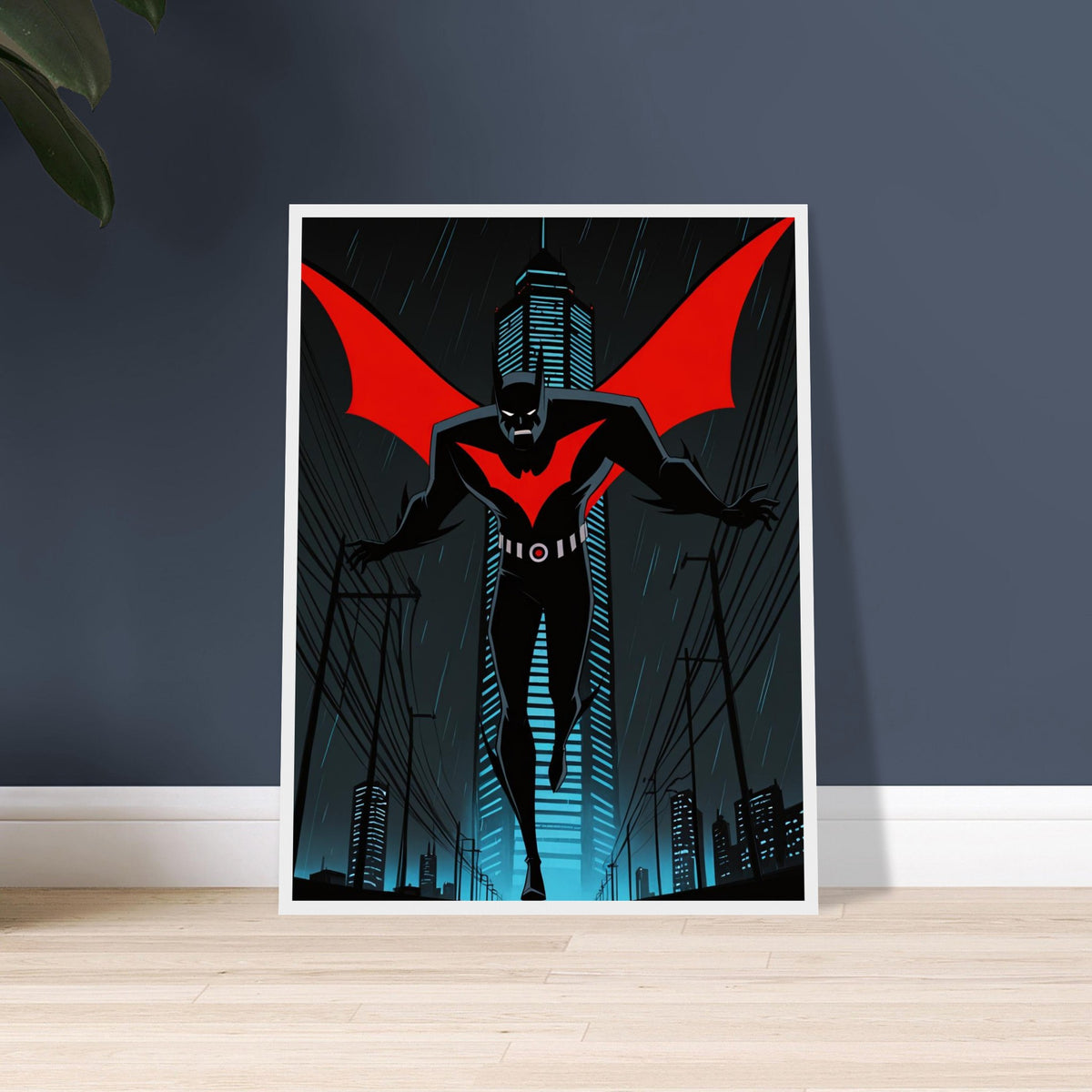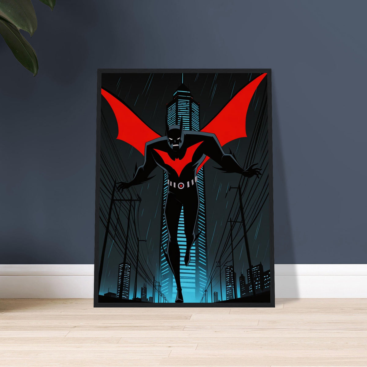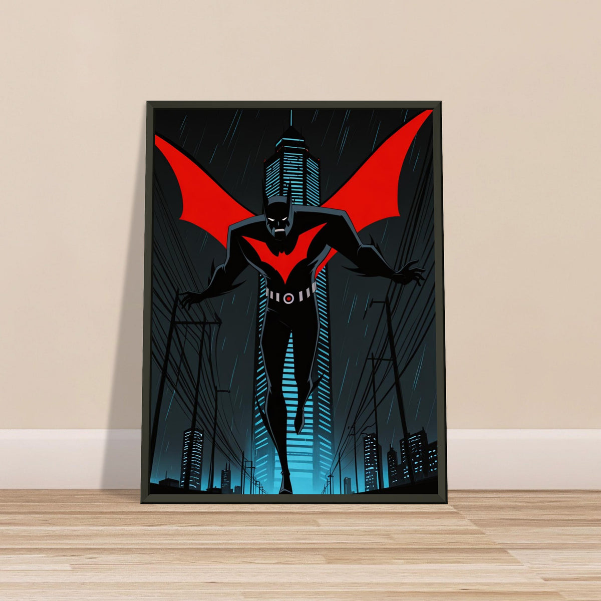 From above, Batman Beyond descends—Terry McGinnis moving through the air on wings of crimson light, the city’s neon reflecting off a suit engineered for speed, stealth, and survival. The black armor absorbs the darkness, while the red bat emblem burns sharply against it, a modern signal inherited from a legend who once ruled the night.