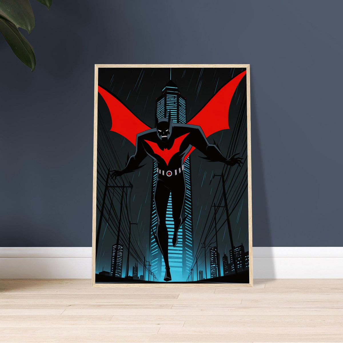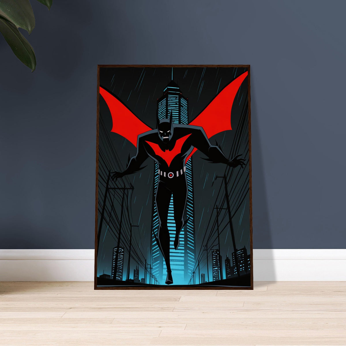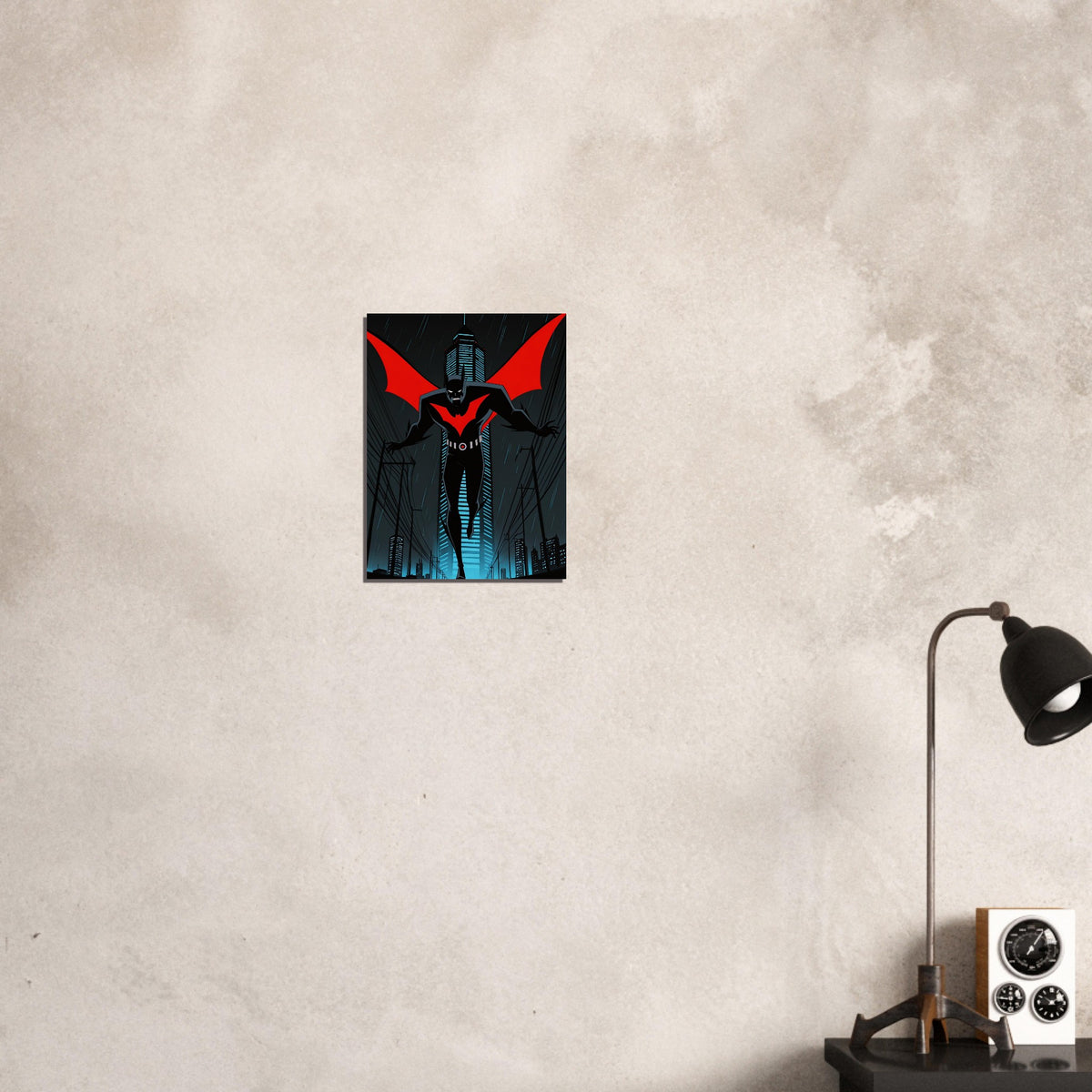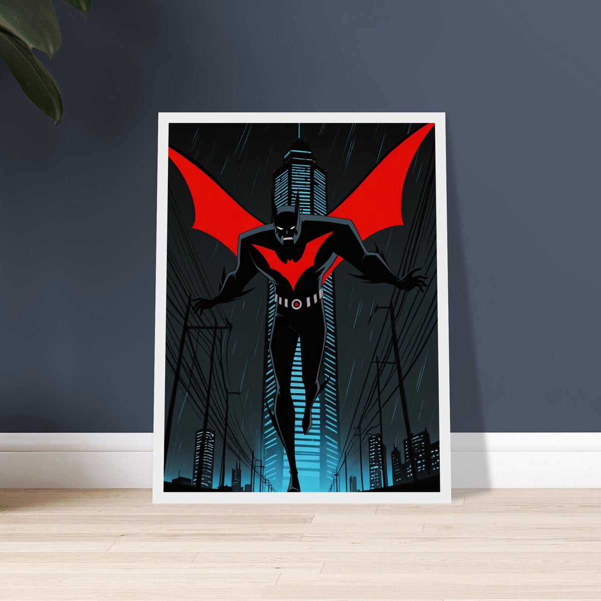 From above, Batman Beyond descends—Terry McGinnis moving through the air on wings of crimson light, the city’s neon reflecting off a suit engineered for speed, stealth, and survival. The black armor absorbs the darkness, while the red bat emblem burns sharply against it, a modern signal inherited from a legend who once ruled the night.