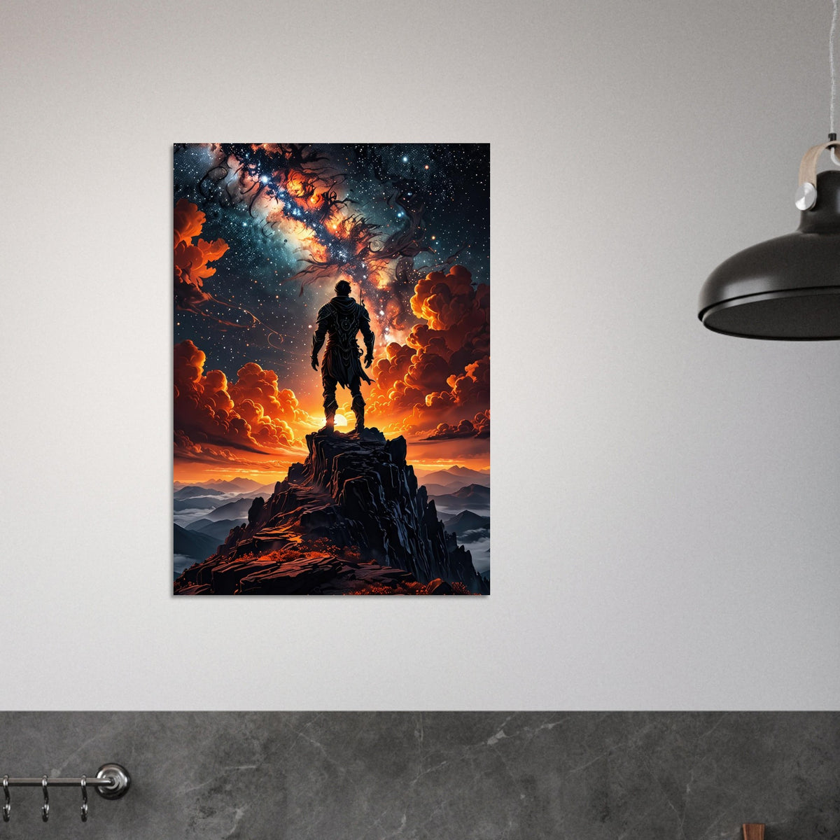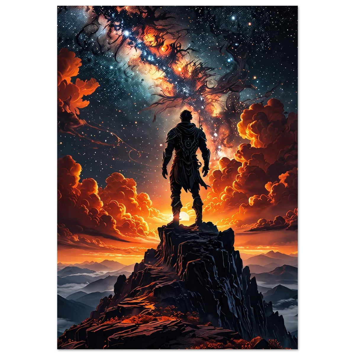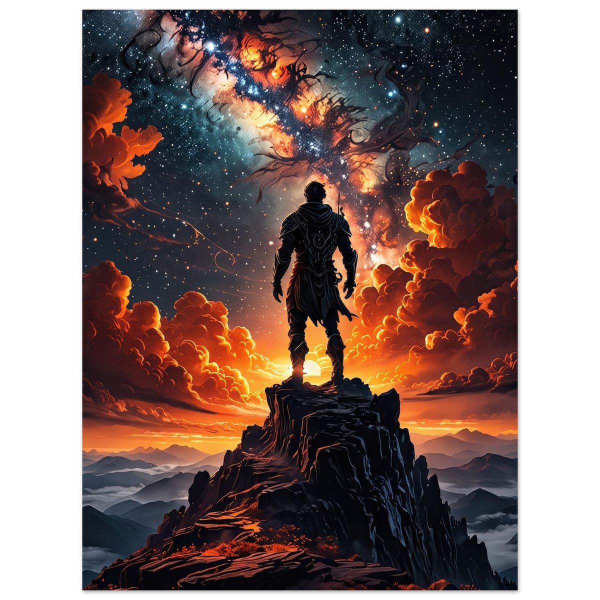 Alone upon a jagged outcrop, the Warden stands before a vast celestial portal pulsing with radiant light. Its edges dissolve into the star-filled expanse beyond, bleeding seamlessly into distant realms untouched by mortal hands. The gateway does not simply open—it breathes, alive with cosmic energy and infinite possibility.