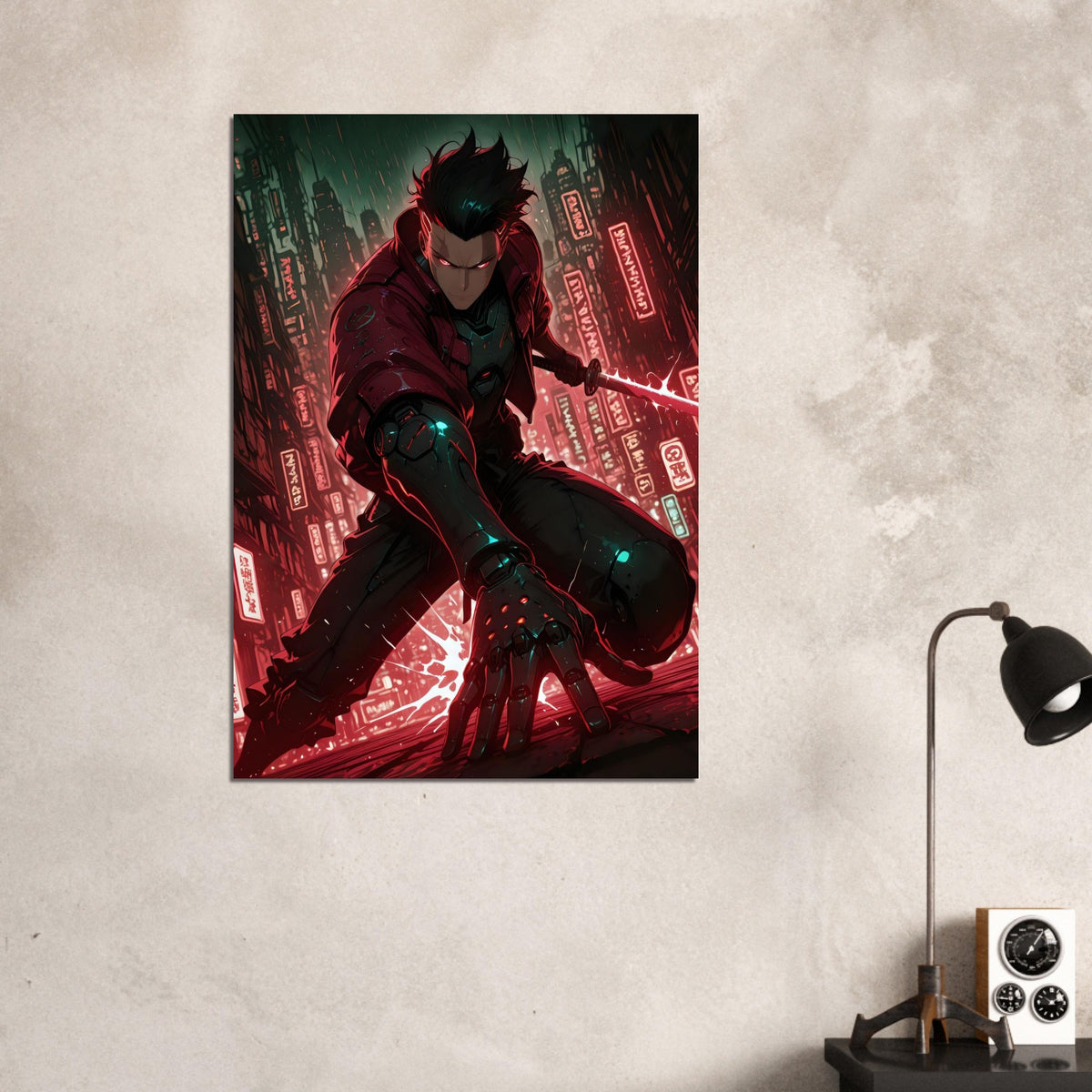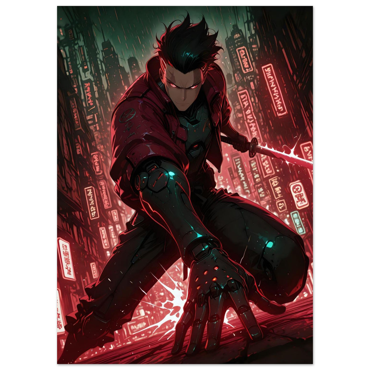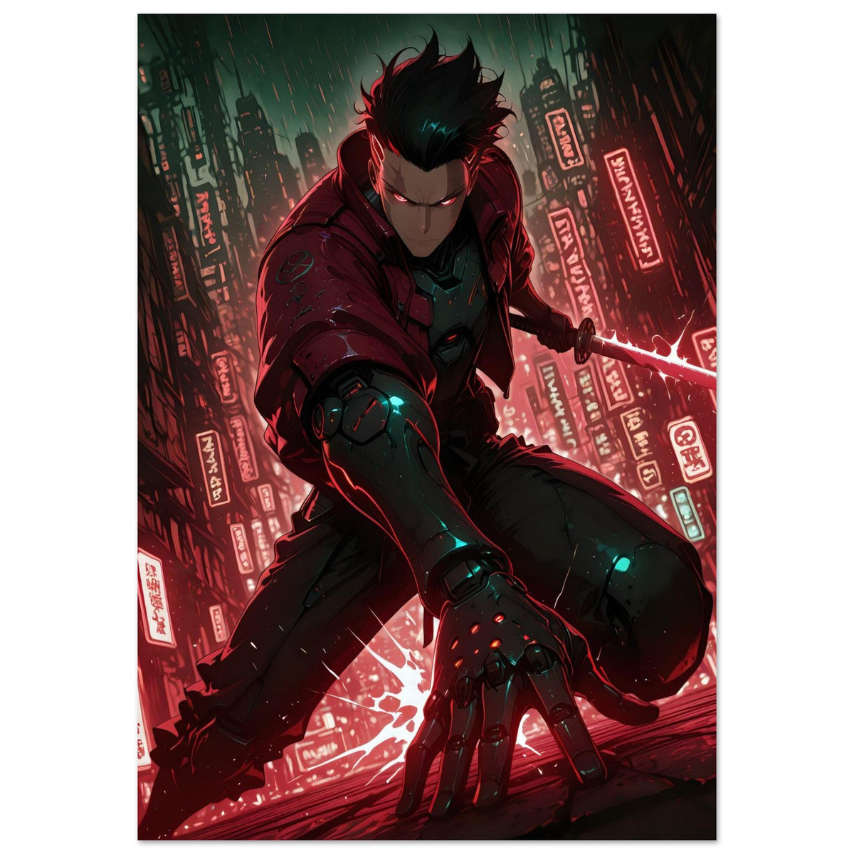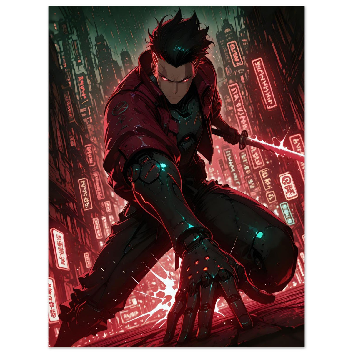 The city is vast, loud, merciless, but here—at street level—everything narrows to instinct and intent. He stands between eras: the discipline of the blade carried forward into a world of circuitry, surveillance, and endless light.